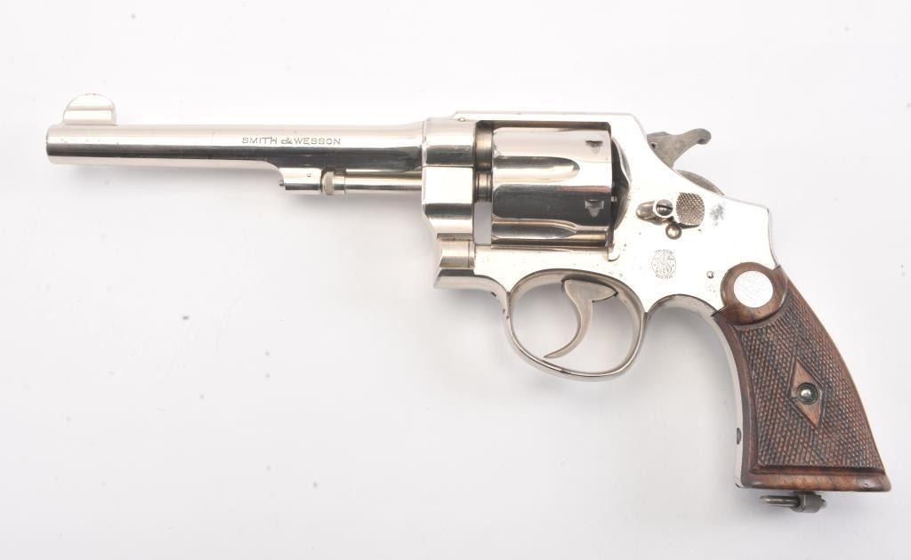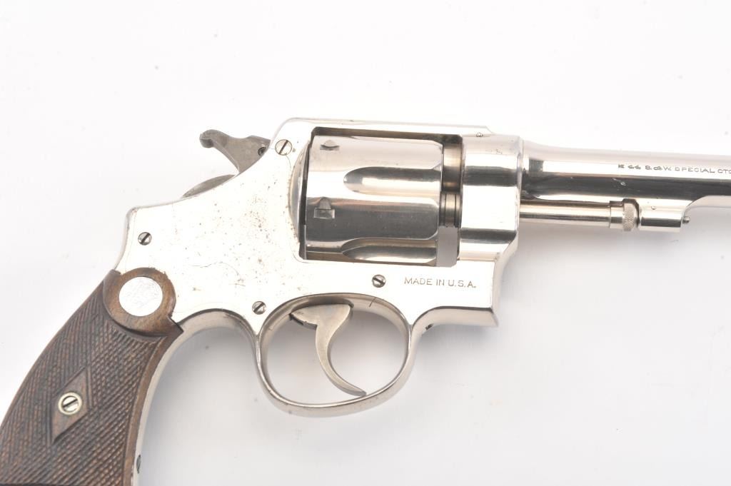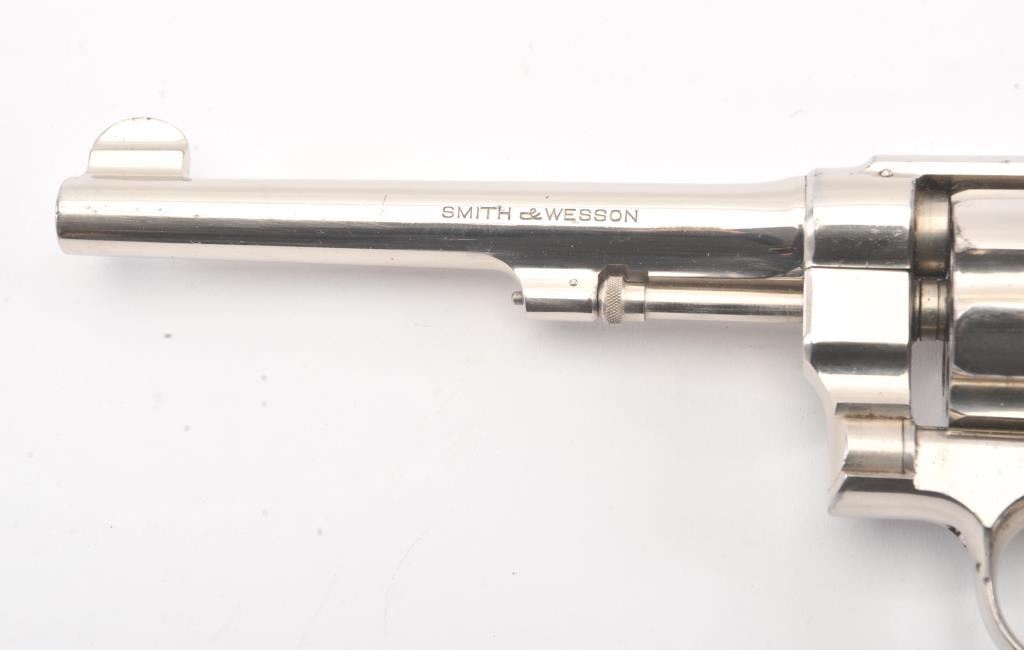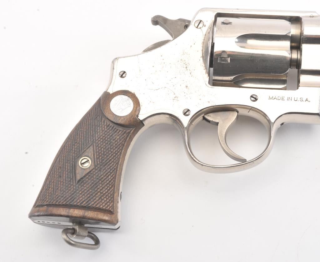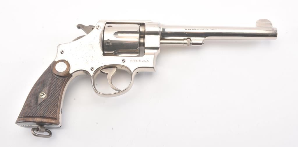 Smith & Wesson .44 Hand Ejector Second Model Double Action Revolver, #25005, .44 S& W Spec. cal., 6.5'' pinned barrel, nickel finish, factory diamond checkered walnut grips with large silver S& W medallions (serial numberedto the gun), lanyard loop. Condition is very good overall showing approx. 95% original nickel with some wear spots, minor pitting and scratches to the nickel finish. Sharp markings. Grips are fine with cleancheckering and only minor scratches to the bottom edge. Hammer and trigger retain their bright case colors. Action is crisp, bore is excellent. (C& R/PPT) Factory letter found for this gun Est.: $1,200-$1,800.