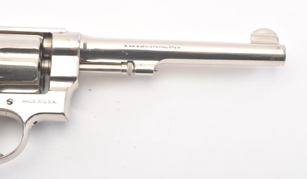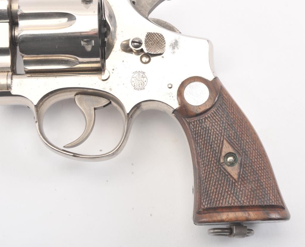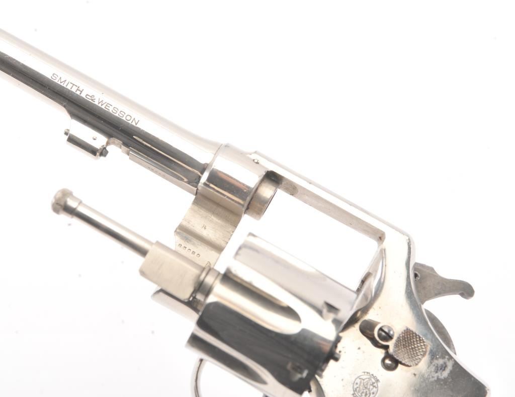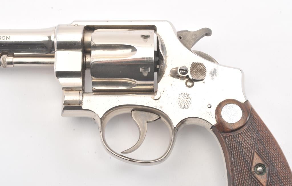 Smith & Wesson .44 Hand Ejector Second Model Double Action Revolver, #25005, .44 S& W Spec. cal., 6.5'' pinned barrel, nickel finish, factory diamond checkered walnut grips with large silver S& W medallions (serial numberedto the gun), lanyard loop. Condition is very good overall showing approx. 95% original nickel with some wear spots, minor pitting and scratches to the nickel finish. Sharp markings. Grips are fine with cleancheckering and only minor scratches to the bottom edge. Hammer and trigger retain their bright case colors. Action is crisp, bore is excellent. (C& R/PPT) Factory letter found for this gun Est.: $1,200-$1,800.