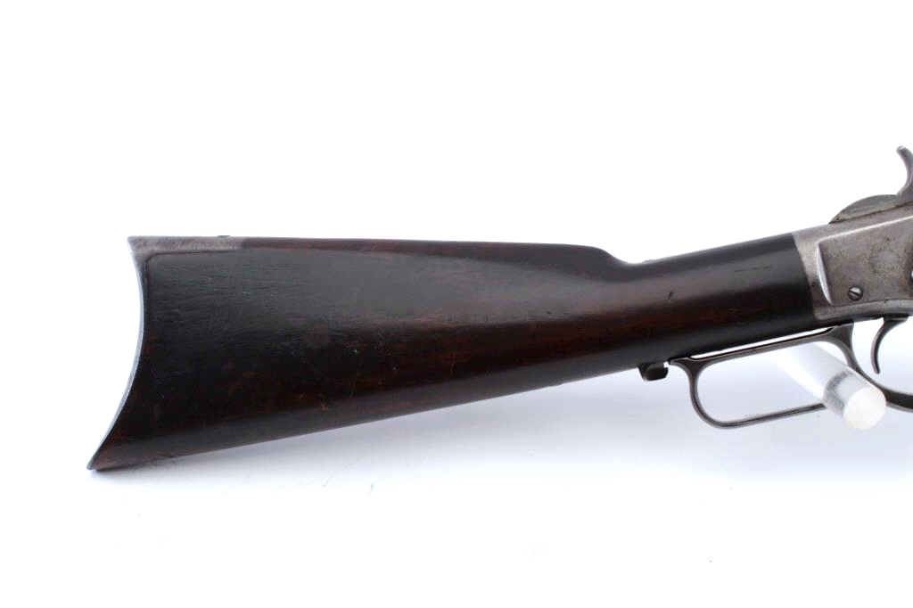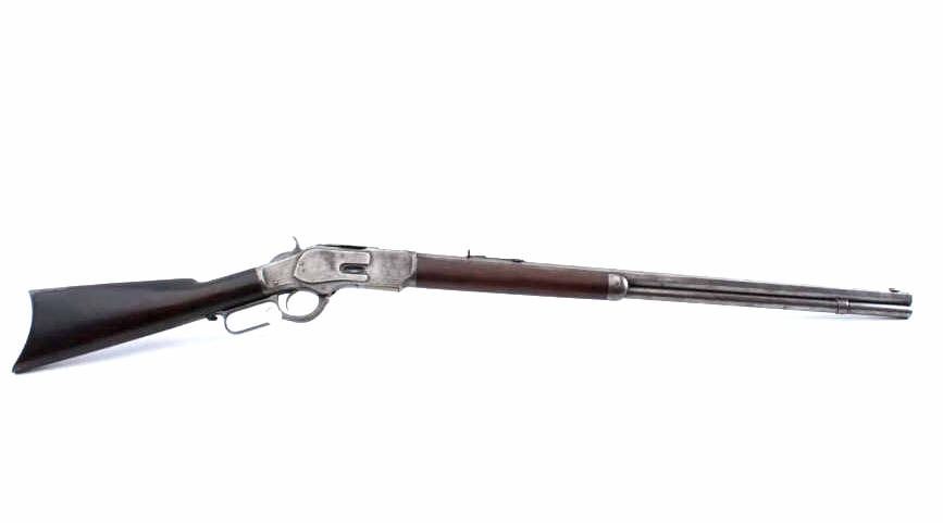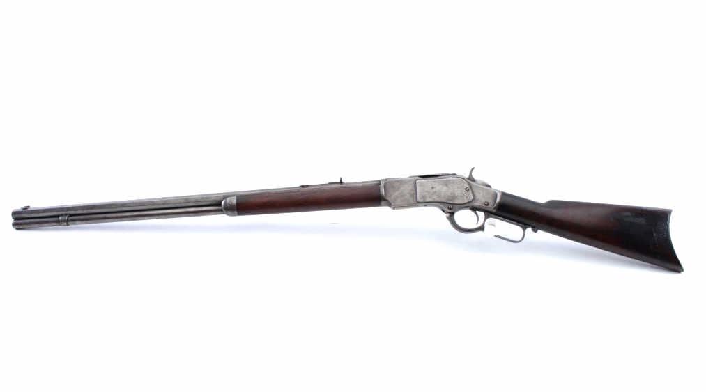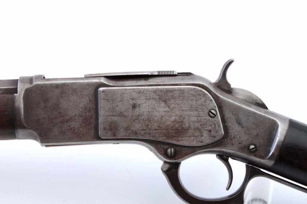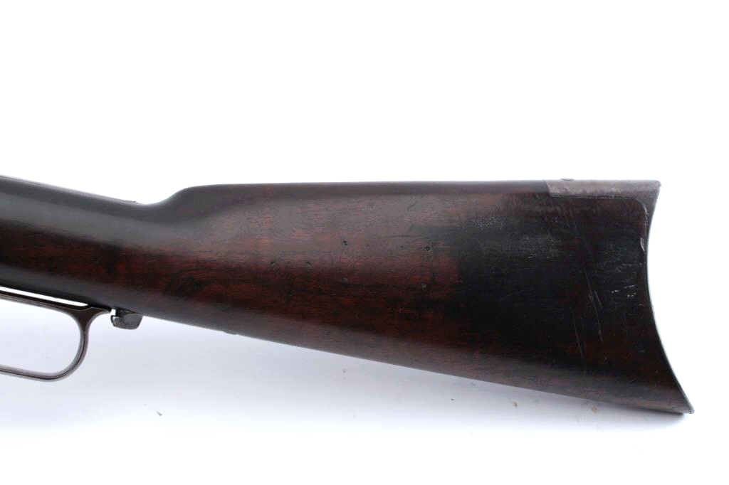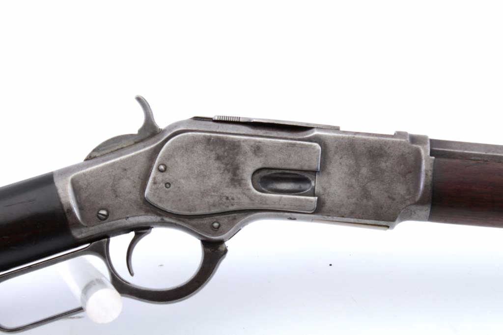 Winchester Model 1873 3rd Model lever action rifle, .38-40 WCF caliber, Serial #346569B. The rifle is in good overall condition with a 26” octagon barrel and full-length magazine. The barrel and magazine have gone to asilver patina with areas of light surface rust. The receiver is a grey/brown patina with dull blue still evident on the loading gate. The dust cover is intact and the caliber marking is still partially legible on the brass elevator. The hammer and lever still display dull case hardening in the protected areas. The smooth wood stocks are in good condition with mars and compressions consistent with carry and use. The buttstock shows darkening from exposure to smoke, maybe campfire, fireplace etc. The left side has four small holes where an old plaque or escutcheon style plate was removed. The butt stock ends with a brass crescent buttplate with trap. The bore is fair, the action is crisp and the markings are sharp on this desirable Winchester, circa 1890. Est.: $900-$1,800. (Antique).