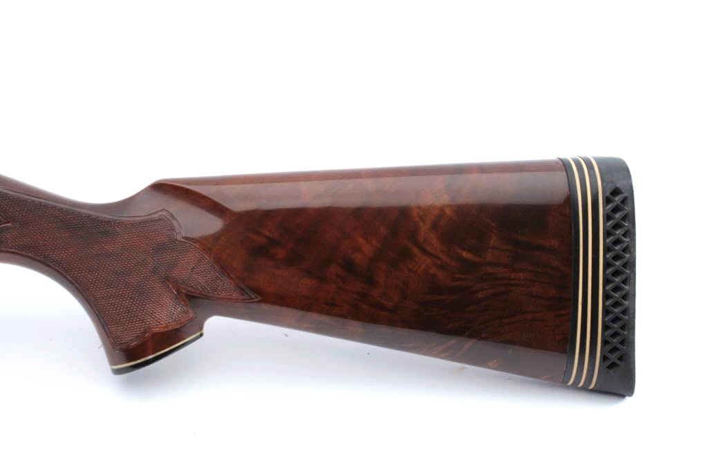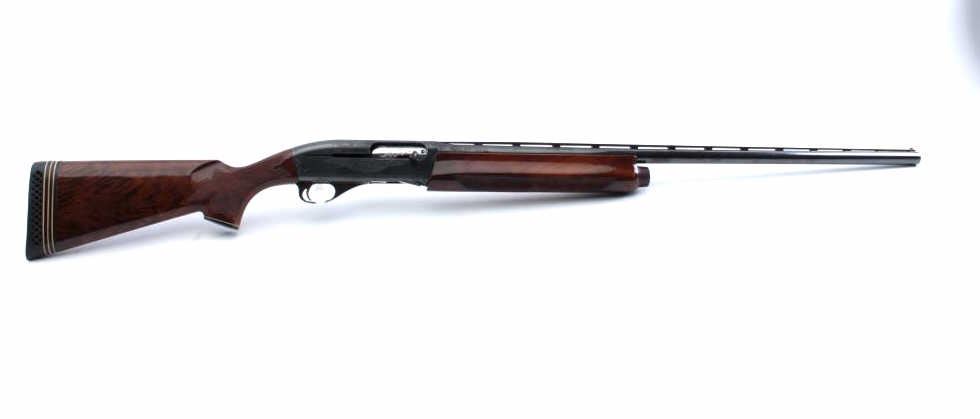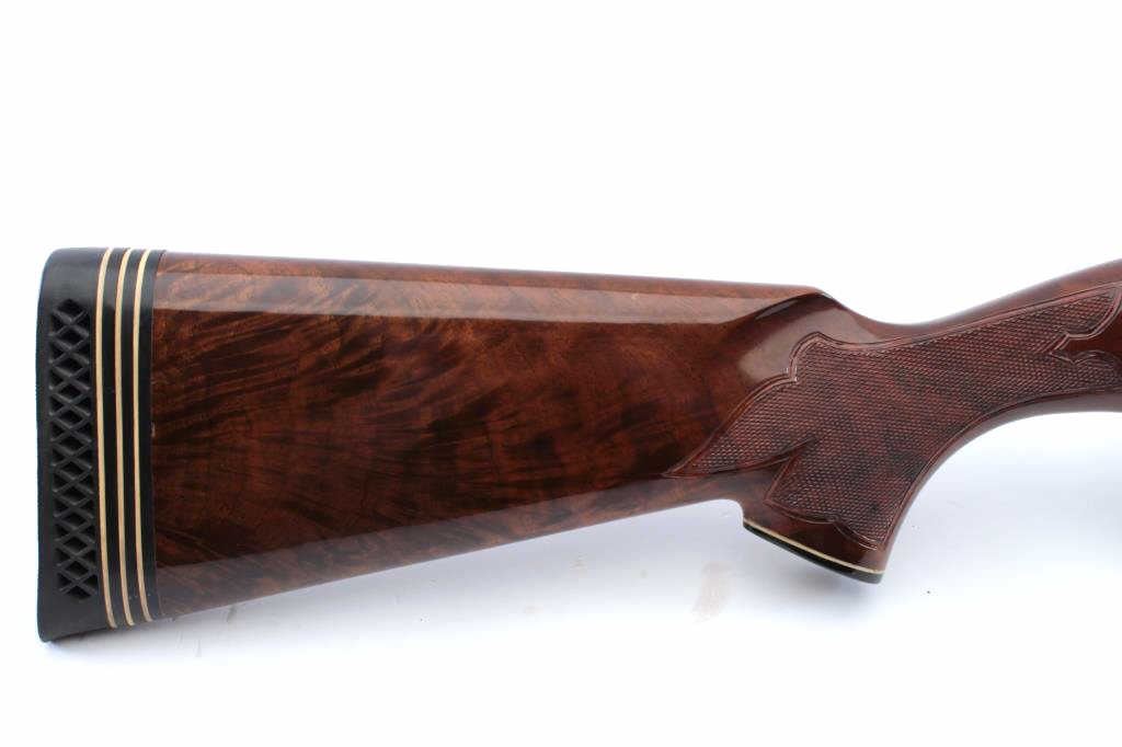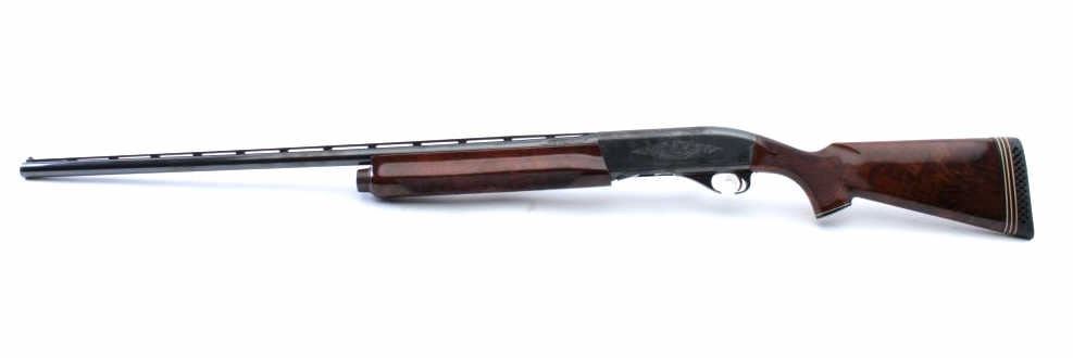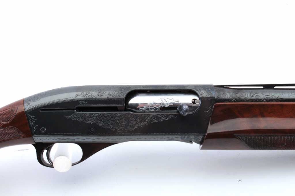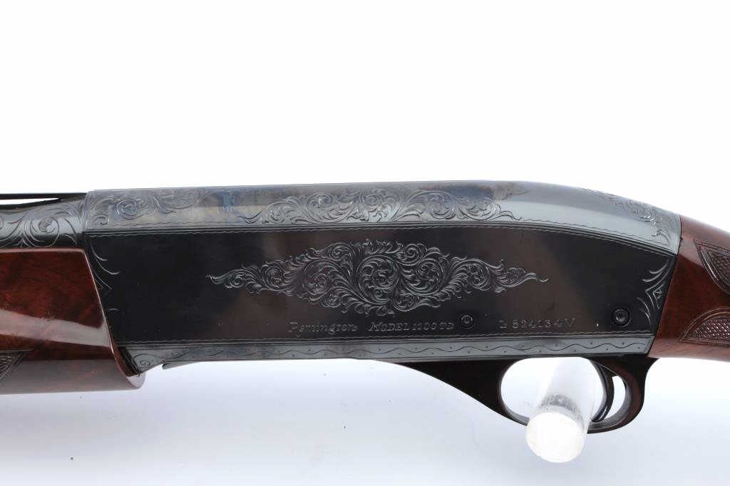 Factory engraved Remington Model 1100TD semi automatic shotgun, #L824134V, 12 Ga, 2 3/4" chamber, 30" vent rib barrel, full choked, ivory bead front sight, deluxe walnut hand checkered stock with rubber recoil pad.Shotgun is in fine condition overall, retaining over 98% original blue, with minor scratches, some light freckling on the right side of the receiver behind the ejecton port. Beautifully scroll engraved on the receiver and onto the rear portion of the barrel, with hand engraved make model and serial number. Bore is very good, action is very good. The stock is a beautiful fancy walnut, the checkering is crisp, there is lightdings and scratches, but no chips cracks or losses. Length of pull is 14 3/8 to the end of the pad, 13" to the end of the wood. (Modern) Est. $900-1800