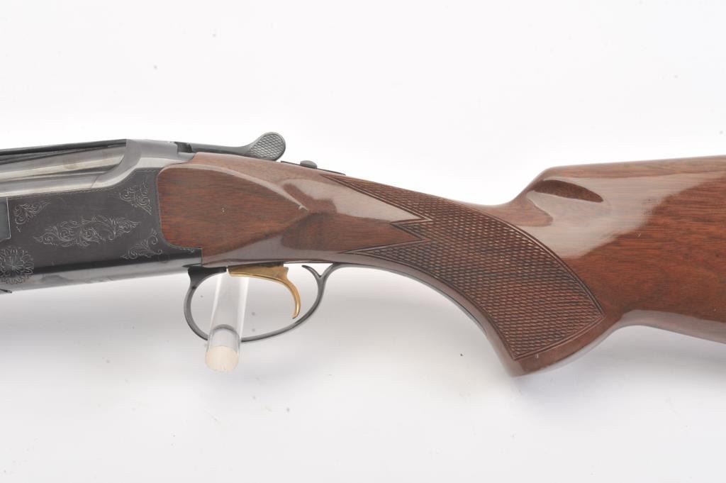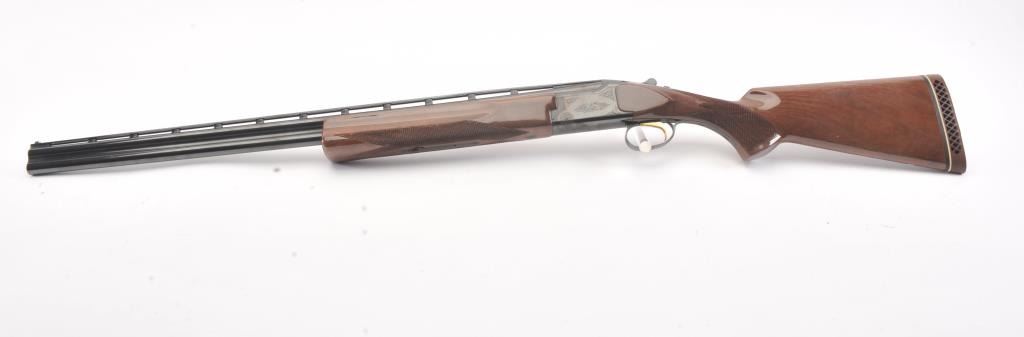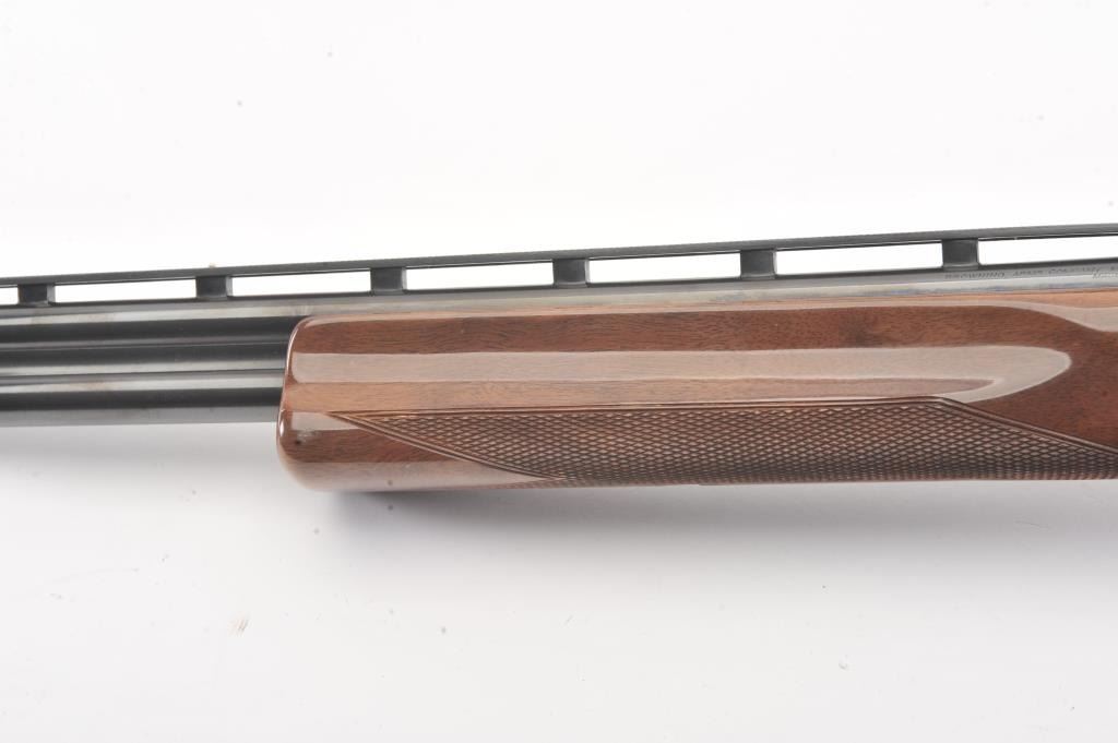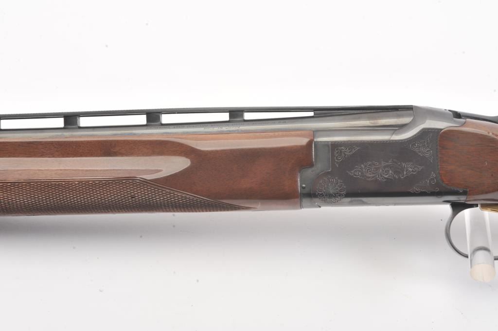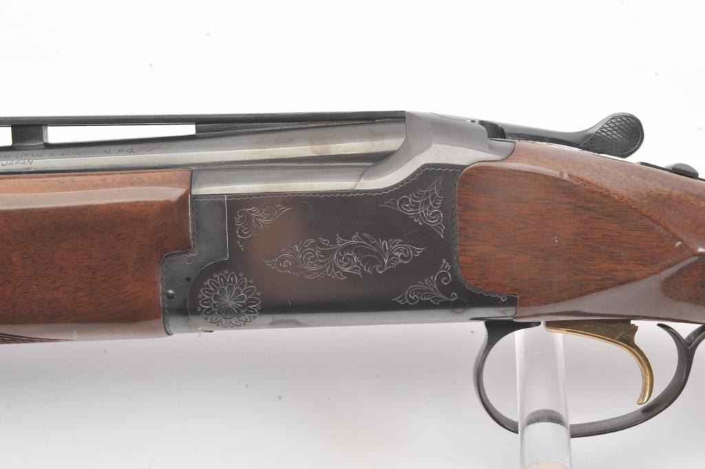 Browning Citori O/U shotgun, #07169PY1E3, 28 Ga., 28" high vent rib barrels, with matte rib, ivory bead front sight, blued finish, engraved receiver, with checkered walnut stock. Shotgun is in fine condition overall, retaining 98%+ original blue, and sharp markings. Bores are good, choked skeet / skeet, action is good. Wood is very good, with crisp checkering, minor chips, dings and scratches, finish is somewhat milky inappearance. Length of pull is14 1/4", 13 1/4" to the end of the wood. (Modern) Est. $900-1800