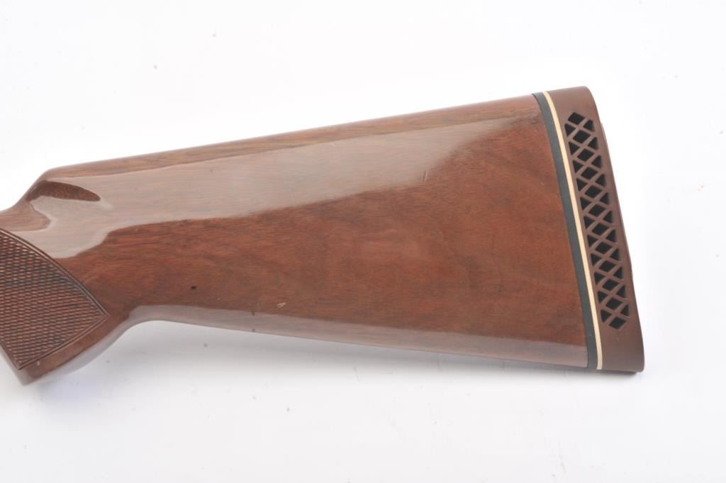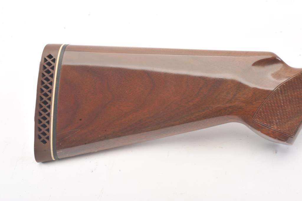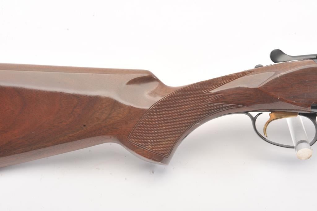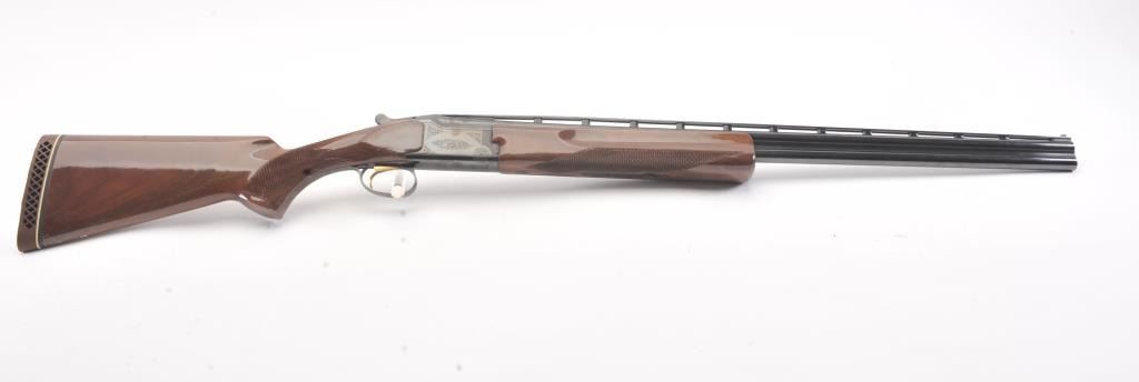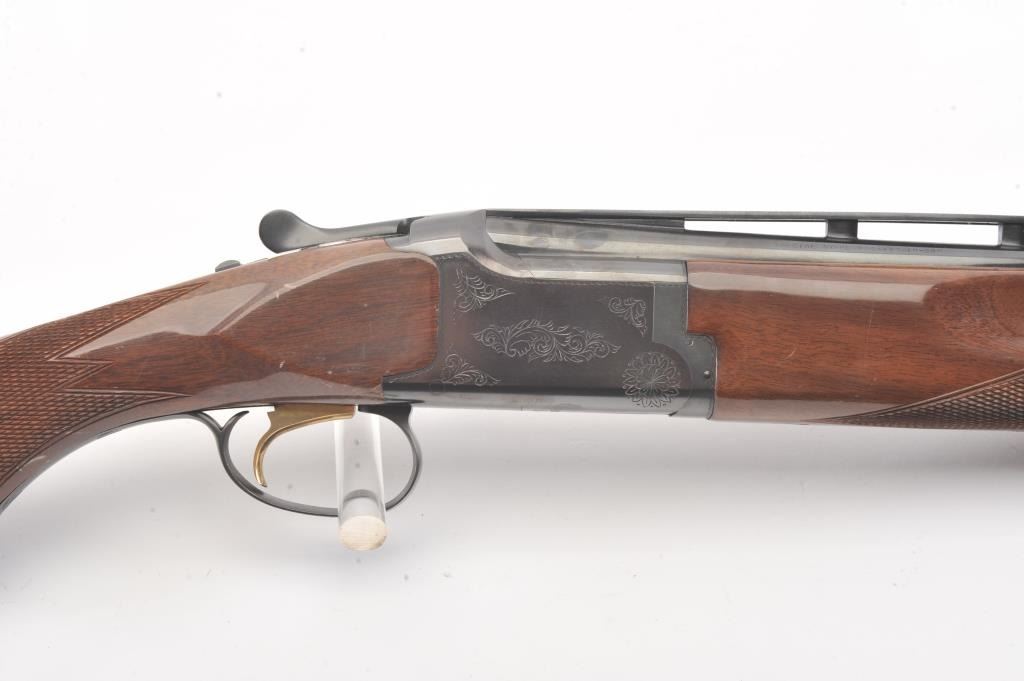 Browning Citori O/U shotgun, #07169PY1E3, 28 Ga., 28" high vent rib barrels, with matte rib, ivory bead front sight, blued finish, engraved receiver, with checkered walnut stock. Shotgun is in fine condition overall, retaining 98%+ original blue, and sharp markings. Bores are good, choked skeet / skeet, action is good. Wood is very good, with crisp checkering, minor chips, dings and scratches, finish is somewhat milky inappearance. Length of pull is14 1/4", 13 1/4" to the end of the wood. (Modern) Est. $900-1800