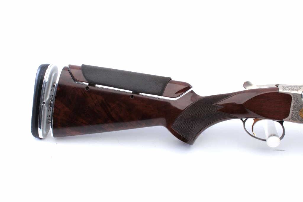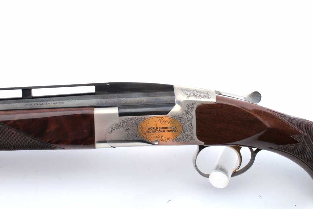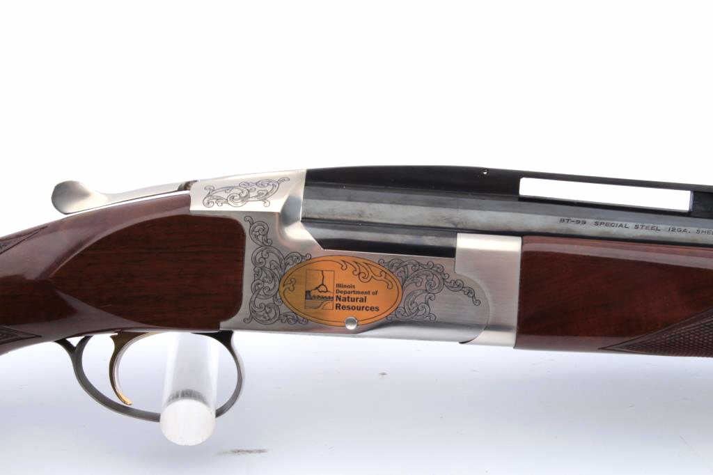 Browning BT-99 Illinois Department of Natural Resources / World Shooting & Recreational Complex Limited Edition engraved shotgun, #DIR0015WSC, 12 Ga., blued with coin finished receiver, 34" barrel with a dual white beadsight on the matte, vent rib on the ported barrel with standard markings, 2 3/4 inch chamber and threaded for removable choke tubes (improved/modified installed). The right side of the receiver is marked with agold highlighted Illinois Department of Natural Resources logo and the left shows the logo for the World Shooting & Recreational Complex in Sparta, Illinois also highlighted in gold. The bottom of the receiver shows agold plaque WSRC-DE 15 of 15. Mounted on a nicely figured, high gloss, multi-point checkered beavertail forearm and pistol grip stock with adjustable comb and vented Browning recoil pad. Length of pull is 14 1/4 inches. Condition is excellent with 99% original finish, showing only light handling marks. The wood is excellent. Mechanically excellent. TIncludes a leatherette Browning takedown case with two extra choke tubes,