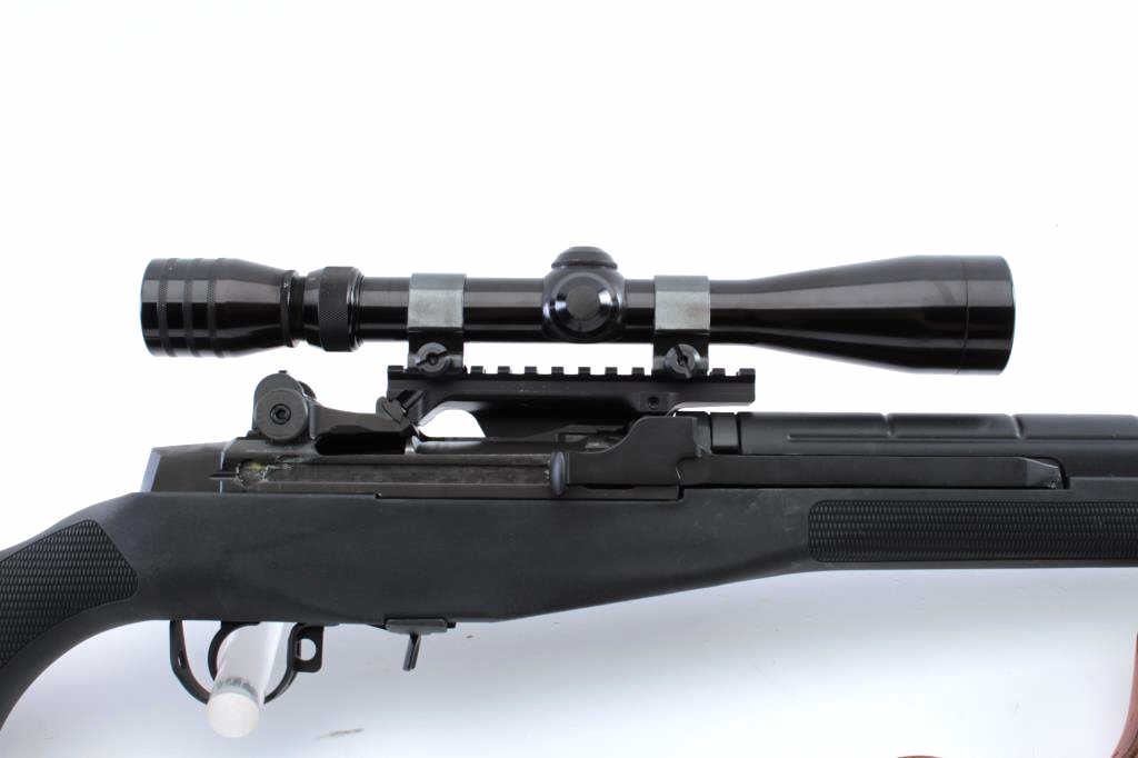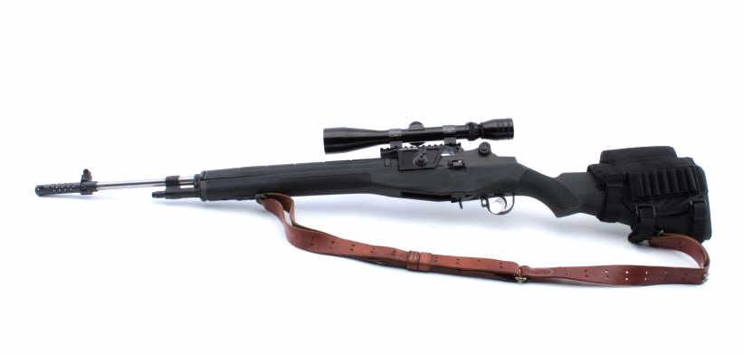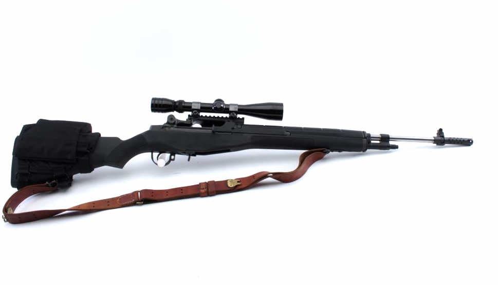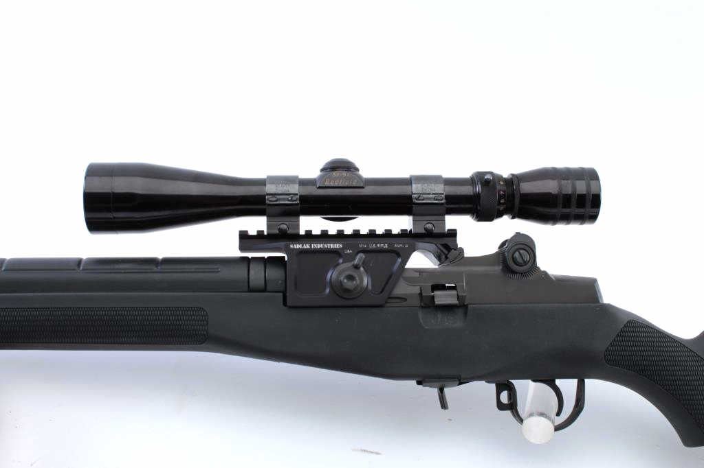 Springfield M1-A Loaded, semi automatic variant of the M14 battle rifle, #426996, 7.62x51mm Nato, stainless steel 22" NM barrel, muzzle break, shrouded NM .062" blade front sight, adjustable aperture rear sight, match tuned two stage trigger, matte blued finished receiver, manual safety, no magazine, adjustable gas system, sling swivels, black finished synthetic handguard and pistol grip shoulder stock with rubberrecoil pad, nylon cheek piece, leather sling, Sadlak Industries scope mount with Redfield 3x-9x scope. Rifle retains approximately 97% of it's original finish showing light wear and few scattered handling marks. Action issmooth, the bore is pristine, and the synthetic stock is near fine with a few spots of wear. Condition is near excellent overall. Includes a black nylon Springfield Armory carrying case/drag bag. (Modern/PPT) Est. $800-1600