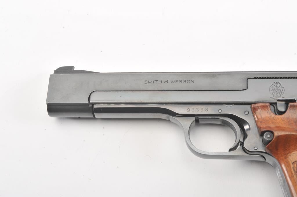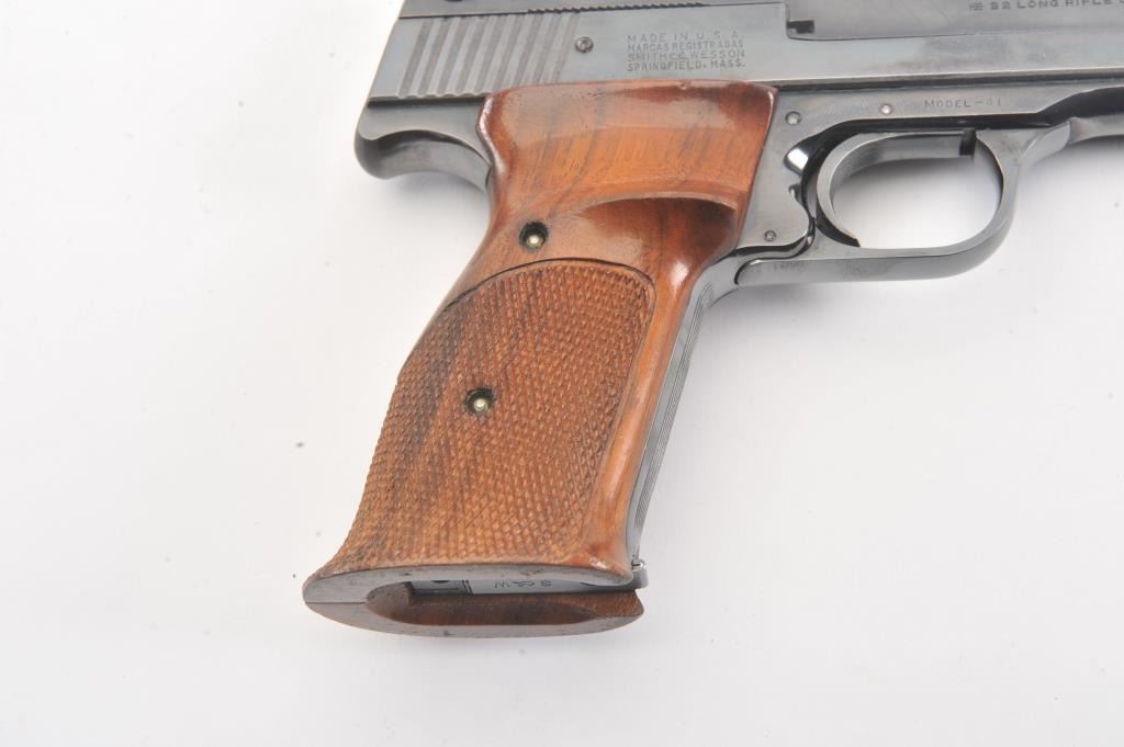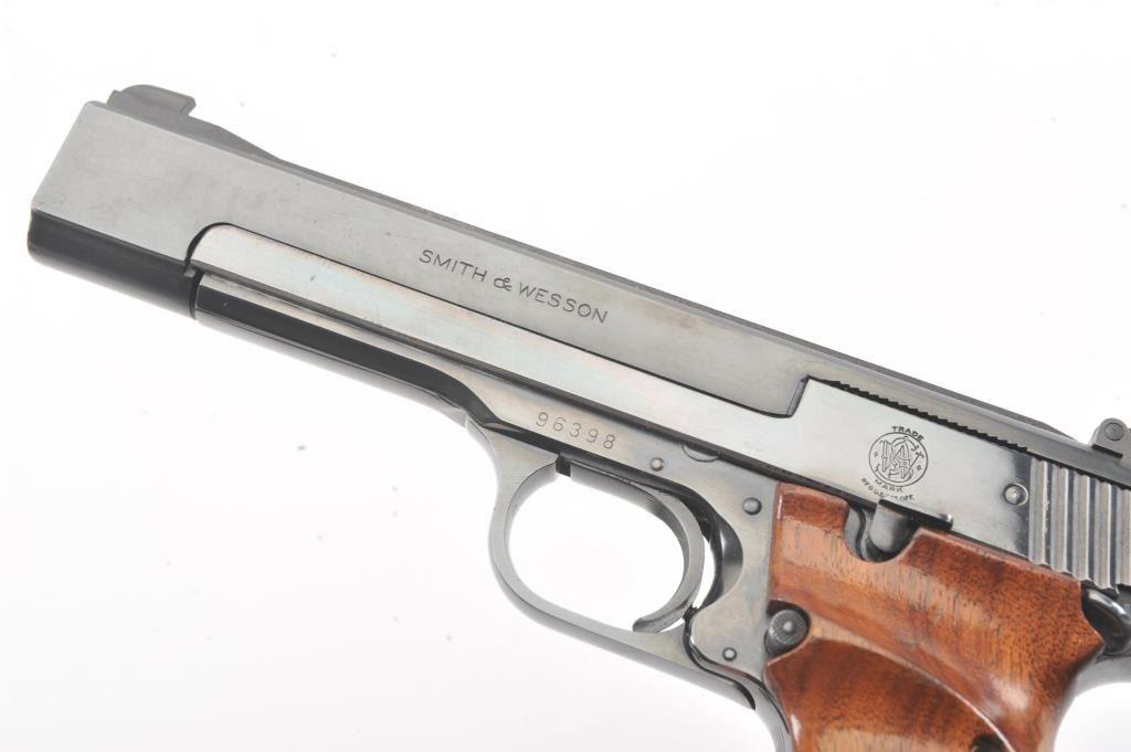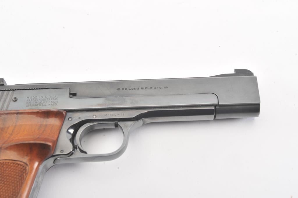 Smith & Wesson Model 41 Target pistol, #96398, .22 LR cal., 5 1/2" bull barrel, blued finish, adjustable sights, cocking indicator, with checkered thumb rest grips. The pistol remains in fine condition overall, retaining 97% original blue. The bore is bright with strong rifling, the action is good. These are excellent target pistols that are incredibly fun to shoot. Two correct 22 LR mags included. (C&R/PPT) Est.$700-1400