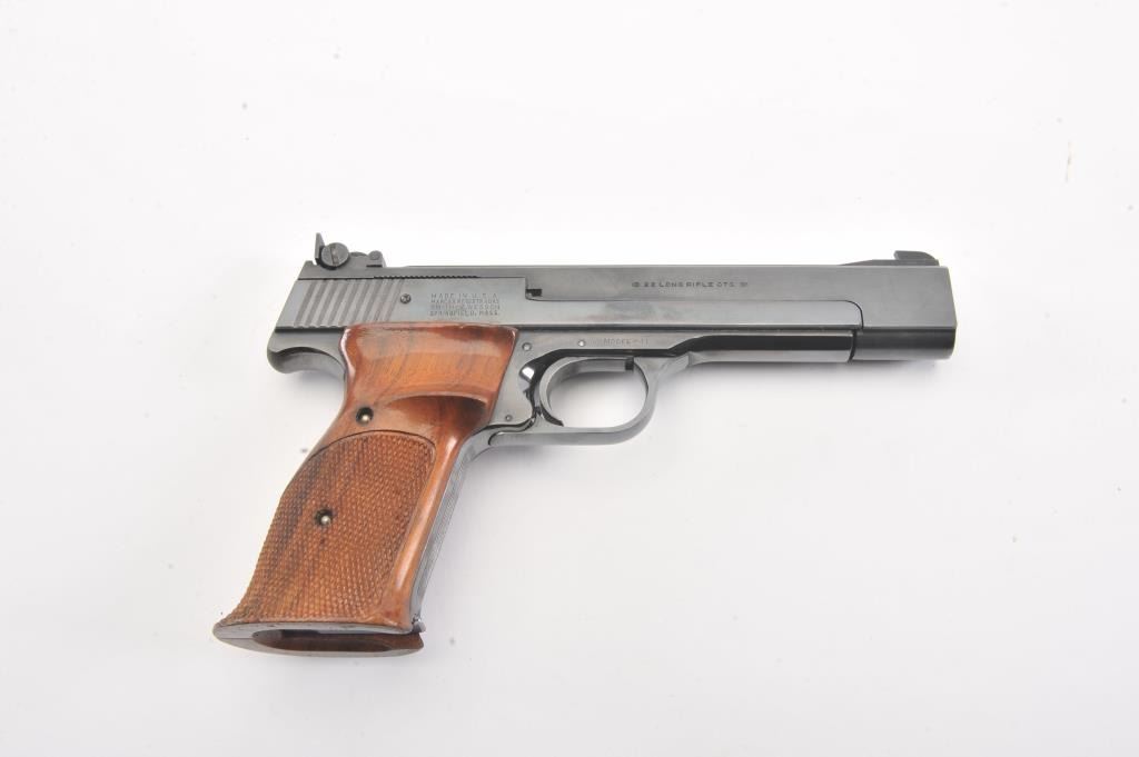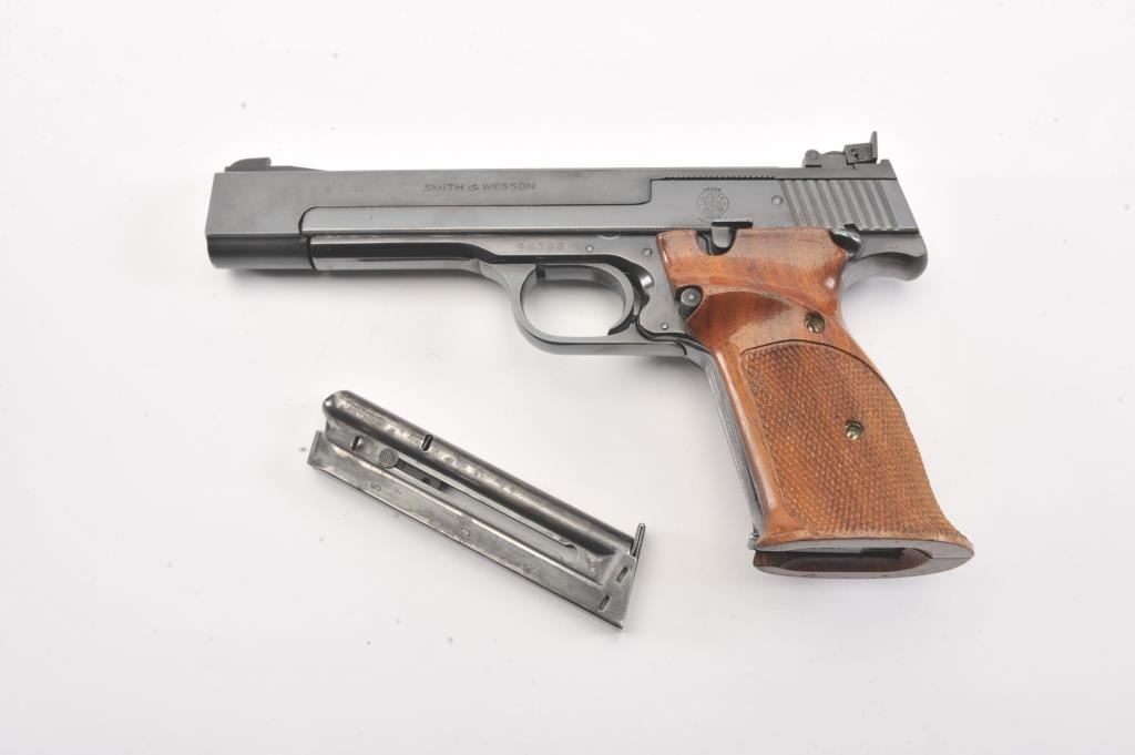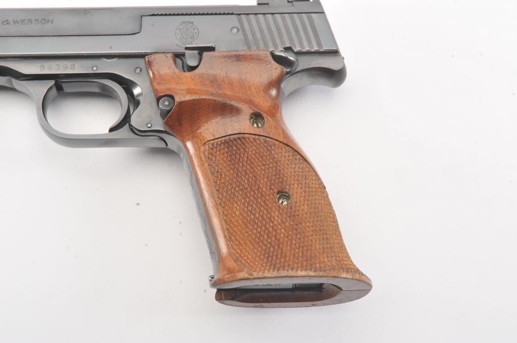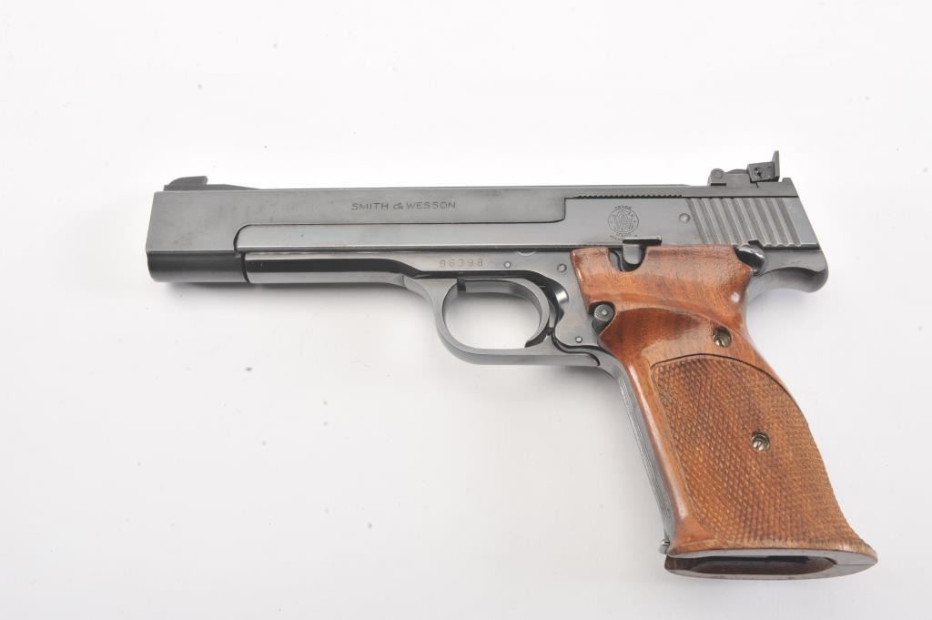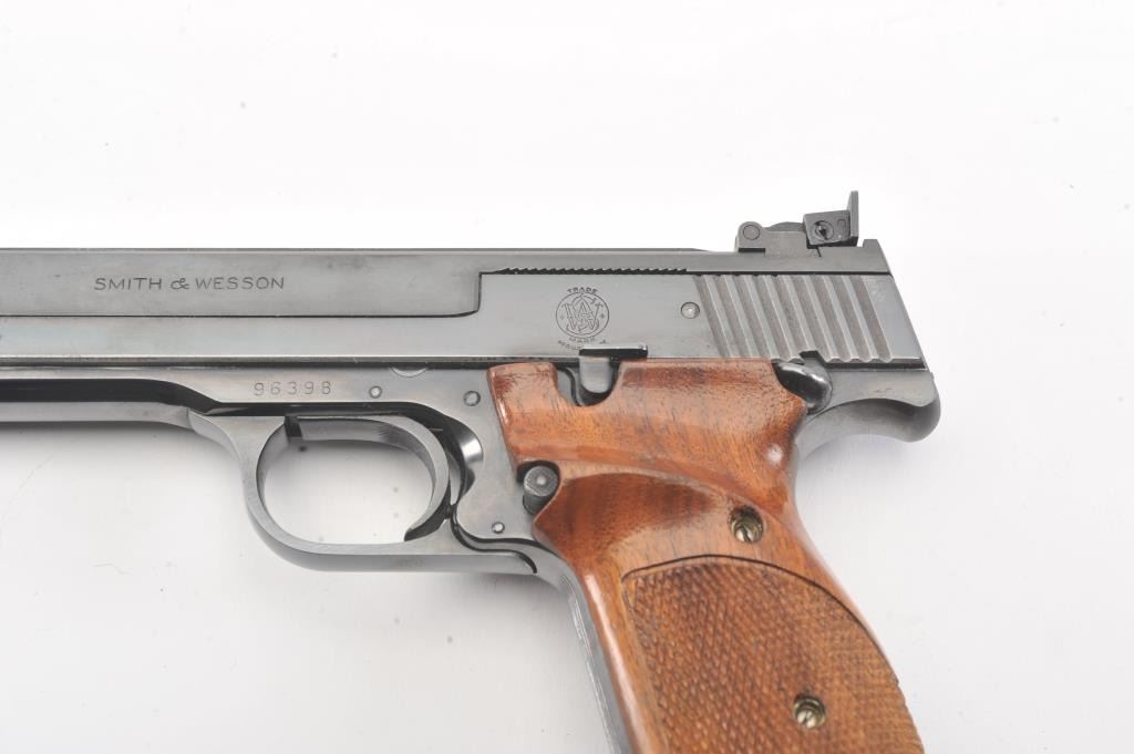 Smith & Wesson Model 41 Target pistol, #96398, .22 LR cal., 5 1/2" bull barrel, blued finish, adjustable sights, cocking indicator, with checkered thumb rest grips. The pistol remains in fine condition overall, retaining 97% original blue. The bore is bright with strong rifling, the action is good. These are excellent target pistols that are incredibly fun to shoot. Two correct 22 LR mags included. (C&R/PPT) Est.$700-1400