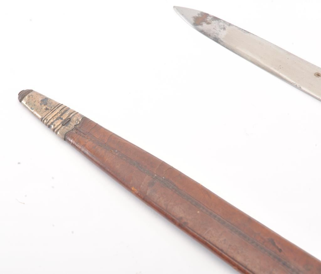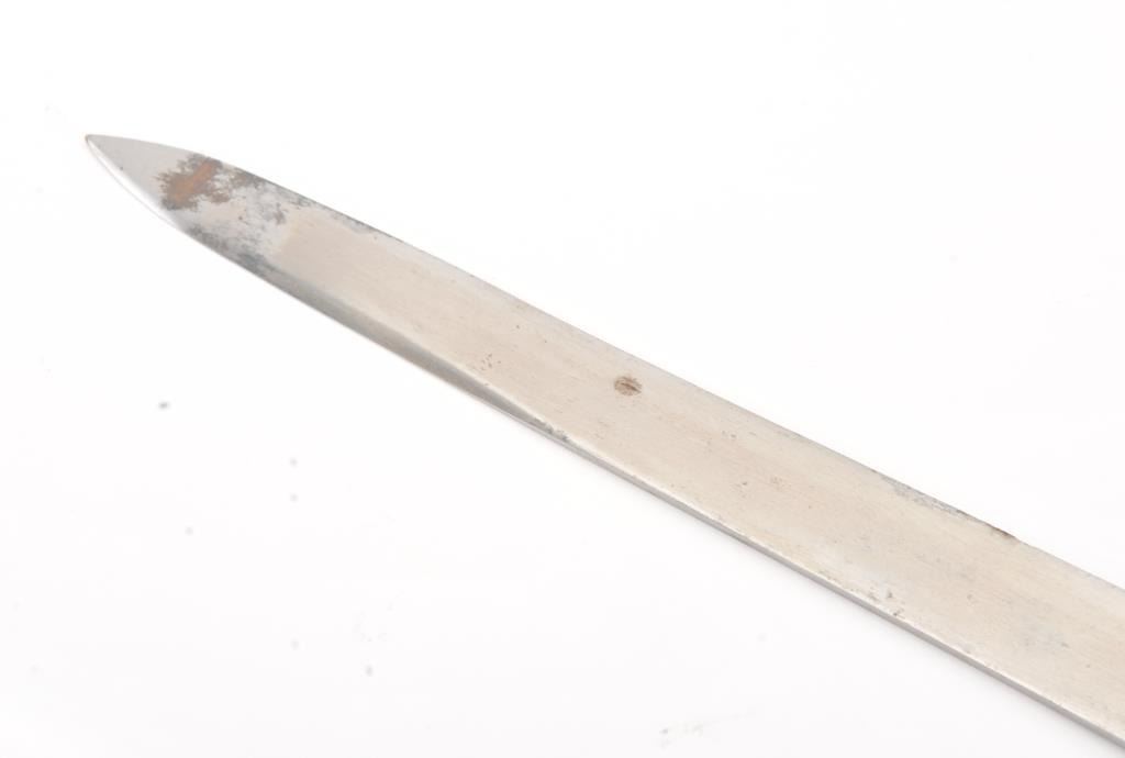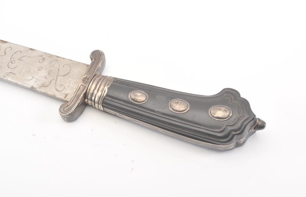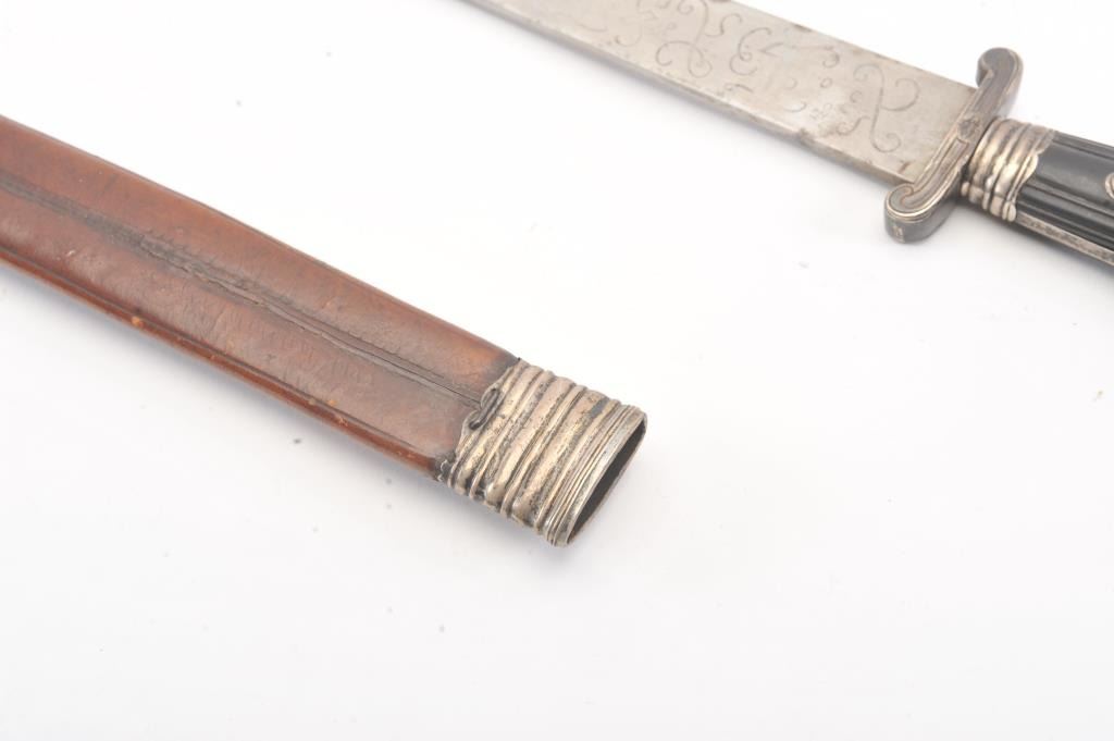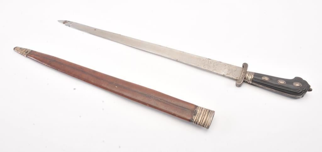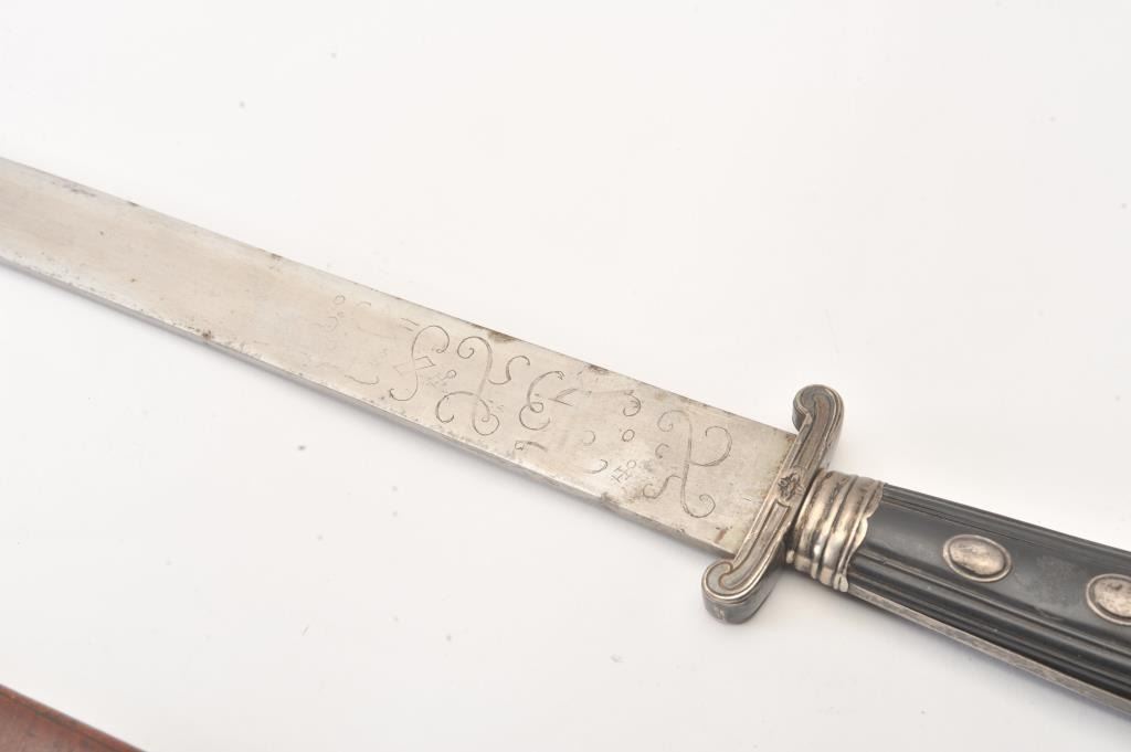 Silver mounted French style hunting sword circa late 18th to early 19th century with scabbard and ebony hilt. Measures 27 1/4" overall with a 21 1/2" blade. The blade shows odd designs that may be calligraphy and hasbeen lightly cleaned. Good to very good condition overall with exceptional scabbard for its age. Est.: $500-$1000