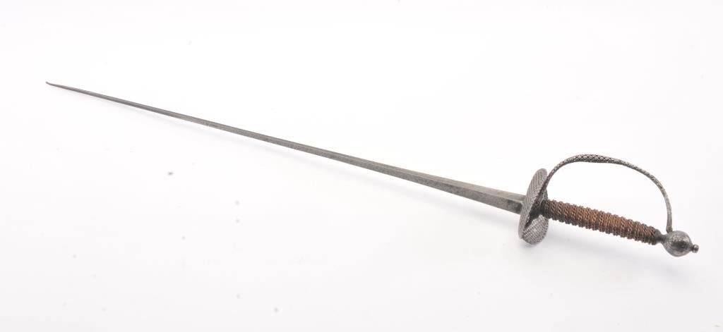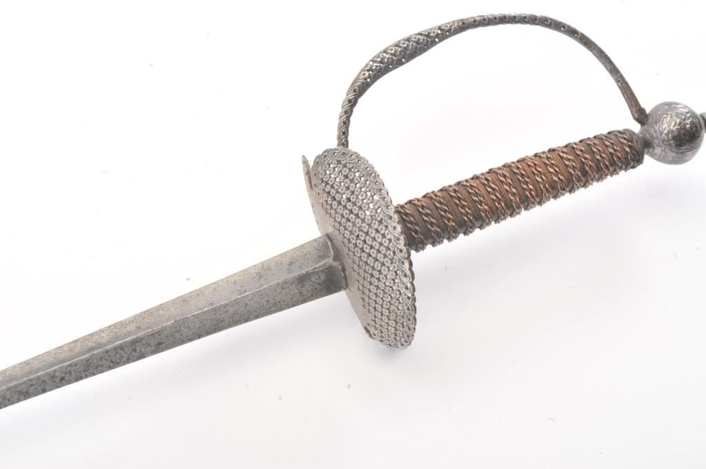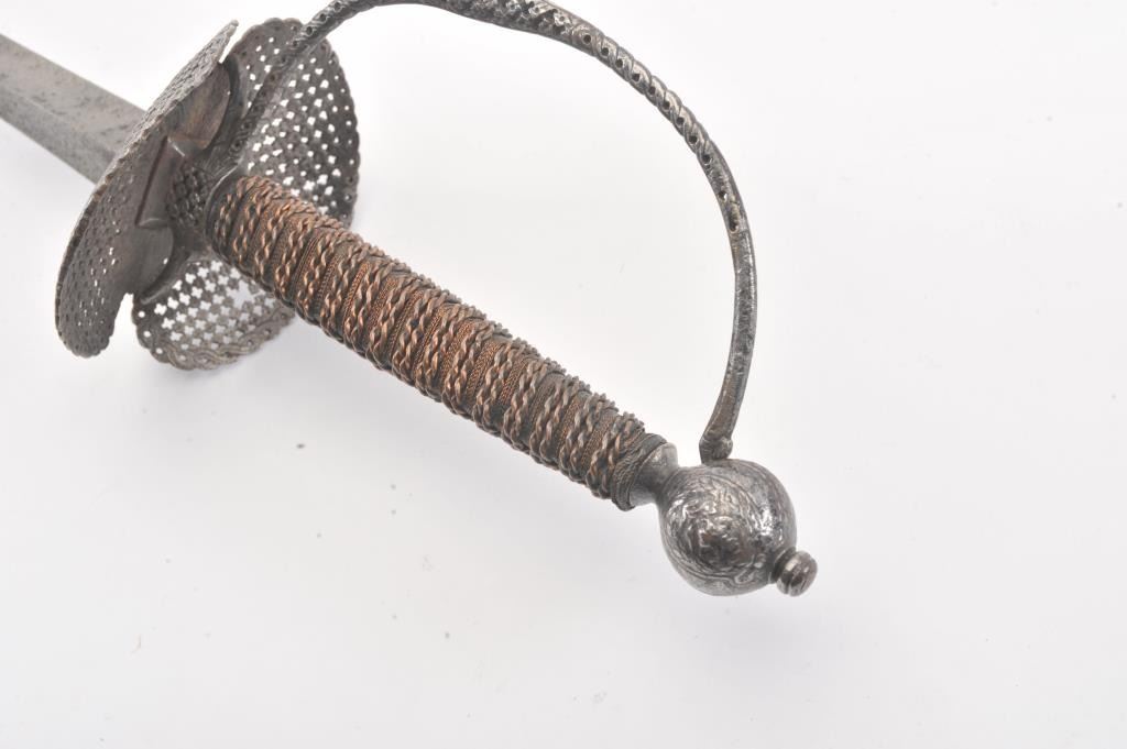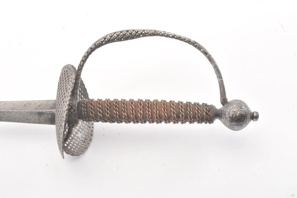 Early to Mid-18th century small sword with pierced iron decorated hilt and guard with copper wire wrapped grips. The guard shows a bend and small loss. Chemically cleaned metal. Measures 39" overall with a 31" blade. This was an expensive and high grade sword when made. Probably French or western germania. Est.: $300-$600
