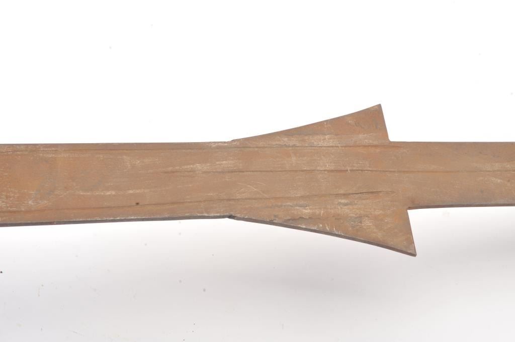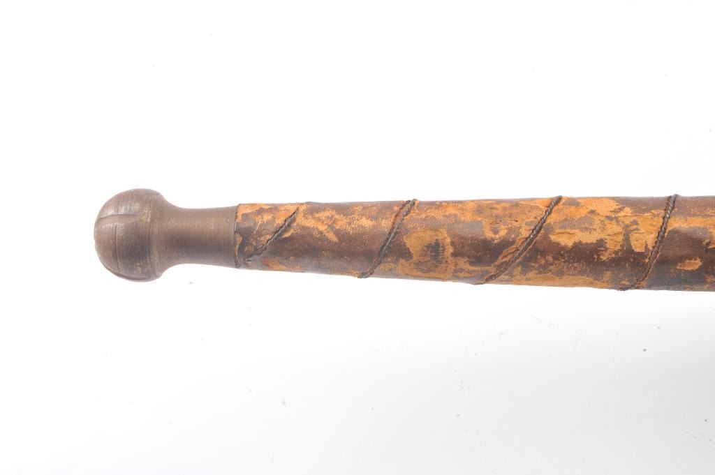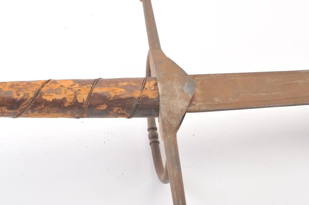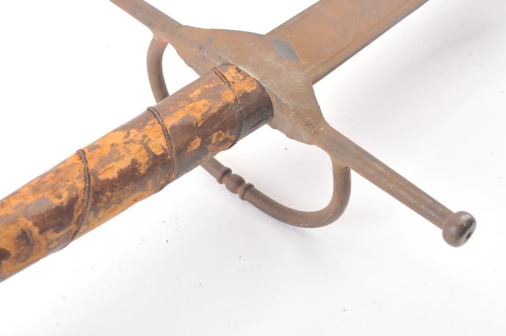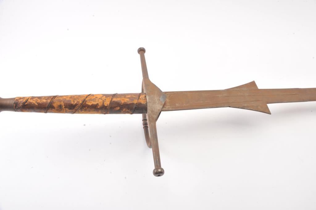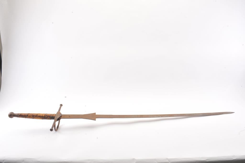 Victorian era two handed sword with well-made iron mounts and wire wrapped leather grip. Measures 70" overall with a 56" blade. Light coating of surface rust. Leather grips show tatters and losses. Large size pommel. In the mid to late 19th century Schmidt and other armourers re-created early arms to display in the castles and great halls of Europe and identical pieces as these are shown in many museums and displays. Est.: $500-$1000