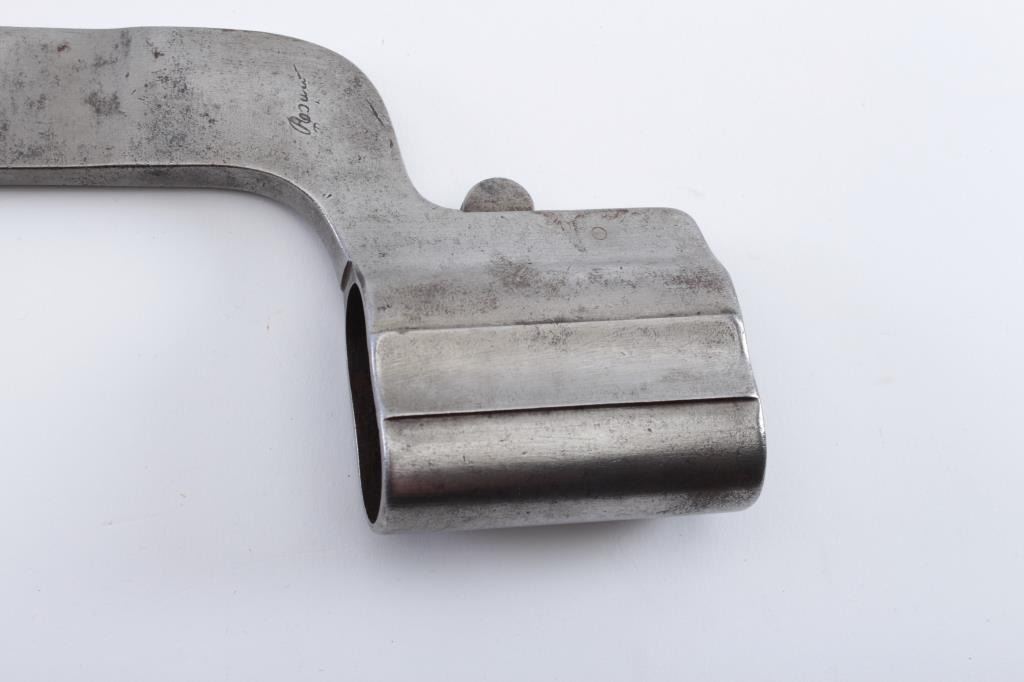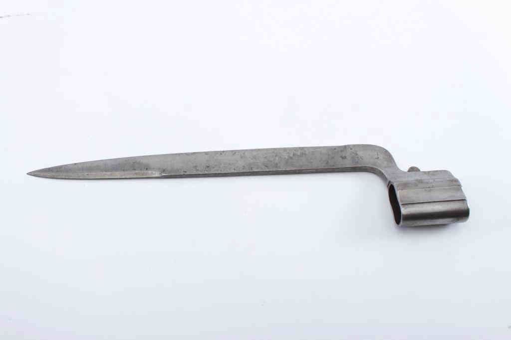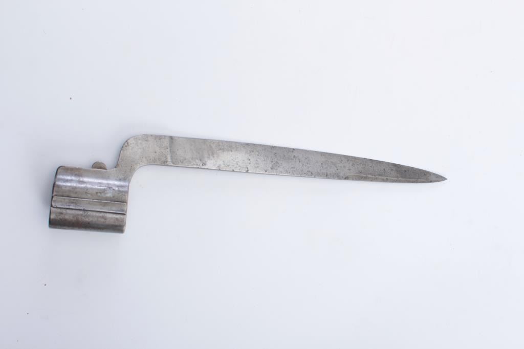 Corisican Voltigeur bayonet from early 19th century. Fits O/U flintlock carbine issue to special regiments. Measures 15" overall with a 13 1/4" blade. Good condition with minor pitting. We have had 2 in over 50 years asthey are rare. (Only thing rarier is the gun!). Est.: $300-$600