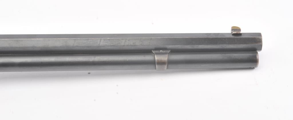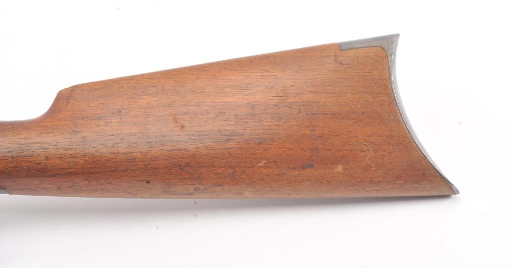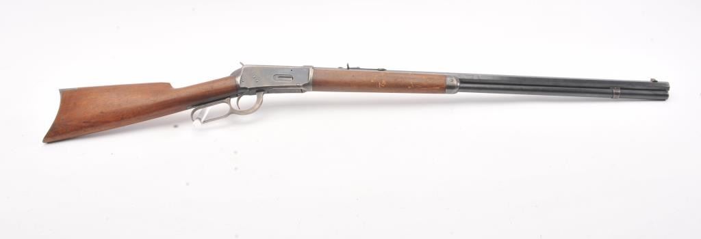 Winchester Model 1894, #124643, .25-35 WCF cal., 26" octagon barrel, full mag, buckhorn sights, with crescent butt. Rifle is in fine condition overall, retaining approximately 95% original finish, with approximately 90%blue remaining on the frame. The wood is fair to good, with multiple mars on the forend, some deep, the stock is very good. The bore is very good, bright with good rifling, some minor corrosion. The action is good. Manufatured in 1898. (Antique) Est. $600-1200