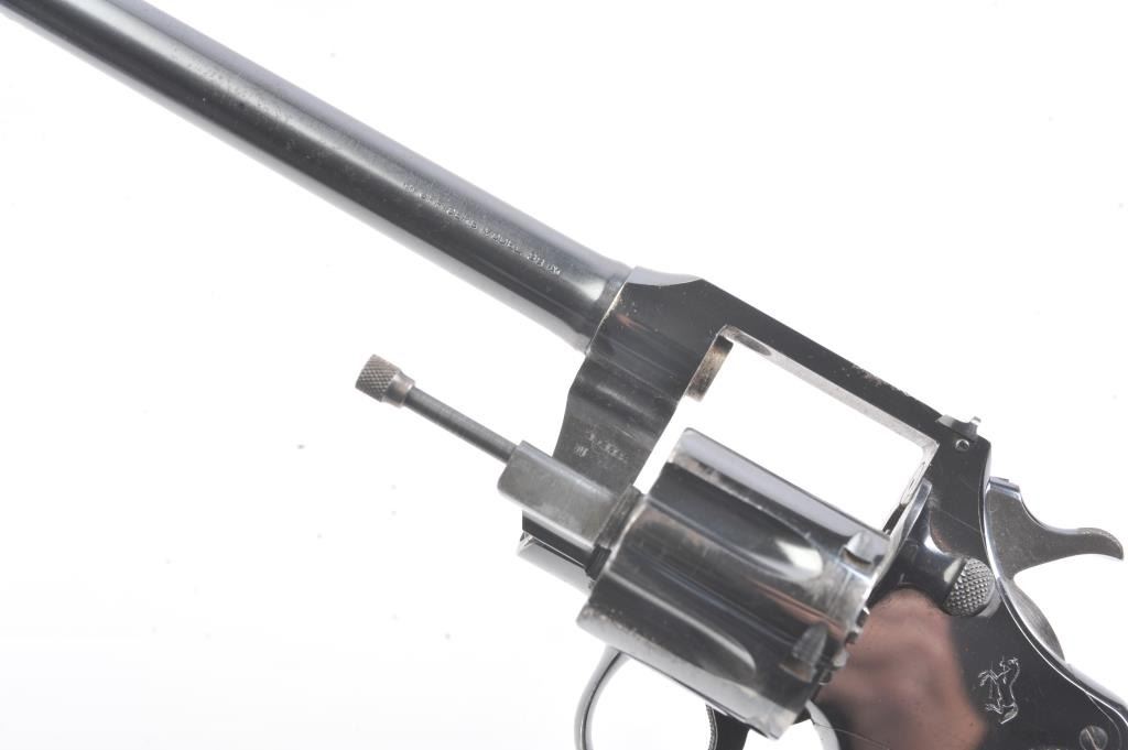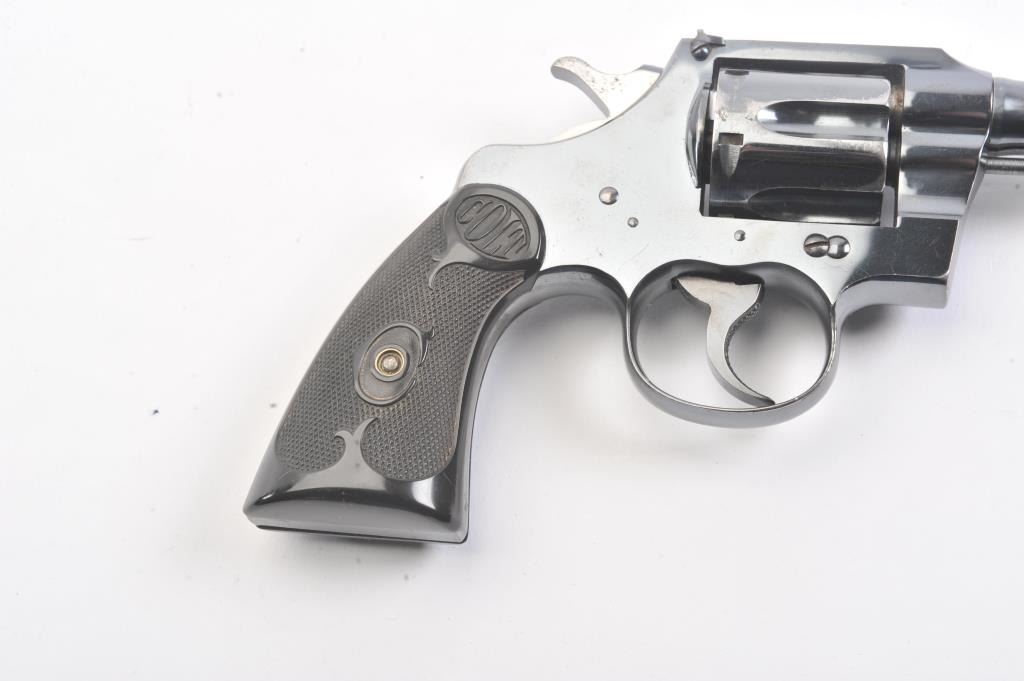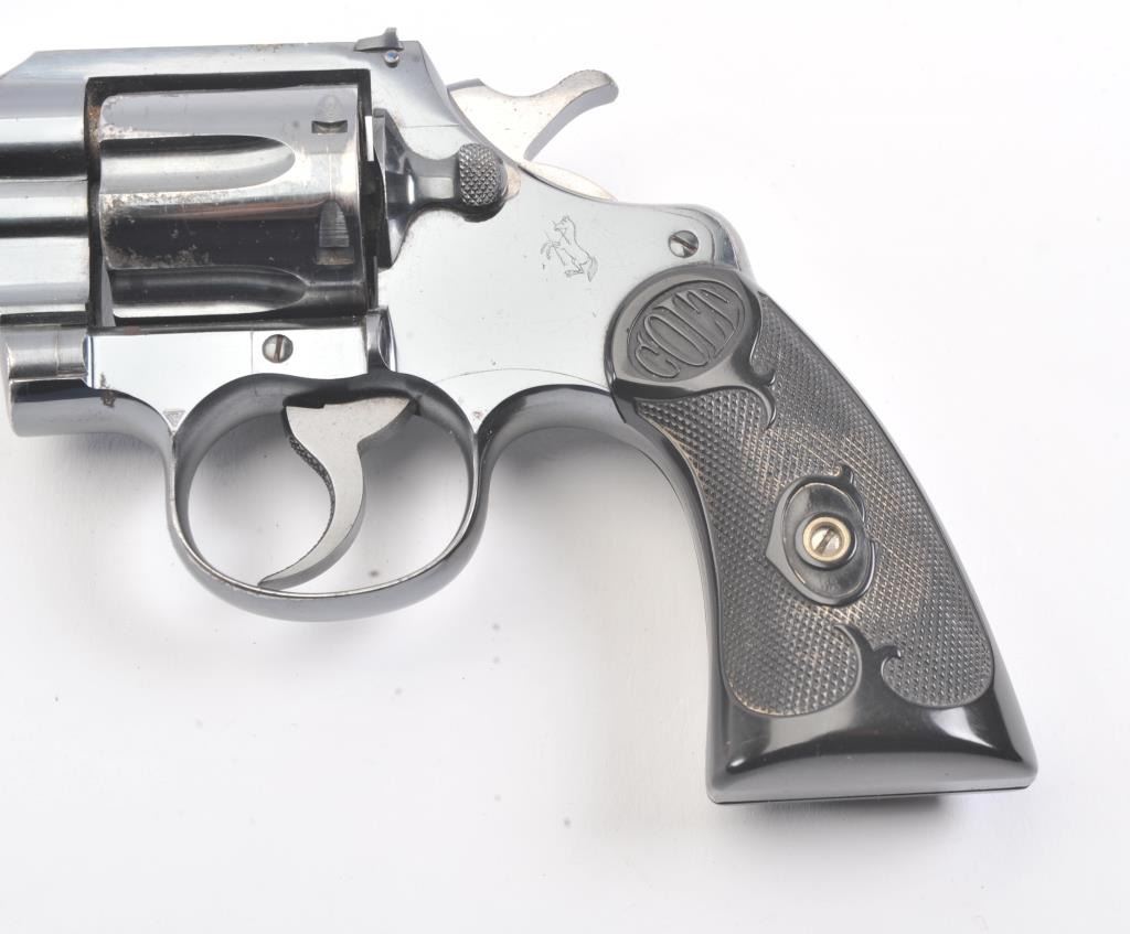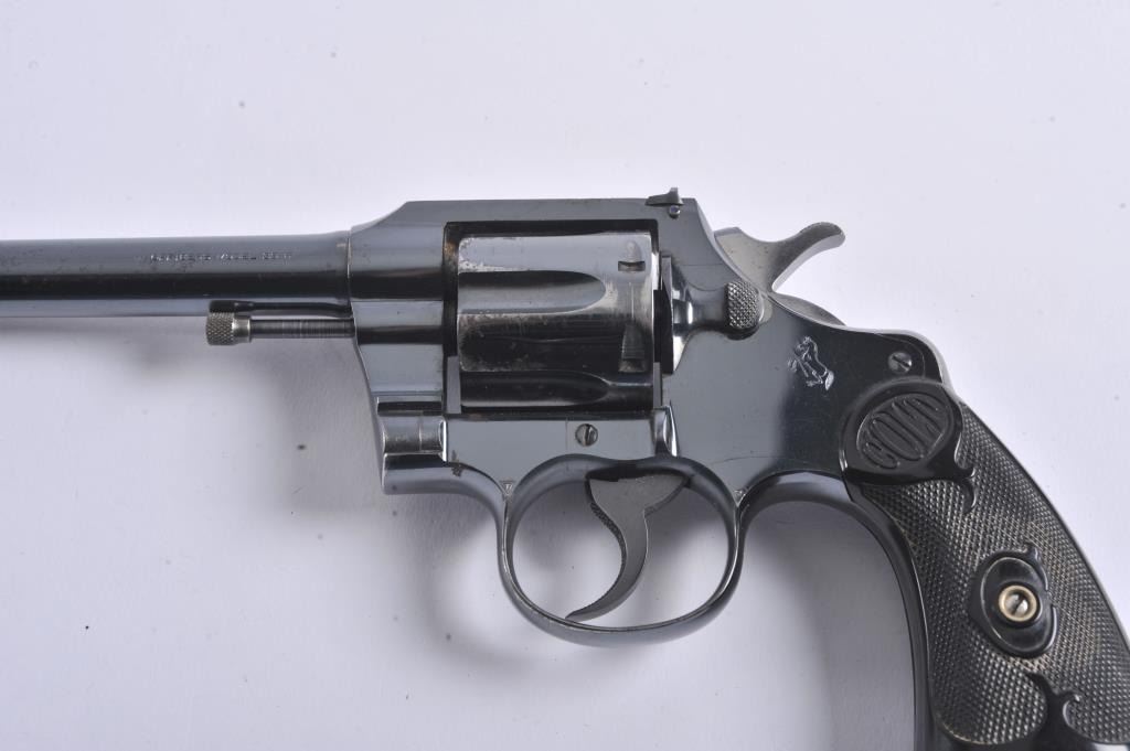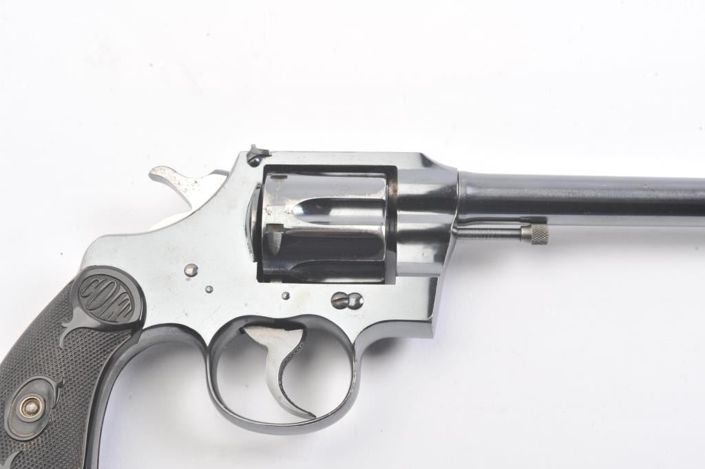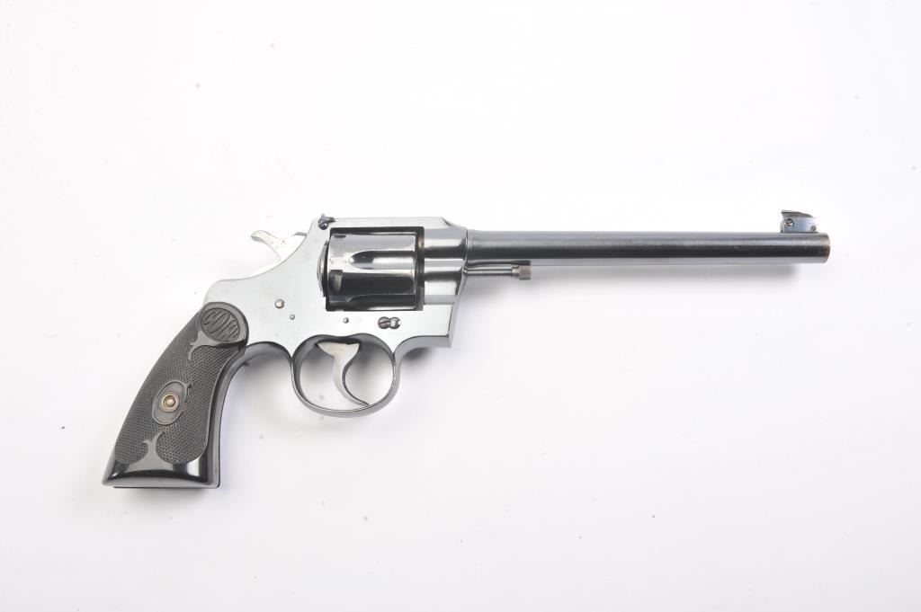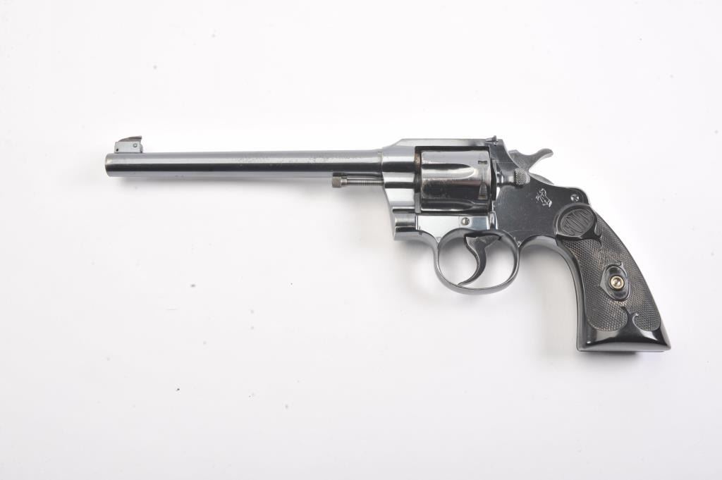 Colt early Officer’s Model Target DA revolver, #403644, .38 caliber, 7.5” barrel, high polish blued finish, with checkered black hard rubber grips. The revolver is in overall fine to near excellent conditionshowing the majority of its original bright finish, fine bore, action, markings and grips. (C&R/PPT). Est.: $750-$1,500.