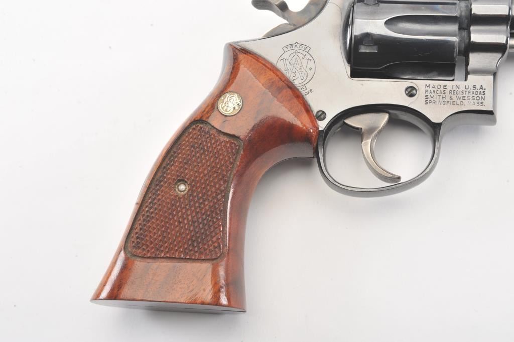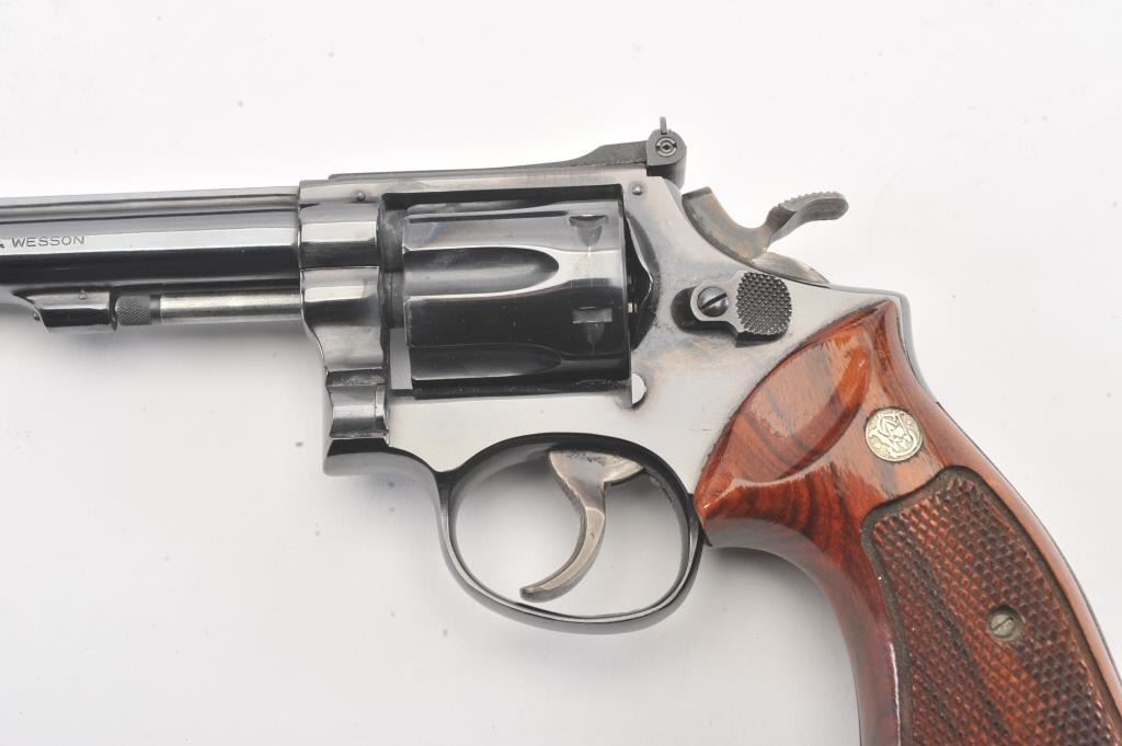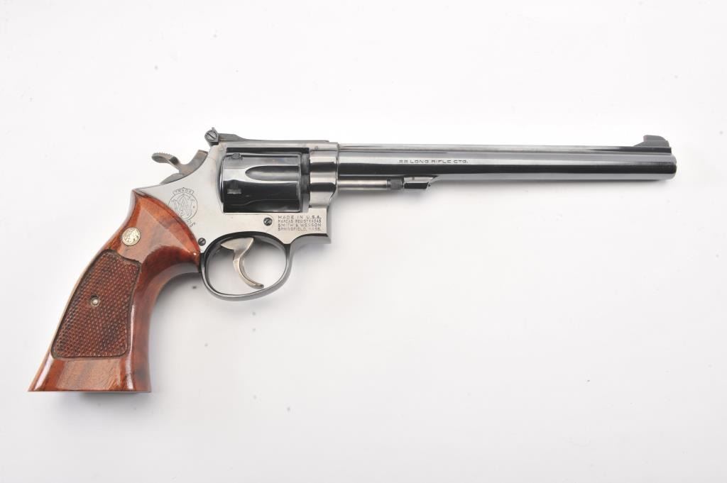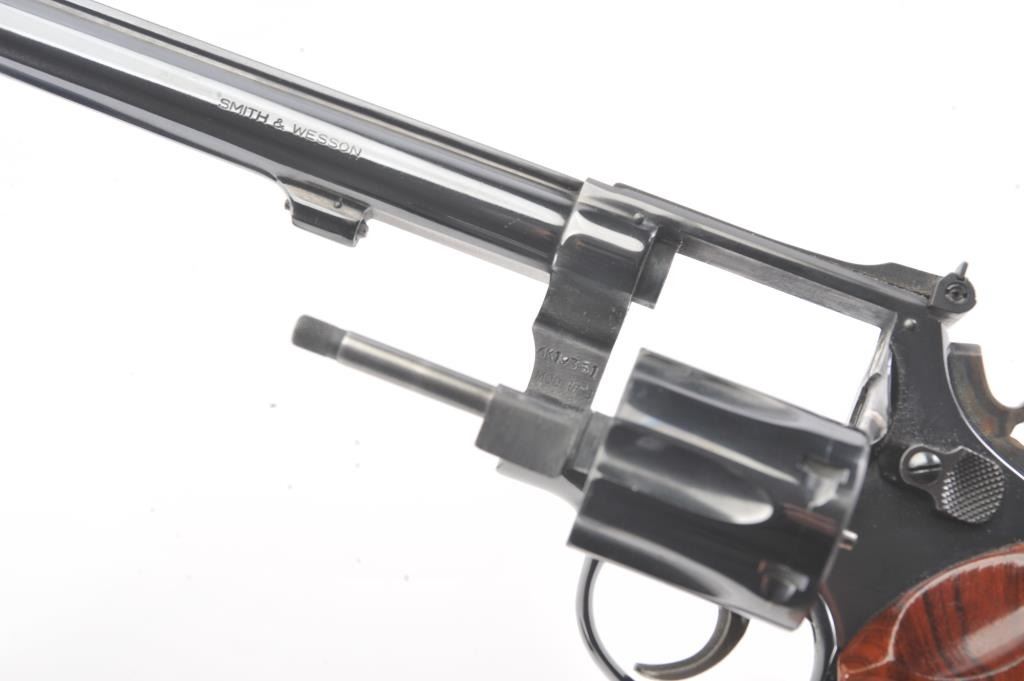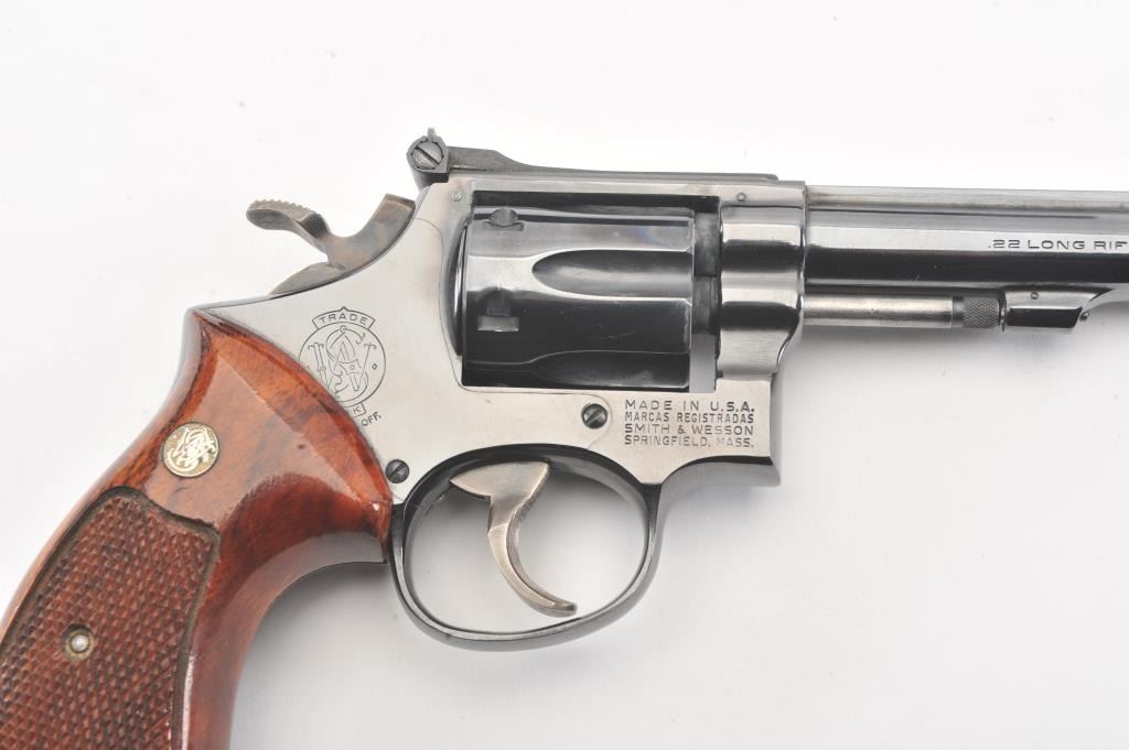 Smith & Wesson Model 17-3 DA revolver, #6K19351, .22 LR caliber, 8 3/8” barrel, blued finish, target hammer and trigger, checkered wood medallion combat grips. Revolver is in overall fine plus to narexcellent condition showing 98% original finish, just some scattered small spots from wear, fine bore, crisp action and markings, fine grips; would benefit from a good cleaning. Accompanied by a factory two piece cardboard blue box showing end label numbered to this gun; also with instructions. (Modern/PPT). Est.: $600-$1200.