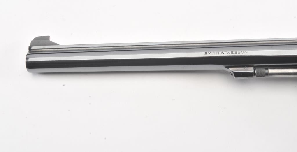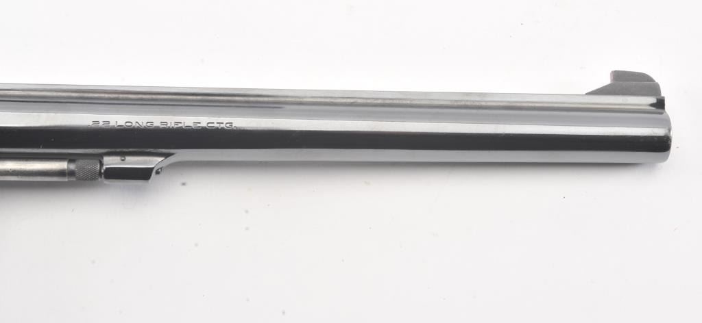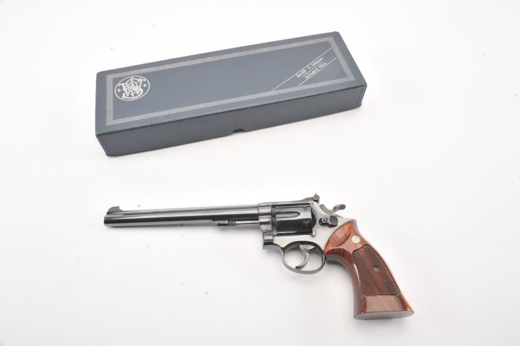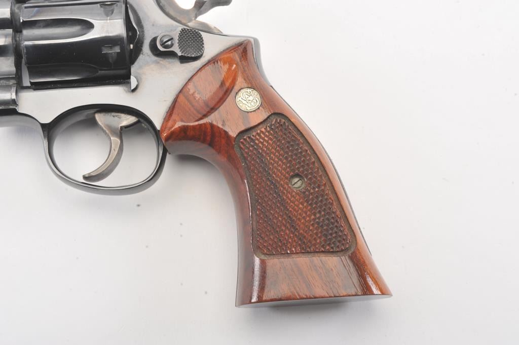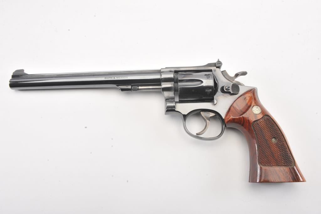 Smith & Wesson Model 17-3 DA revolver, #6K19351, .22 LR caliber, 8 3/8” barrel, blued finish, target hammer and trigger, checkered wood medallion combat grips. Revolver is in overall fine plus to narexcellent condition showing 98% original finish, just some scattered small spots from wear, fine bore, crisp action and markings, fine grips; would benefit from a good cleaning. Accompanied by a factory two piece cardboard blue box showing end label numbered to this gun; also with instructions. (Modern/PPT). Est.: $600-$1200.