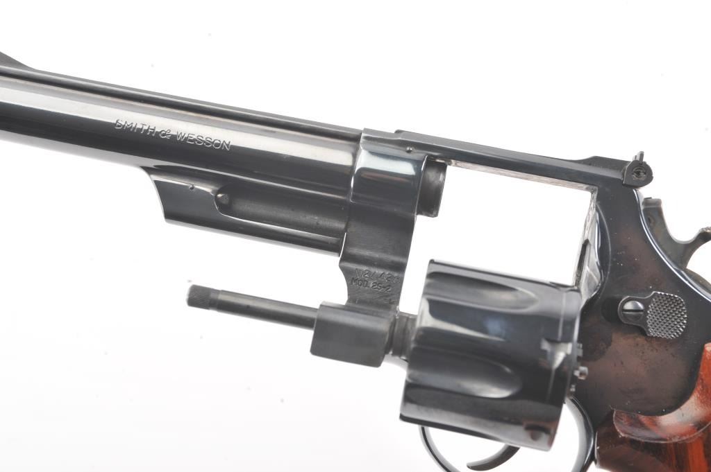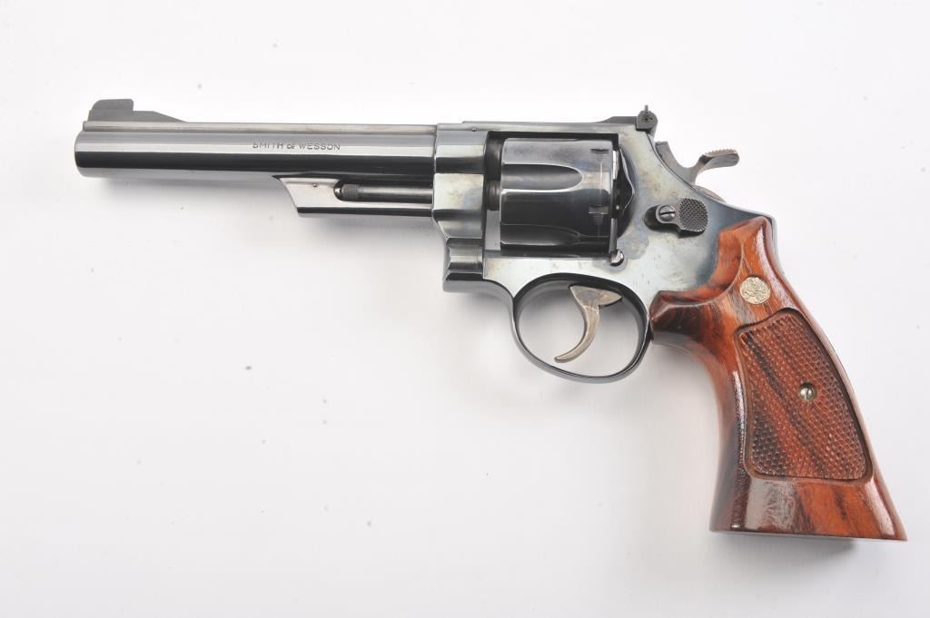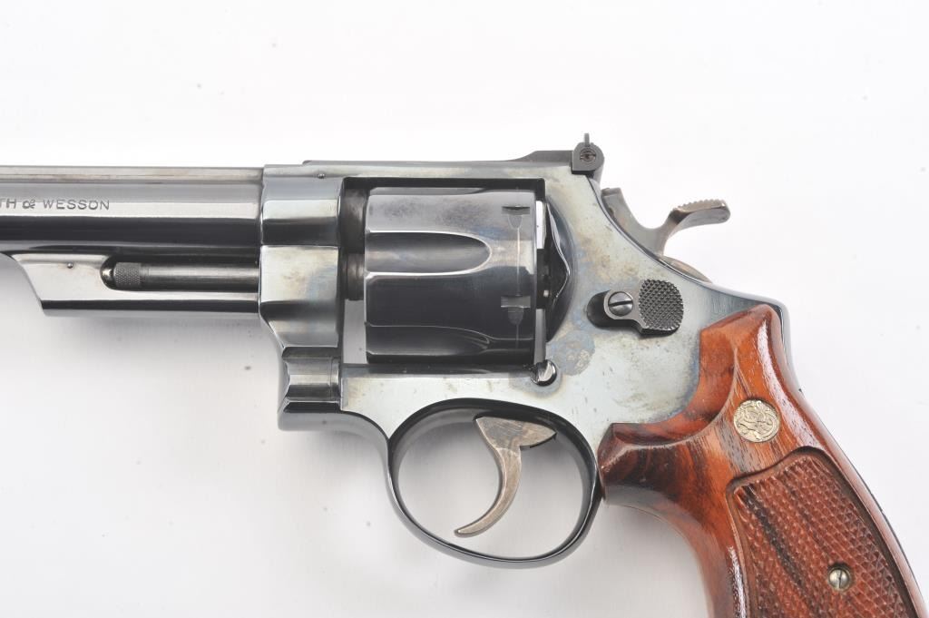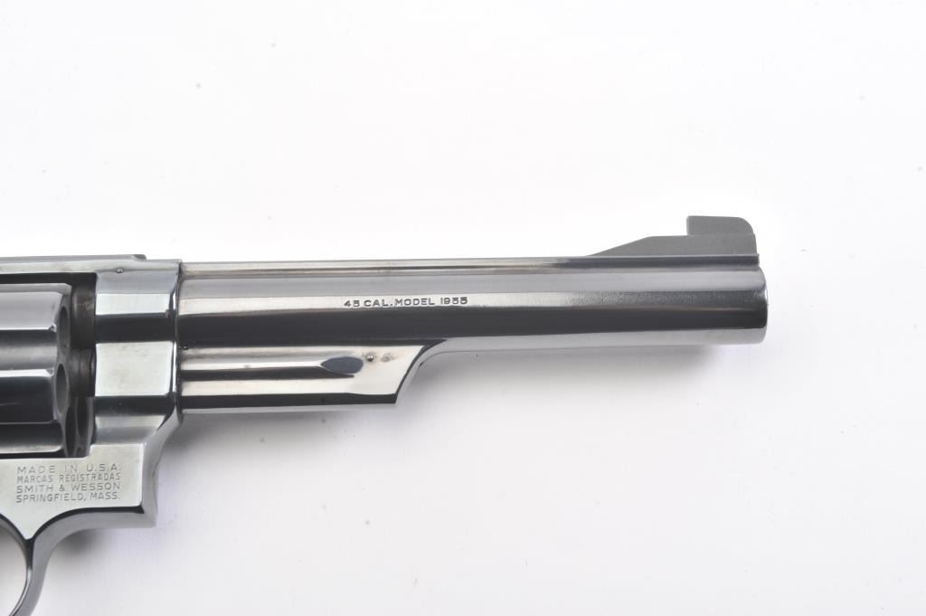 Smtih & Wesson Model 25-2 Model of 1955, #N24426, .45 ACP cal., 6 1/2" barrel, blued finish, target hammer and trigger, checkered wood medallion combat grips. Revolver is in near new condition, with minor drag line onthe cylinder, 98%+ original finish remains. Pistol needs a good cleaning, excellent action. (Modern/PPT). Est.: $600-1200