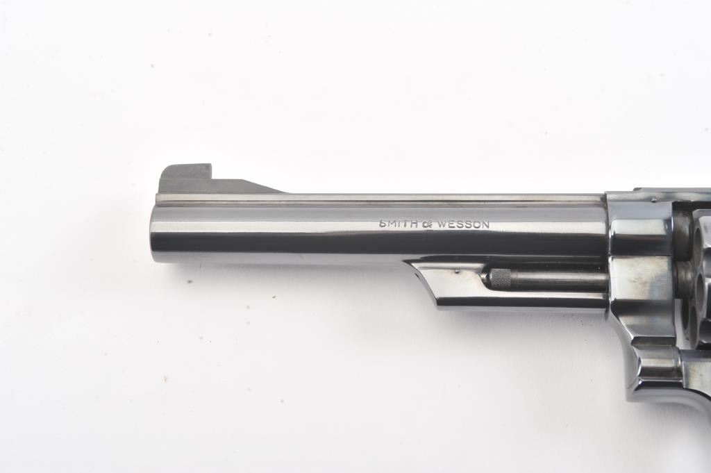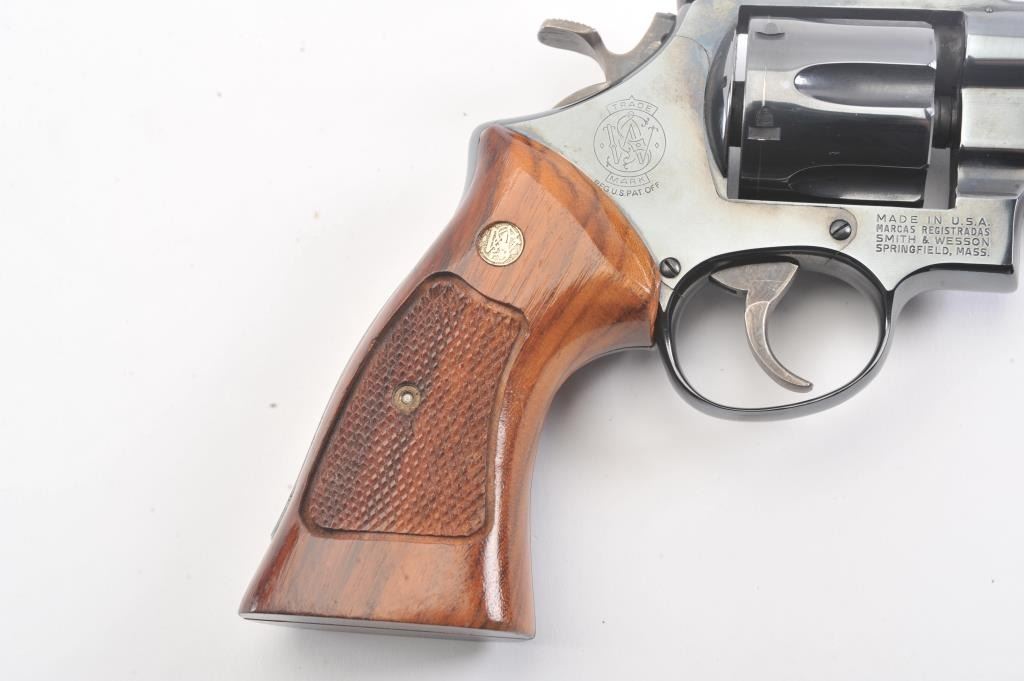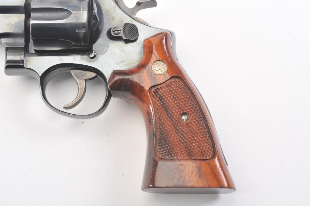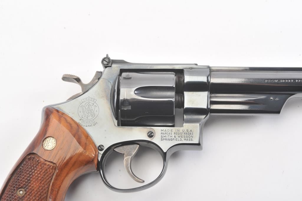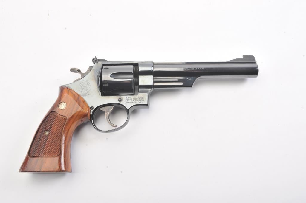 Smtih & Wesson Model 25-2 Model of 1955, #N24426, .45 ACP cal., 6 1/2" barrel, blued finish, target hammer and trigger, checkered wood medallion combat grips. Revolver is in near new condition, with minor drag line onthe cylinder, 98%+ original finish remains. Pistol needs a good cleaning, excellent action. (Modern/PPT). Est.: $600-1200