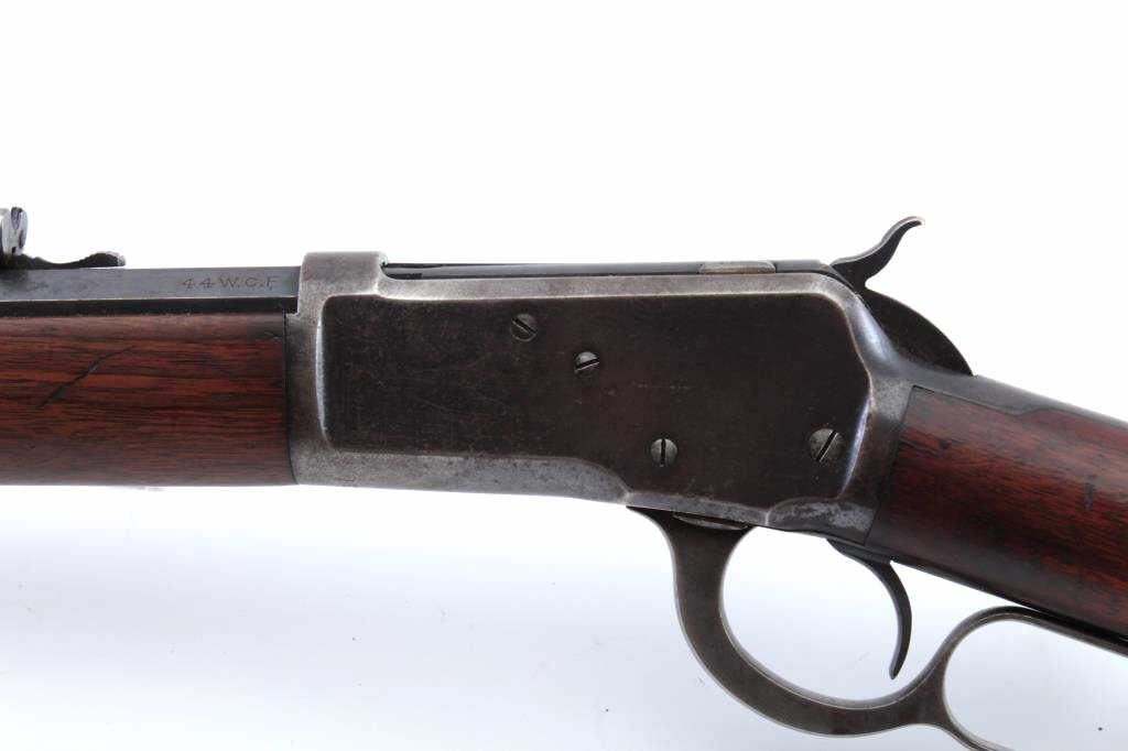 Winchester Model 1892 lever action rifle, .44-40 WCF caliber, Serial #39631. The rifle is in fine overall condition with a 24” octagon barrel with a full-length magazine. The barrel and magazine retain approximately85%-90% of the toning blue finish with scratches, sharp edges and light surface erosion. The receiver retains a significant amount of original flaking blue finish mixed with brown patina. The hammer and leverstill show case hardening, particularly in the protected areas. The smooth wood stocks are in very good condition with mars and compressions, retaining a significant amount of original finish. The butt ends with asmooth, steel crescent butt plate with traces of blue finish. The bore is bright, the action is crisp and the markings are sharp on this desirable Model 1892 in .44 WCF, circa 1895. Est.: $800-$1,600. (Antique).