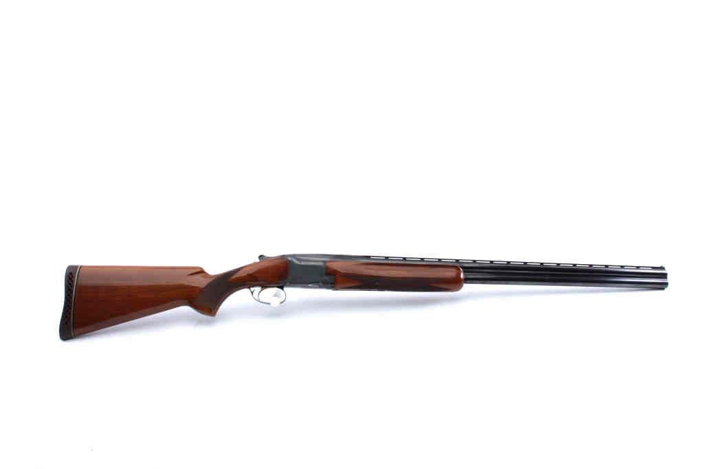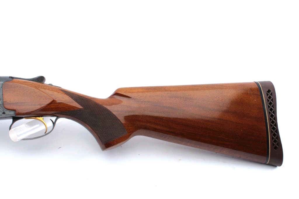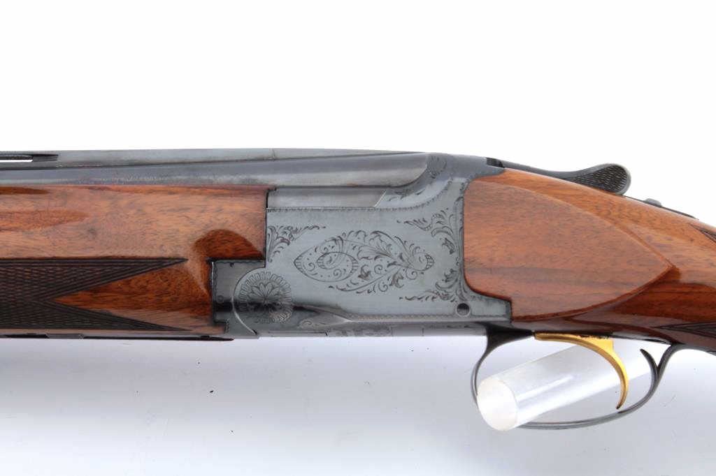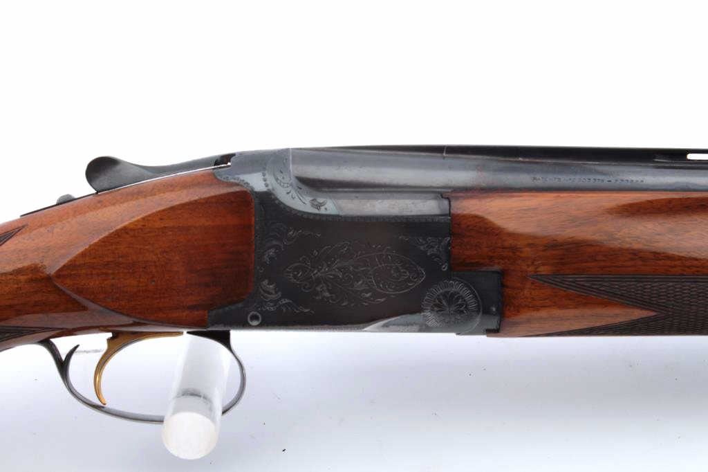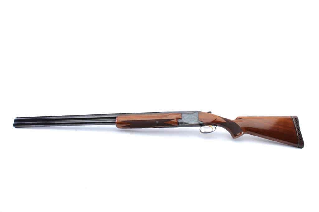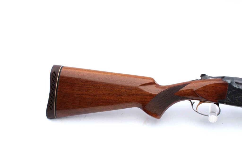 Belgian Browning Lightning O/U shotgun, 12 gauge, Serial #27132S4. The shotgun is in fine overall condition with 30” barrels with a full-length ventilated rib choked Full and Modified. The metal surfaces retain asignificant amount of blue finish with light scratches and edge wear on the receiver. The receiver is lightly scroll engraved with a single gold selector trigger and long tang. The finely checkered wood stock is in verygood condition and ends with a ventilated rubber pad providing a 14 ½” LOP. The bores are good, the action is crisp and the markings are sharp. The shotgun comes in a luggage style plastic case. Est.:$600-$1,200. (Modern).