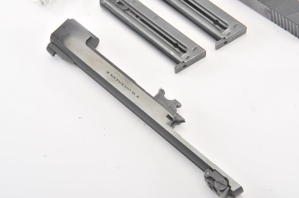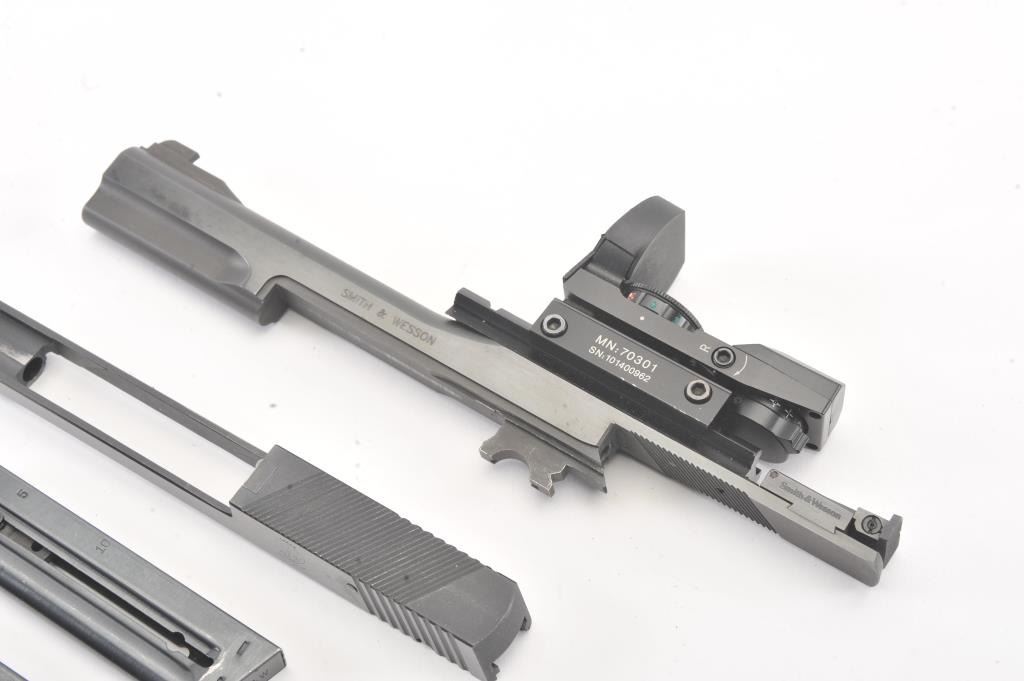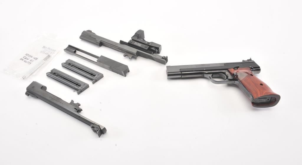 Early and rare Smith & Wesson Model 41 Target 3 barrel set, #46173, .22 Short cal., 5 1/2" bull barrel, blued finish, adjustable sights, with smooth thumb rest grips. The pistol remains in fine condition overall,retaining 97% original blue. The bore is bright with strong rifling, the action is good. Less than 1,000 these Model 41s were manufactured in 22 short between 1960 and 1973. Includes a 5 1/2" bull barrel in .22LR which is in very good condition, and a 7" barrel with rail and CP Tactical red/green dot scope, model 70301. One correct 22 short mag and 2 correct 22 LR mags included. (C&R/PPT) Est. $700-1400