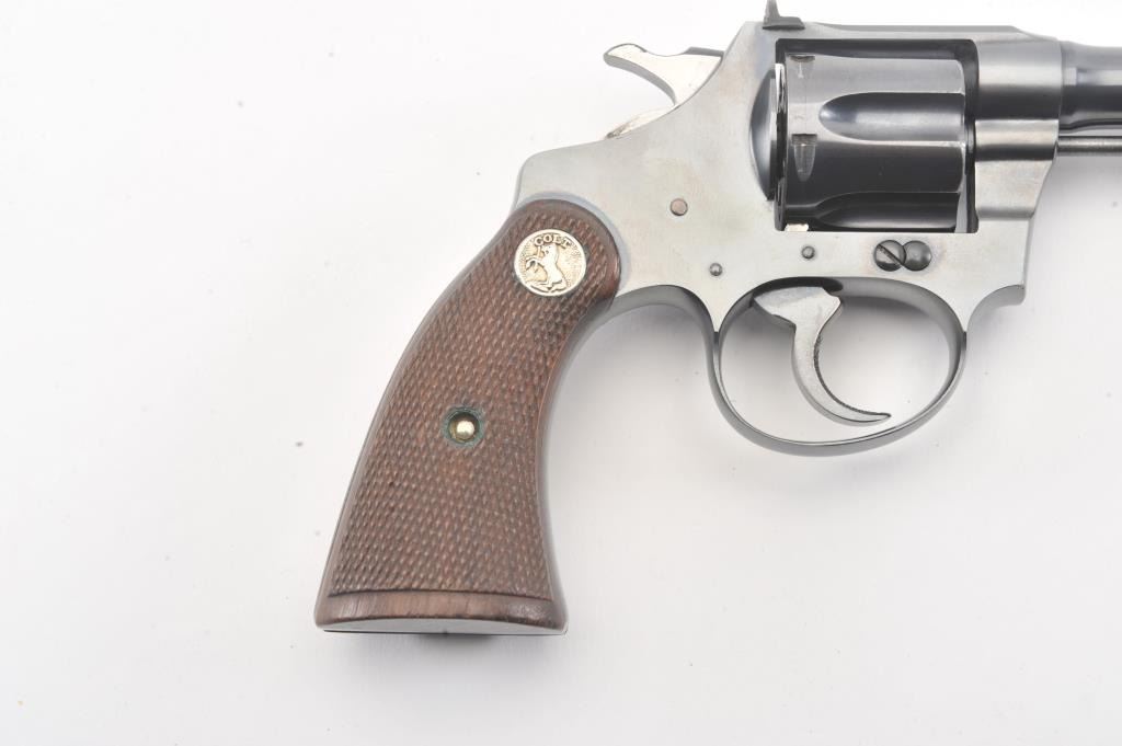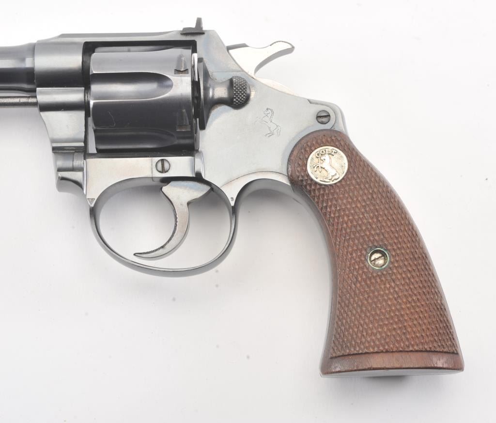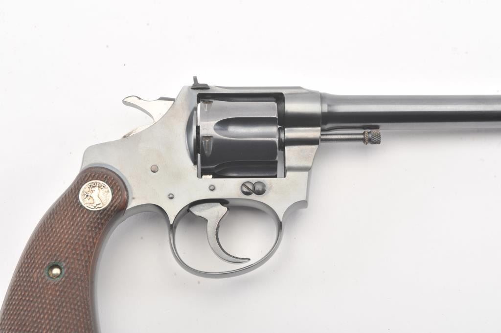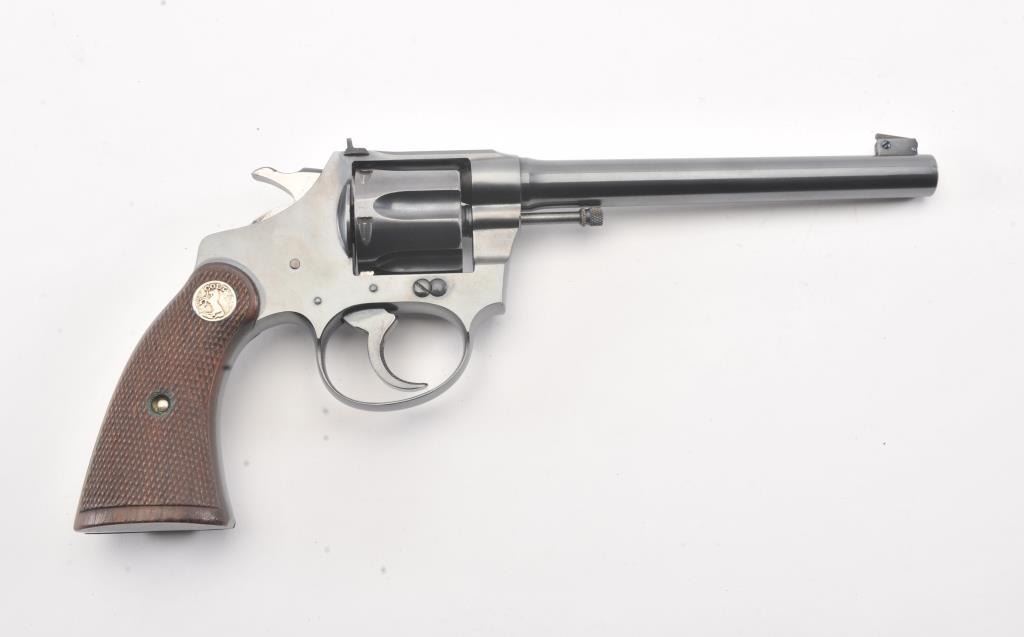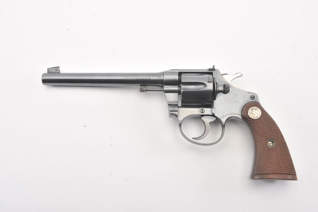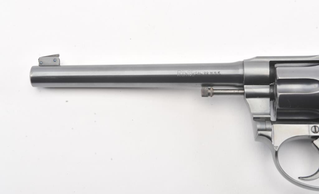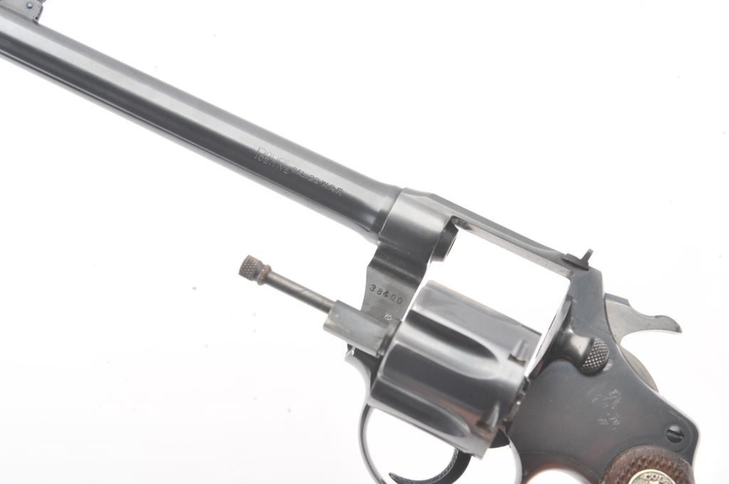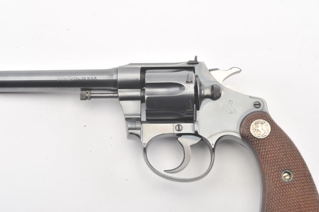 Colt Police Positive flat top target DA revolver, #38400, .22 W.R.F. caliber, 6” barrel, blued finish, checkered wood medallion grips. Overall near fine condition with majority of original blued finish, verygood bore, crisp action, sharp markings and near fine grips. (C&R/PPT). Est.: $600-$1,200.