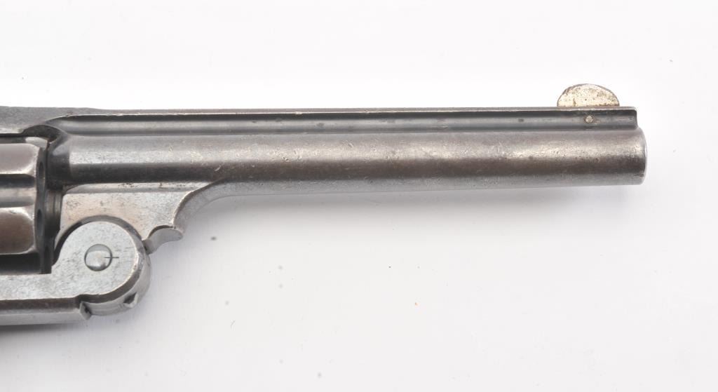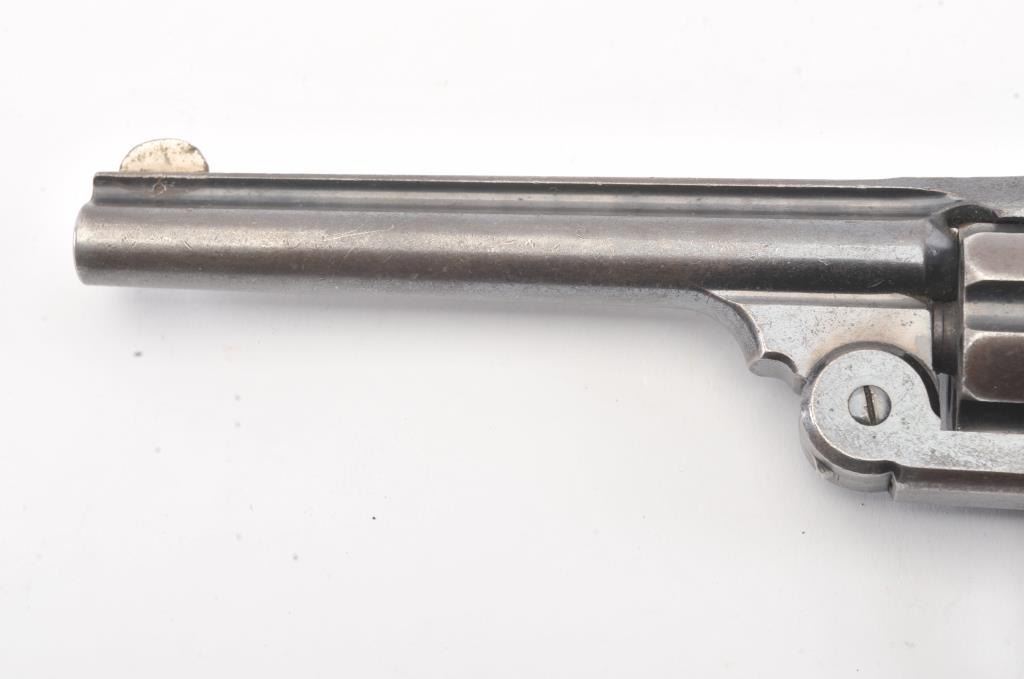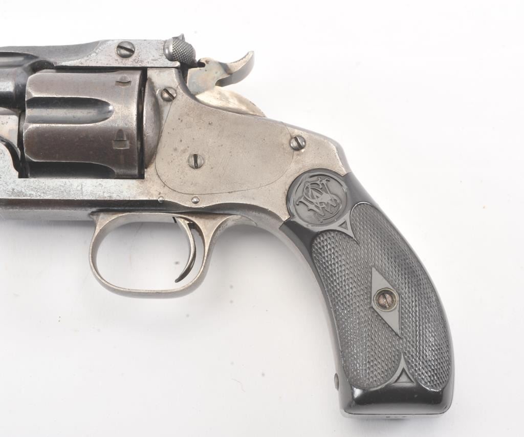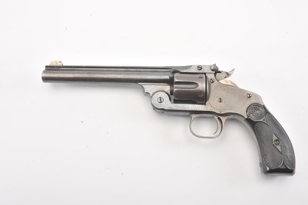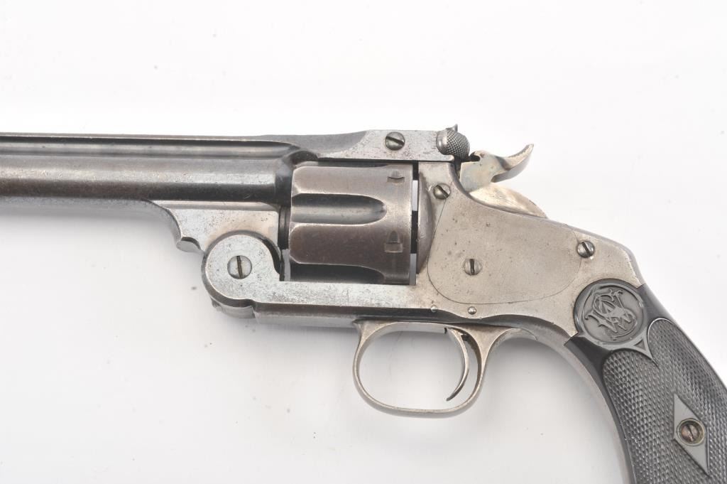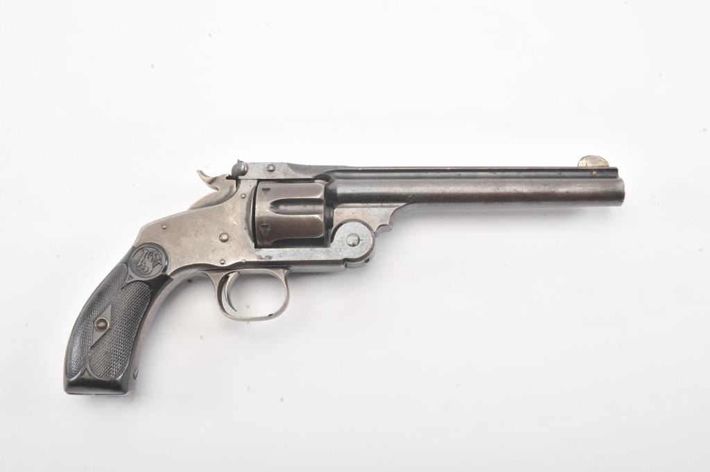 Smith & Wesson New Model #3 Target Single Action revolver, #412, .32-44 cal., 6-1/2” barrel, blue and case hardened finish, replacement grips. Revolver is in overall good to very good condition showing approx.30% original blue, crisp action, very good markings, overall good bore with some pitting, replaced front sight. Per Flayderman’s, only 2,621 produced in this caliber. (Antique). Est.: $750-1500.