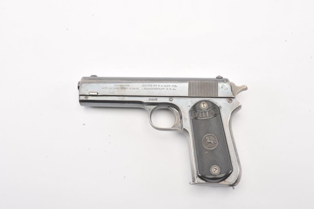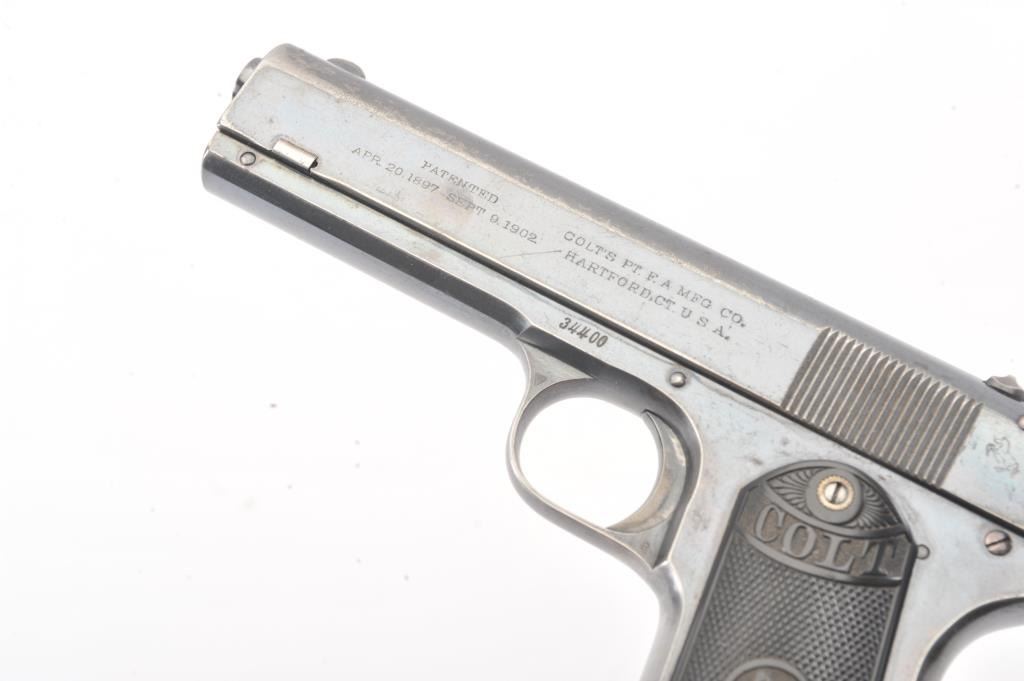Colt 1903 Pocket Hammer, #34400, .38 Automatic cal. (.38 ACP), 4.5” barrel, blued finish, spur hammer, with checkered hard rubber grips. Pistol is in overall fine condition displaying approximately 80-85%original finish, good markings, crisp action and fine grips. Bore is very good with no corrosion. Little more than 29,000 of these pistols were manufactured, and production had ceased by 1927. Finding nice examples isincreasingly difficult. Includes one mag. (C&R/PPT). Est.: $700-$1400.