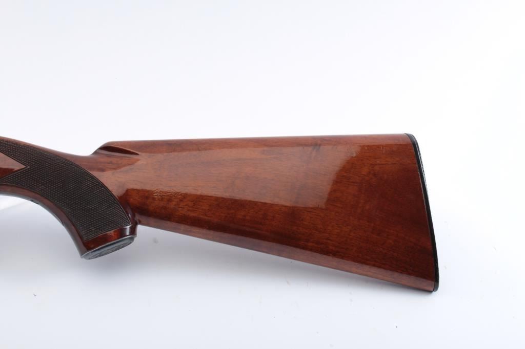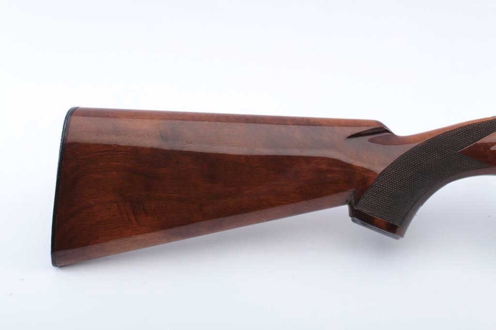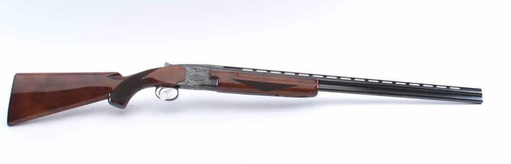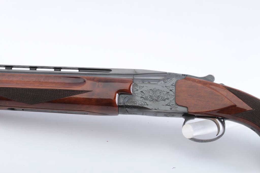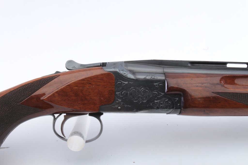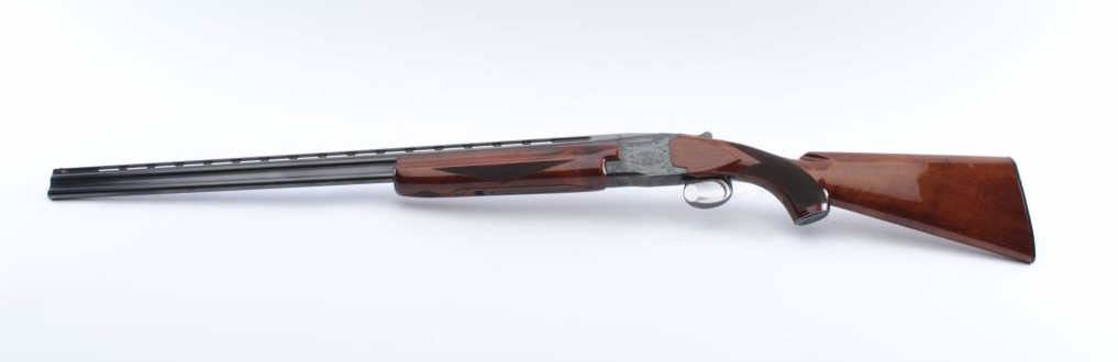 Winchester Model 101 O/U shotgun, .410 Gauge, Serial #K2211954. The shotgun is in excellent overall condition with 28” barrels with a full-length ventilated rib. The shotgun retains 95%-98% of the blue finishwith light handling marks and nice scroll engraving on the receiver, trigger guard and tang. The finely checkered wood stocks are in very good condition with small mars and storage marks. The butt stock ends with acheckered plastic Winchester marked butt plate providing a 14” LOP to a single selector trigger. The bores are dirty but should clean to good. The action is crisp and the markings are sharp. Est.:$800-$1,600. (Modern).
