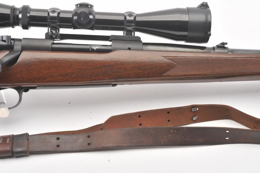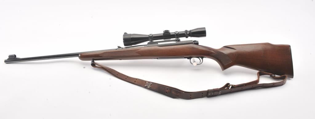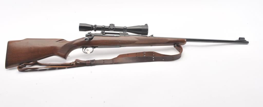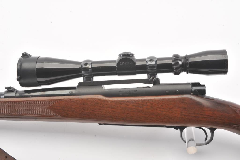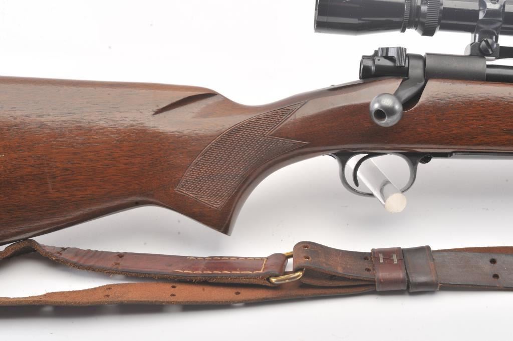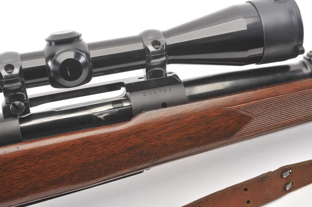 Pre-64 Winchester Model 70 bolt action rifle, #554767, .243 Win cal., 24" barrel, blued finish, flip down rifle sights, with checkered walnut stock, sling swivels, leather sling and mounted with a Leupold 3x9scope. Rifle is in very good condition overall, 97-98% original blue remains, with freckling on mag well housing. Strong markings. Bore is bright, action is good. Stock is fine plus with minor nicks,scratches and dings. Optics are good. (C&R) Est $700-1400