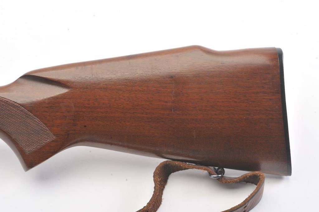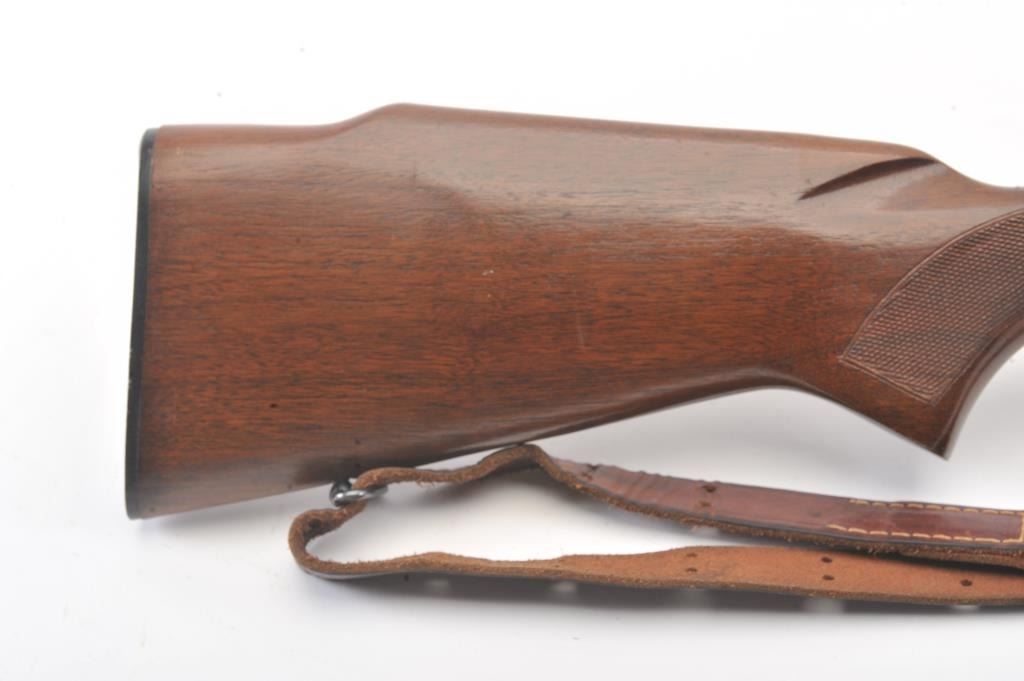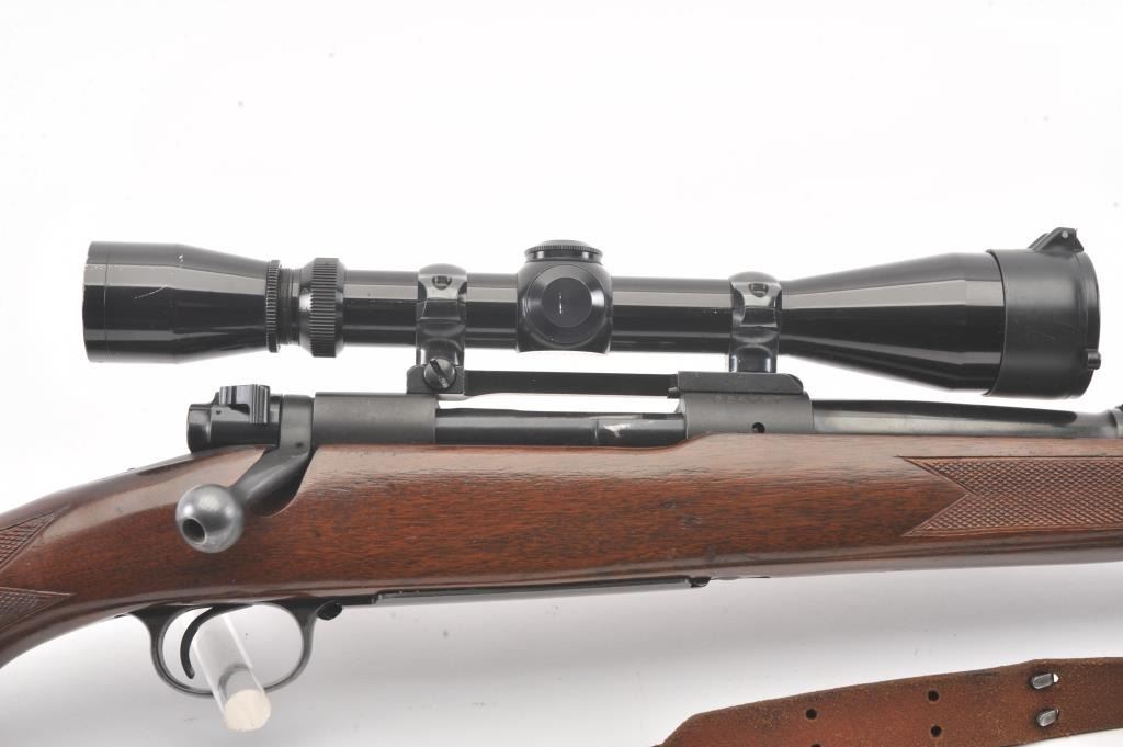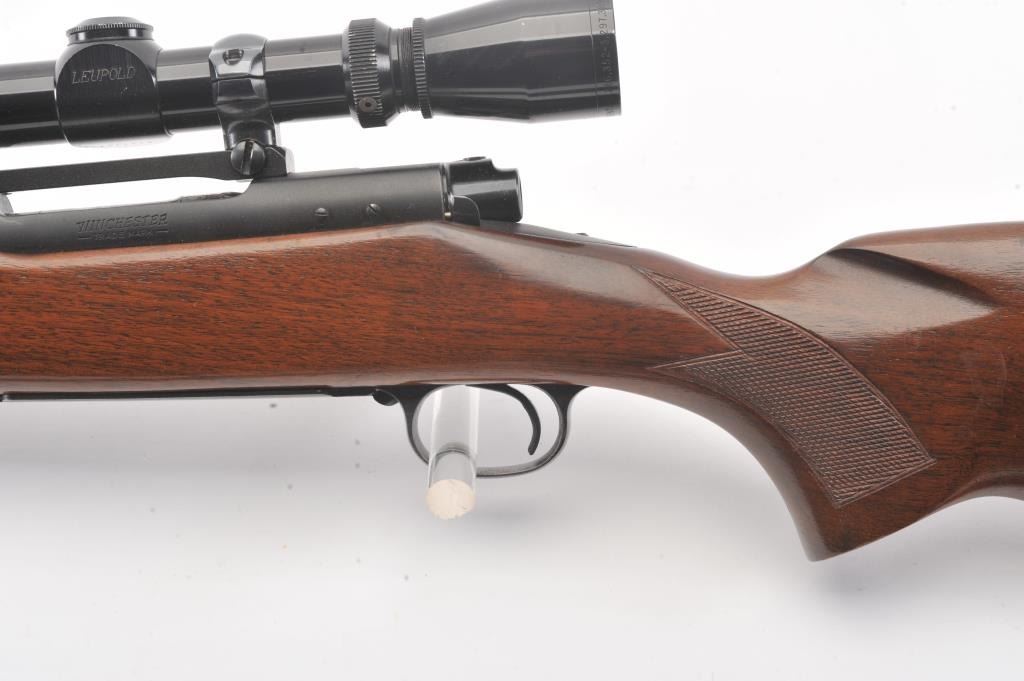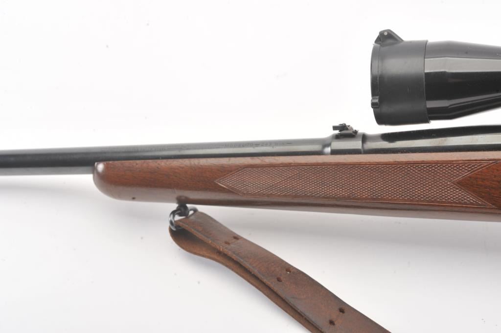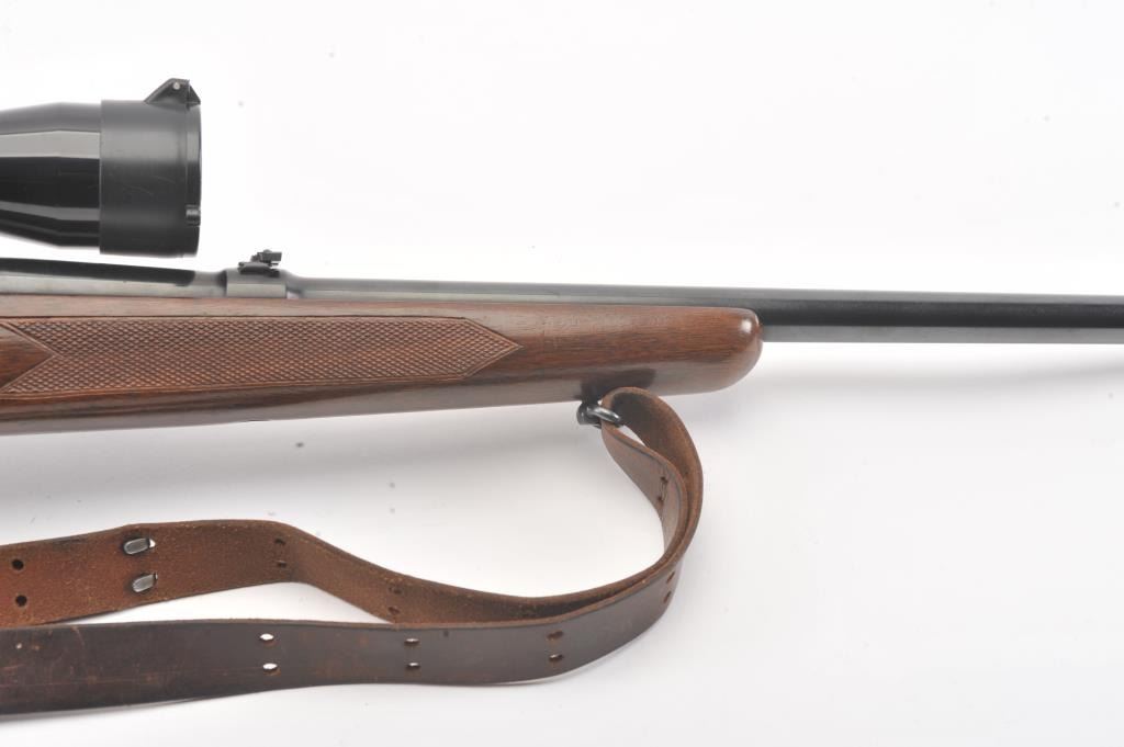 Pre-64 Winchester Model 70 bolt action rifle, #554767, .243 Win cal., 24" barrel, blued finish, flip down rifle sights, with checkered walnut stock, sling swivels, leather sling and mounted with a Leupold 3x9scope. Rifle is in very good condition overall, 97-98% original blue remains, with freckling on mag well housing. Strong markings. Bore is bright, action is good. Stock is fine plus with minor nicks,scratches and dings. Optics are good. (C&R) Est $700-1400