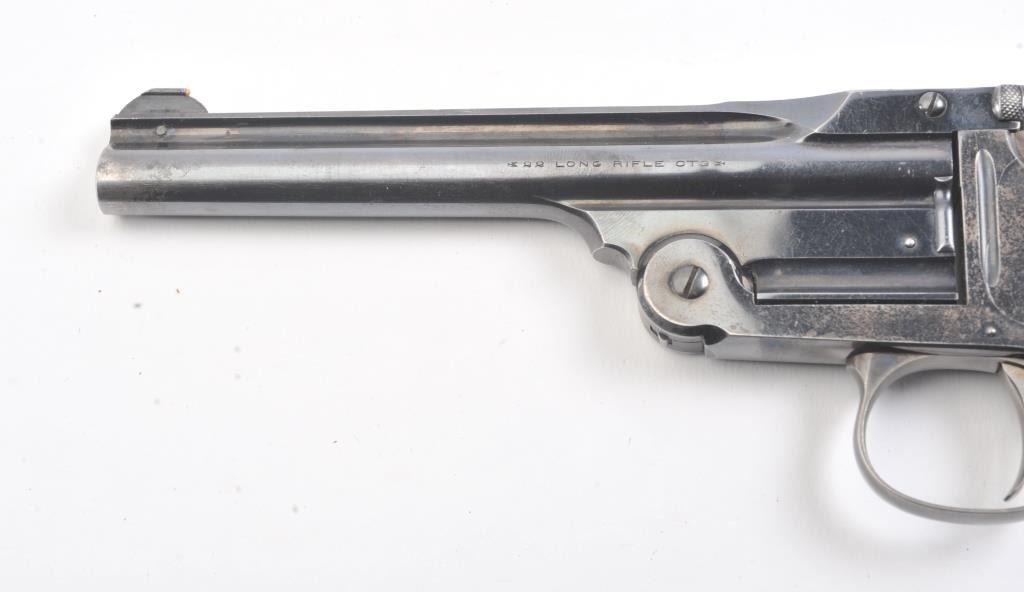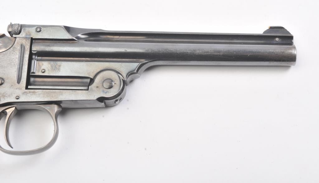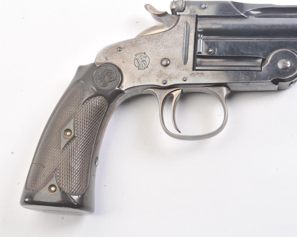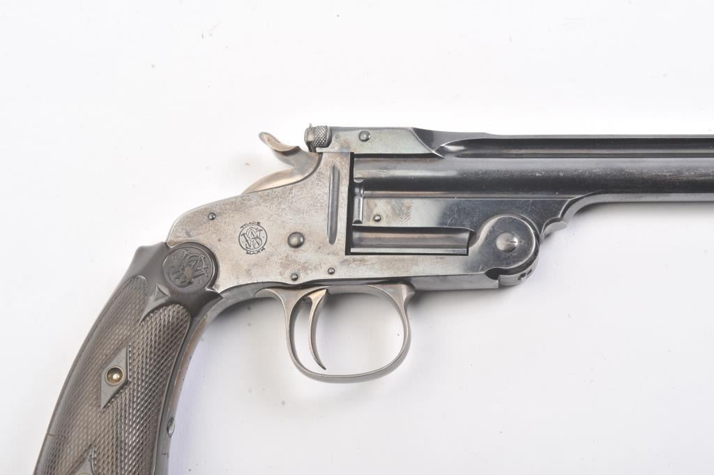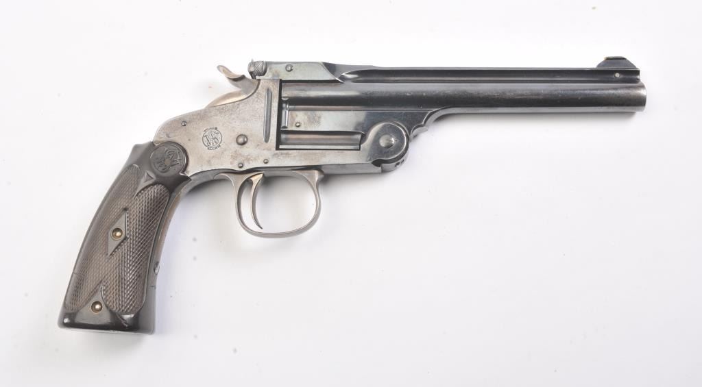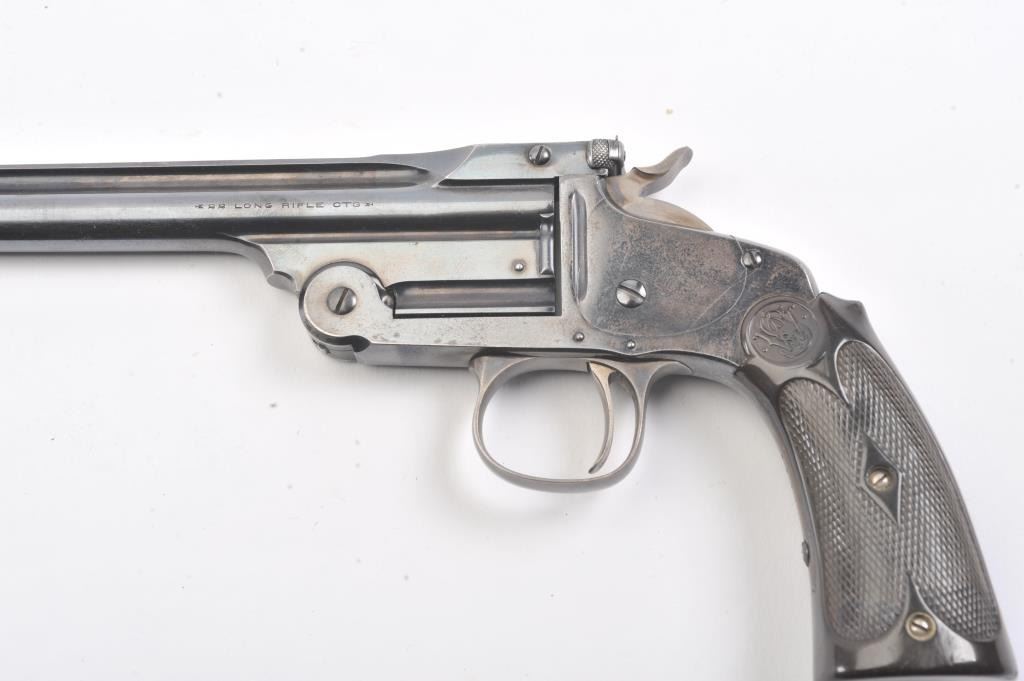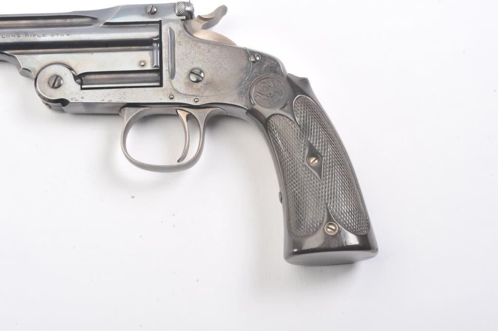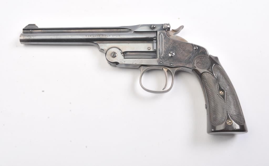 Smith & Wesson Model of 1891 Target pistol, .22 caliber, Serial #NSNV. The top break single shot pistol is in fine overall condition with a 6” barrel. The pistol retains a significant amount of the originalflaking blue finish with wear at the muzzle and on the frame. The hammer and trigger show old, muted case hardening. The checkered hard rubber extended grips are in very good condition. The bore is fair, theaction is crisp and the markings are sharp. Est.: $300-$600. (C+R/PPT).