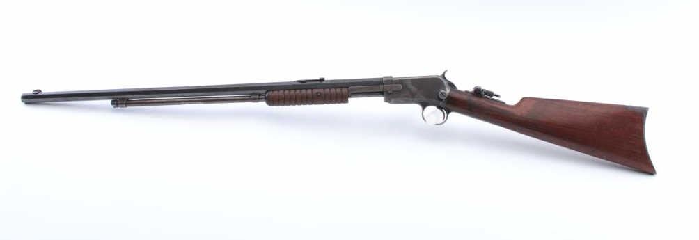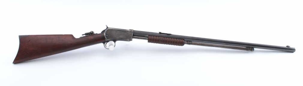 Winchester Model 90 pump action rifle, .22 WRF caliber, Serial #491388. The rifle is in very good overall condition with a 24” octagon barrel with a ¾ length magazine. The barrel retains approximately 85%-90% of thetoning blue finish with sharp edges, Marbles knife blade front and Marbles folding rear sights. The magazine has gone to brown patina and is missing the follower, while the receiver has a mottled appearance of greypatina with muted original blue in the protected areas. A period tang sight has been added. The smooth wood stock is in good condition with mars and scrapes associated with field use. The butt ends with a smoothsteel crescent butt plate. The bore is good, the action is crisp and the markings are sharp. Est.: $400-$800. (C+R).
