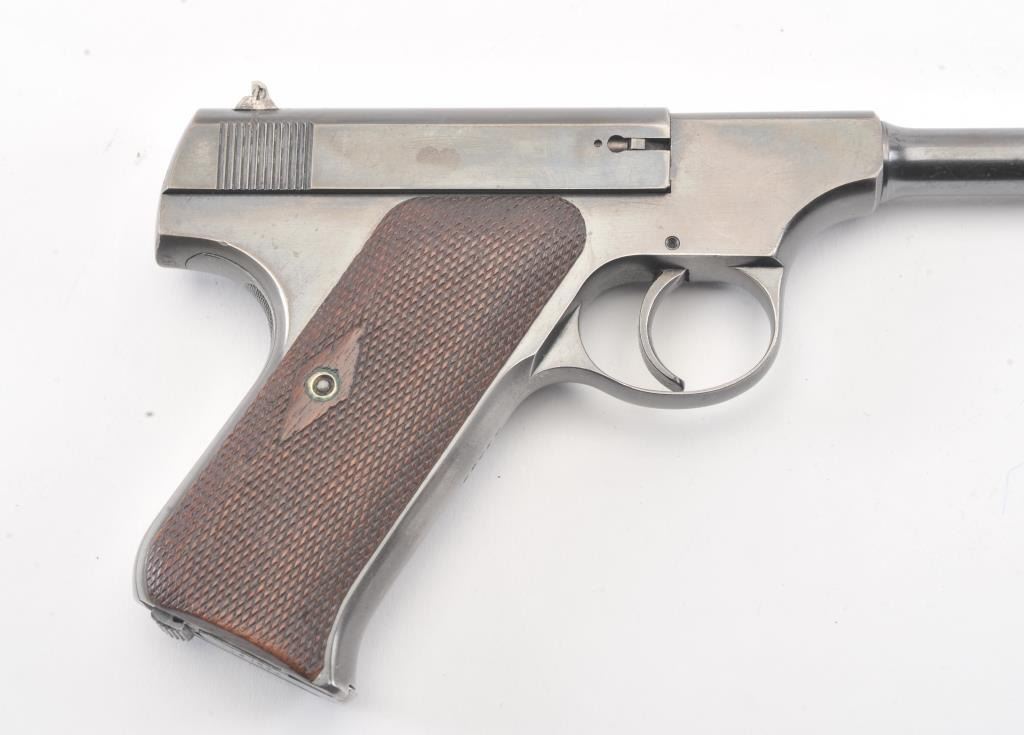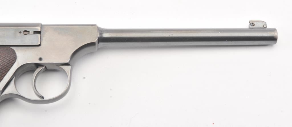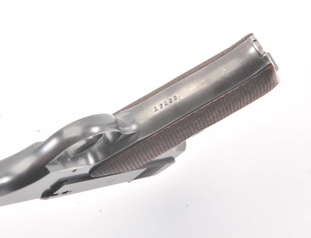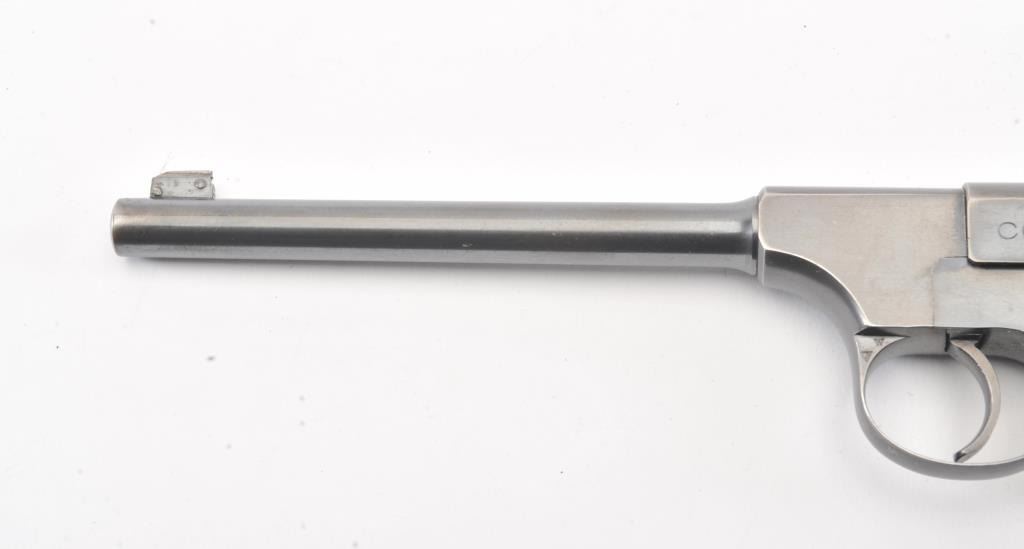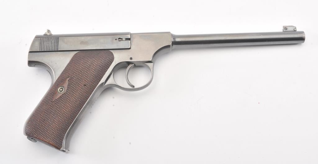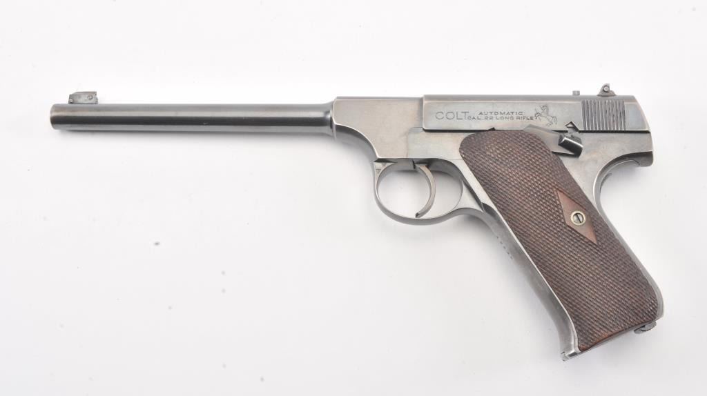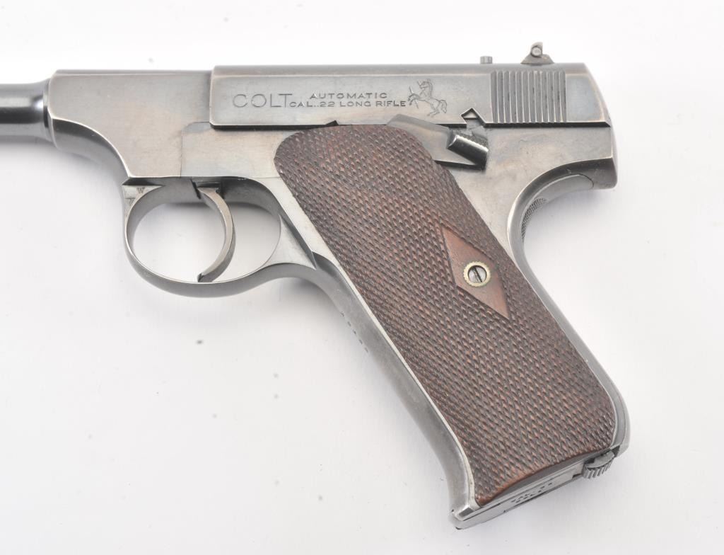 Colt Pre-Woodsman semi-auto pistol, #17130, .22LR cal., 6-1/2” barrel, blue finish, adjustable sights, with checkered wood grips. The psitol is in overall very good to near fine condition showing the majority of itsoriginal finish, very good + bore, crisp action and markings, very good to near fine grips. Includes one correct two-tone magazine. (C&R/PPT). Est.: $500-1000