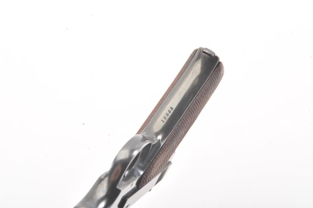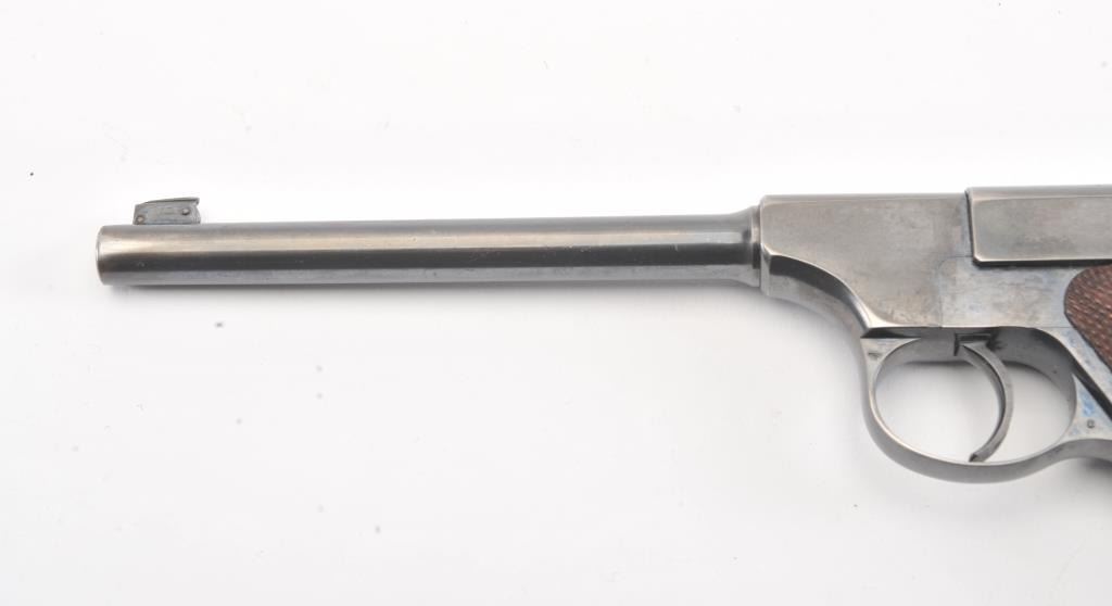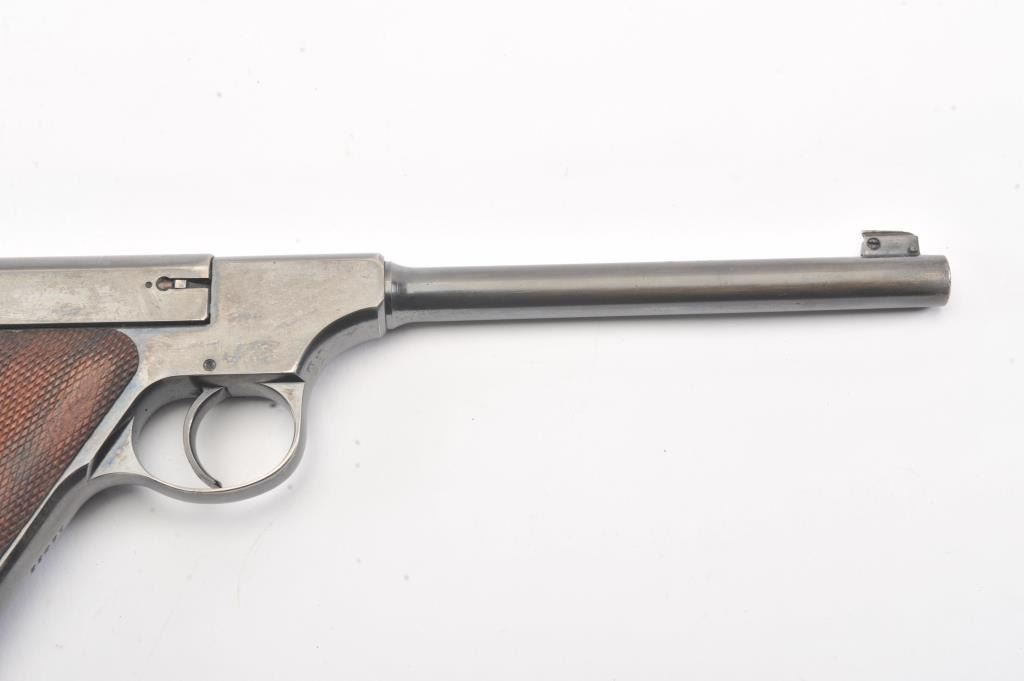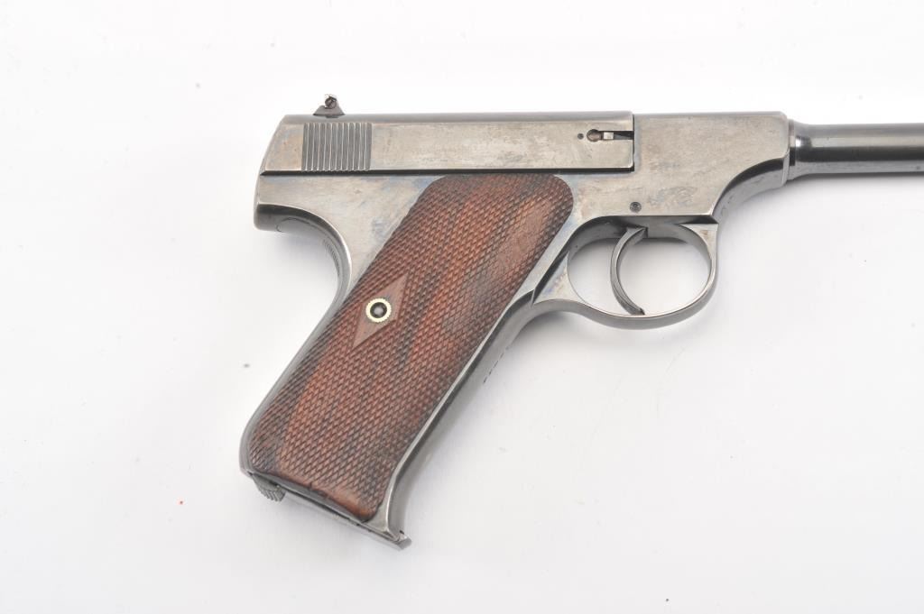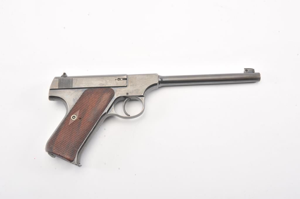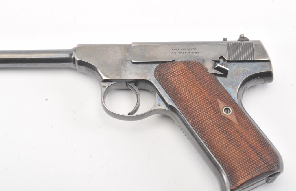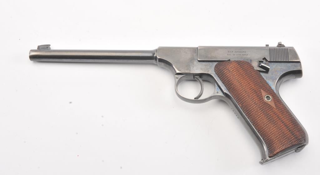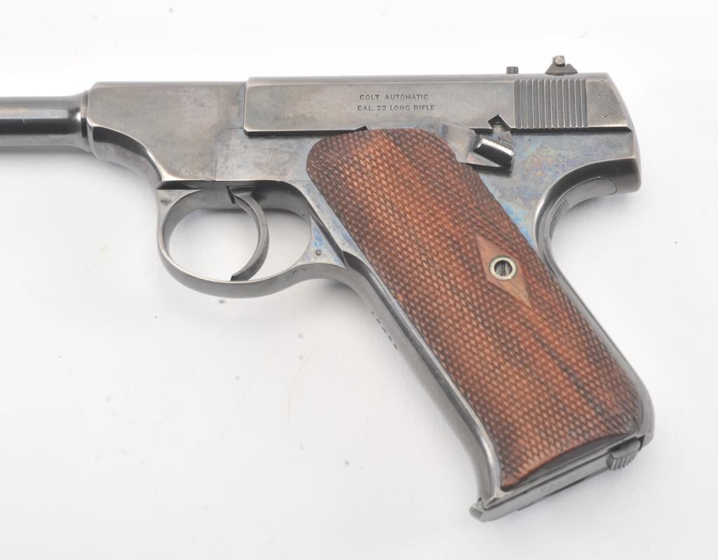 Early Colt Pre-Woodsman semi-automatic pistol, #12433, cal .22 Long Rifle, 6 5/8" barrel, adjustable sights, with checkered walnut grips. The pistol is in overall near fine condition with a 6 1/2” blued barrel.The pistol shows considerable original blue with an older cold blue application to the right side of the barrel. The action is crisp and markings sharp, while the pistol retains a nearly fine bore. The checkered wood grips are in very good condition except for some flattening on the right side. "FMU" has been neatly scratched into the finish under the "Colt Automatic Cal 22 Long Rifle" on the left side of the slide in approx. 1/8"letters. (C+R/PPT). Est.: $500-1000