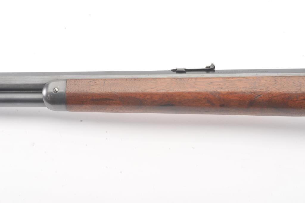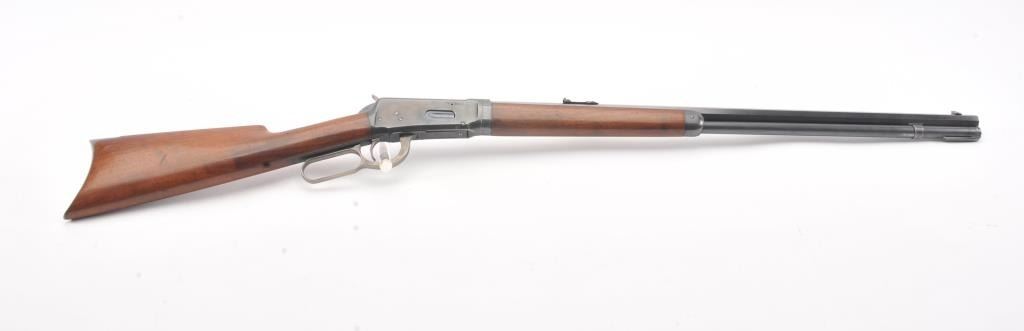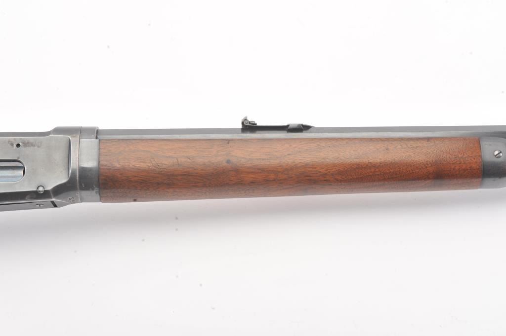 Winchester Model 1894 Takedown lever action rifle, .30 WCF caliber, Serial #296138. The rifle is in fine to nearly excellent overall condition with a 26” barrel with a full-length magazine, take down frame. Thebarrel and magazine retain 95%-98% of the blue finish with a Marble No.3 front and three-leaf folding rear sights. The receiver shows a significant amount of thinning blue finish with some flaking on the right sideand vivid color case hardening on the hammer and lever. The smooth wood stocks are in very good condition with small mars and handling marks. The butt stock ends with a smooth steel crescent butt plate. The boreis bright, the action is crisp and the markings are sharp on this desirable Model 1894 manufactured in 1904. Est.: $750-$1,500. (C+R).