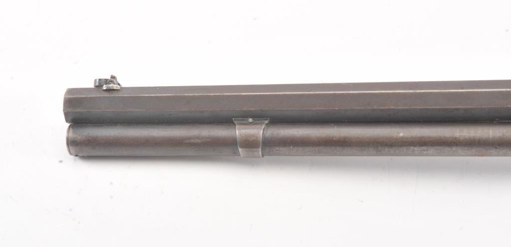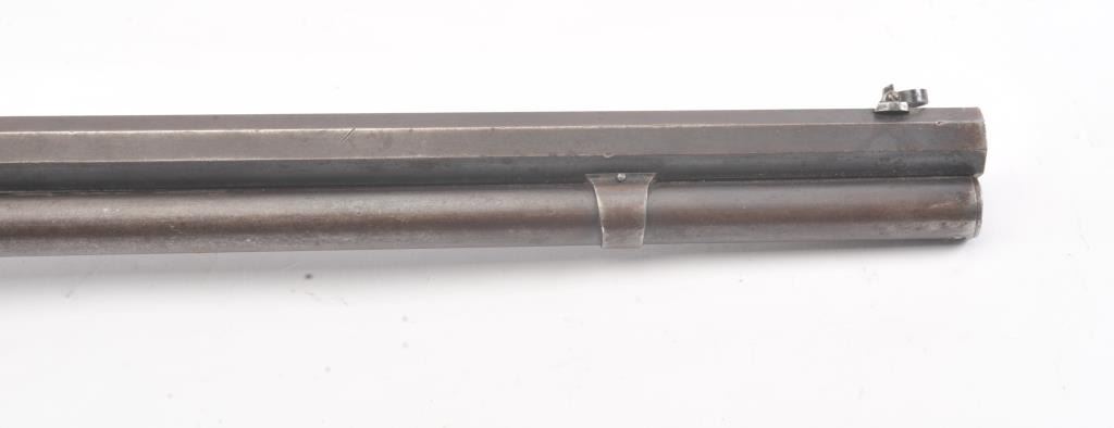 Early Winchester Model 1892 lever action rifle, .44-40 WCF caliber, Serial #3969. The rifle is in fine overall condition with a 24” octagon barrel with a full-length magazine. The barrel and magazine havedrifted to plum patina mixing with toning blue finish in the protected areas. The receiver has taken on a brown patina with dull blue still evident on the bolt and loading gate. The front sight is a dealeradded Beeches folding style, the rear sight has been removed and the dove tail filled and a period tang sight has been added. The hammer and lever still show case hardening, particularly in the protected areas. Thesmooth wood stocks are in good condition with mars, compressions and some dried oil residue. The butt ends with a smooth, steel crescent butt plate. The bore is fair, the action is crisp and the markings are sharp on this 1st year production Model 1892 in the venerable .44 WCF chambering. Est.: $800-$1,600. (Antique).