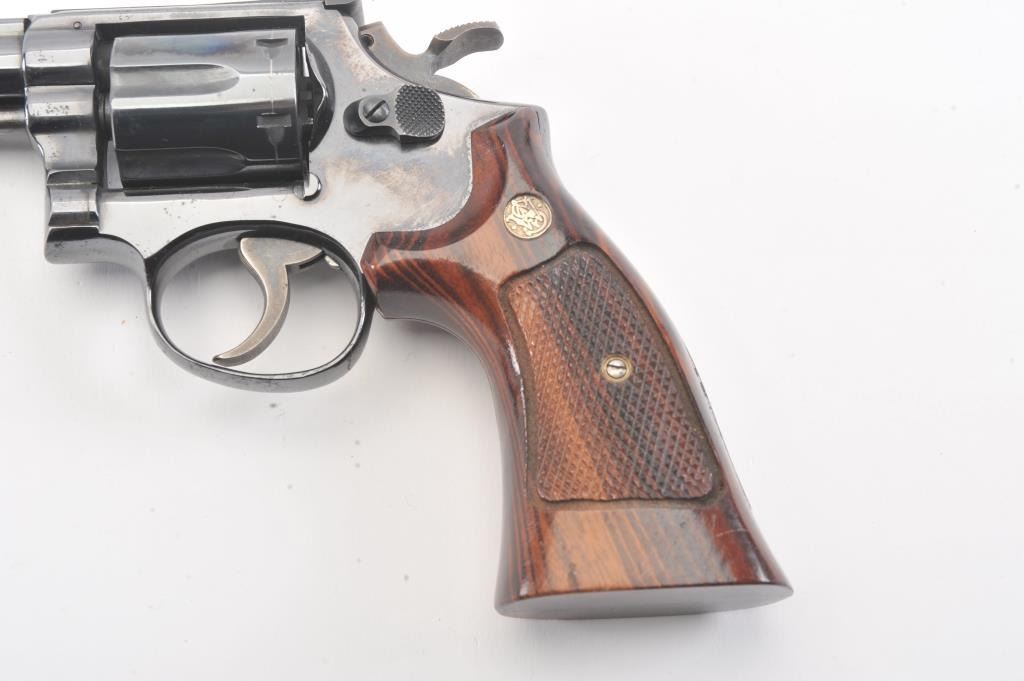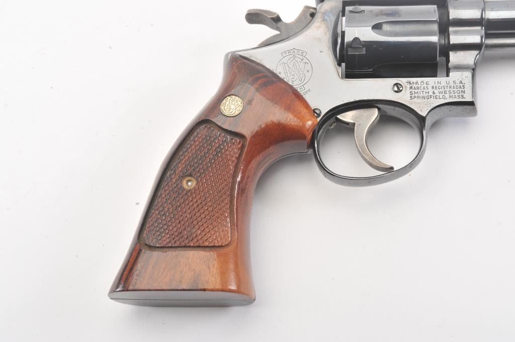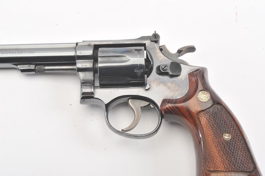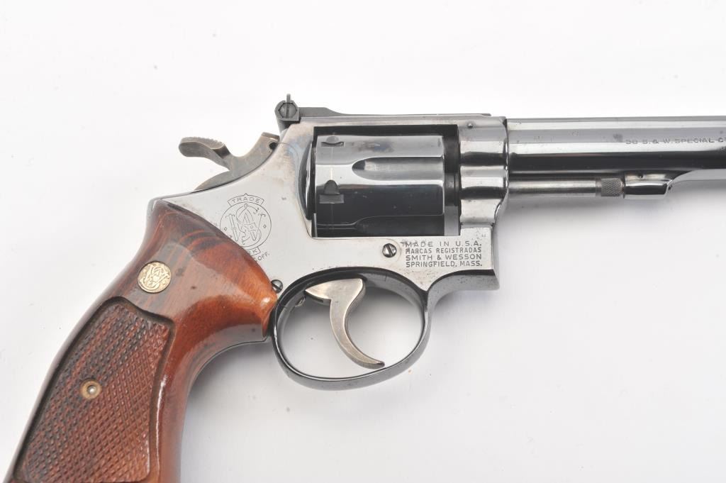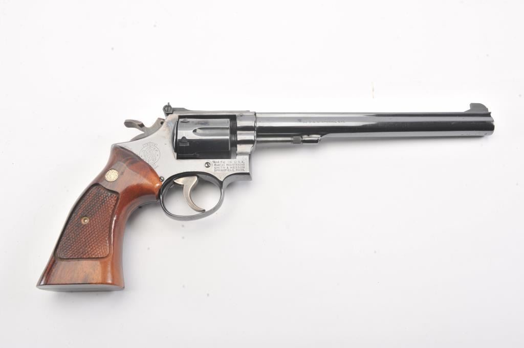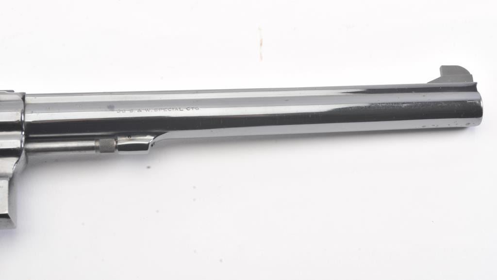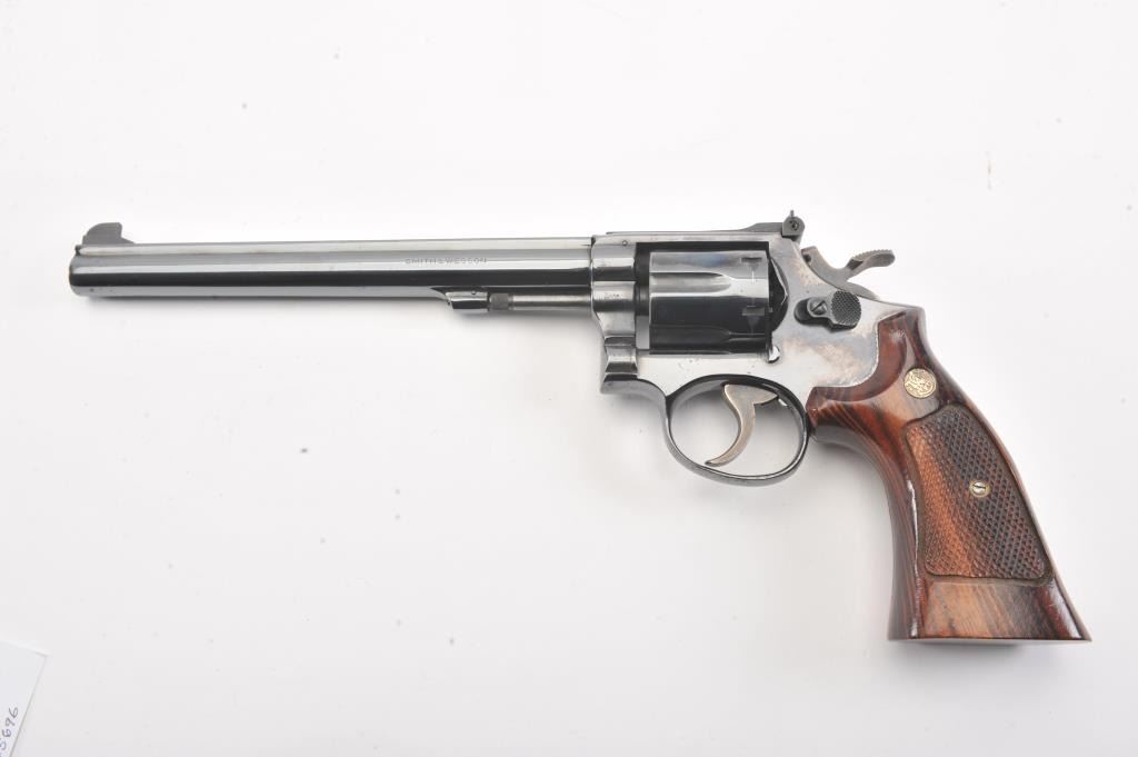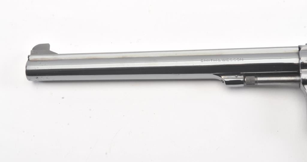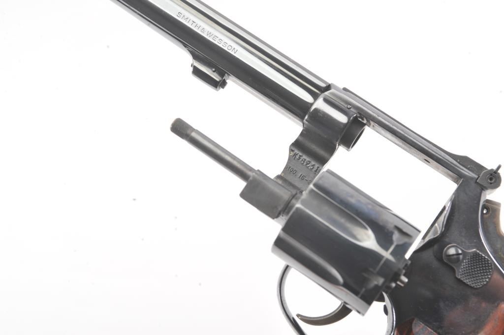 Smith & Wesson Model 15-3 Double Action Revolver, #3K38961, .38 Spec. cal., 8-3/8'' barrel, blue finish, factory checkered walnut grips with S&W medallions. Condition is excellent as modified with 2 holes drilled in the top of the barrel for a previous scope mount, with light thinning to finish in actioning areas. Grips and action are crisp, bore is bright. (Modern/PPT) Est.: $500-$1000.