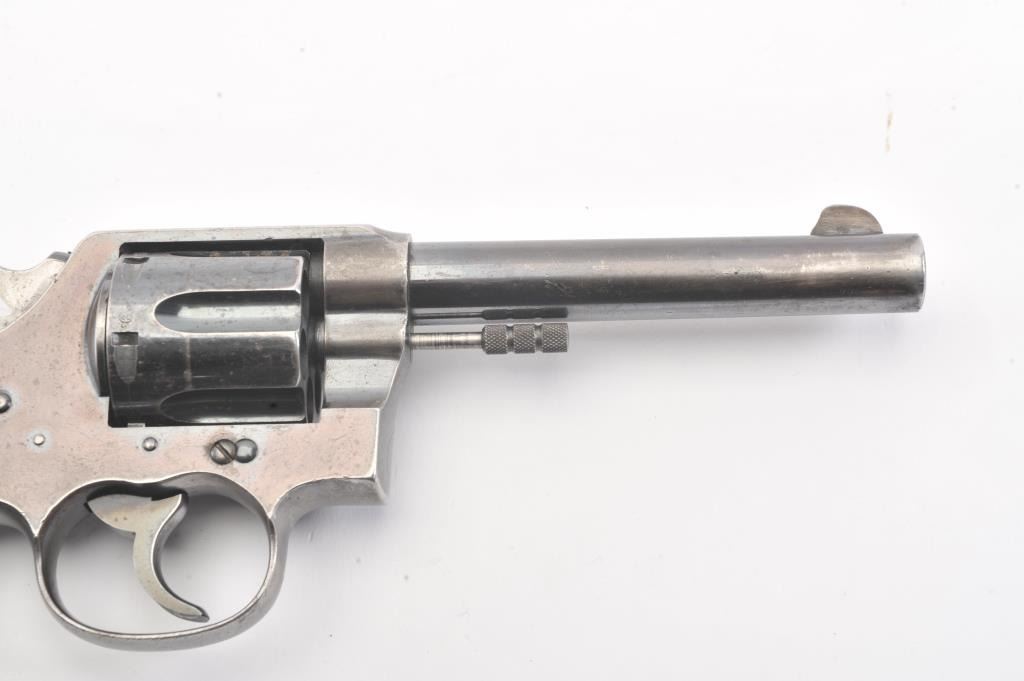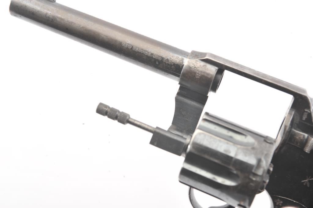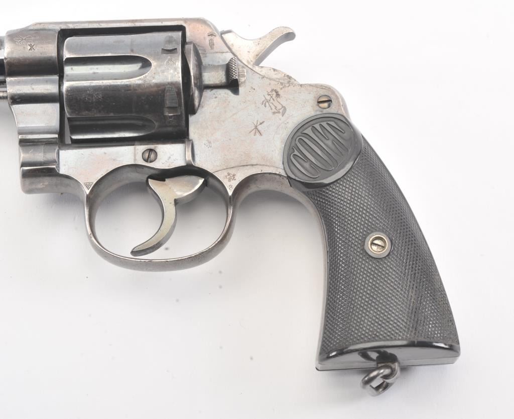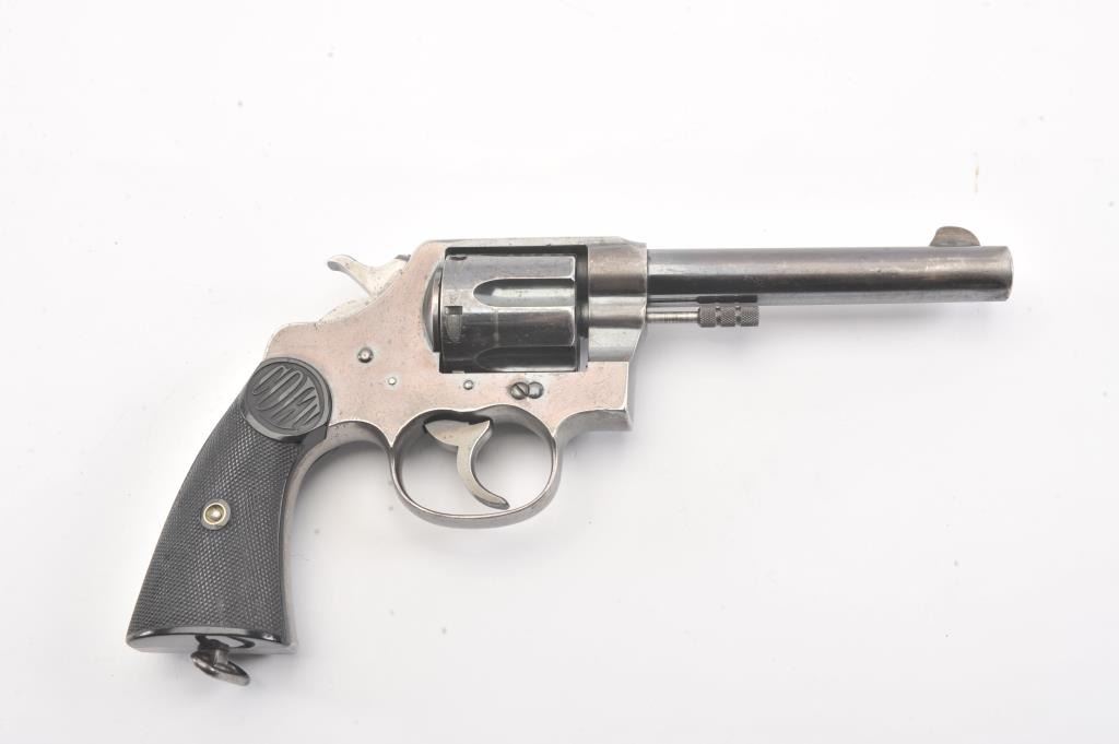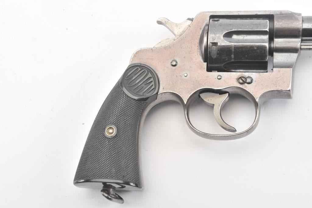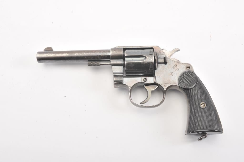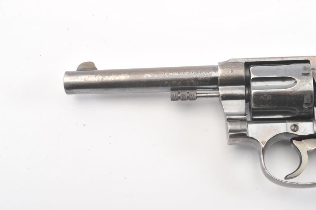 Colt New Service Double Action Revolver, #65396, .455 cal., 5.5'' barrel, blued finish, black hard rubber grips, blade front sight with notch rear sight. Stamped on top of barrel with Colt mfg. and patentinformation, left side of barrel with ''NEW SERVICE .455 ELEY'', and Rampant Colt symbol on left side of frame. ''COLT'' is molded into the top of each grip. Early flat cylinder latch and non-tapered barrel. Thereare numerous British Enfield Arsenal and Birmingham proof and view stamps on the frame and barrel, with British ''Opposing Arrows'' sale marks, and '' NOT ENGLISH MAKE'' export stamps. Condition overall is very good withapprox. 45%-50% finish remaining on the metal, with speckling on the barrel and cylinder and thinning on the topstrap and triggerguard. Grips are very good with scattered chips and flattening. Barrel isbright with very good rifling showing light frosting at the cone. Chambers in the cylinder are clean. Timing and lockup are smooth. (C&R/PPT) Est.: $500-1000