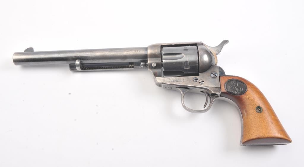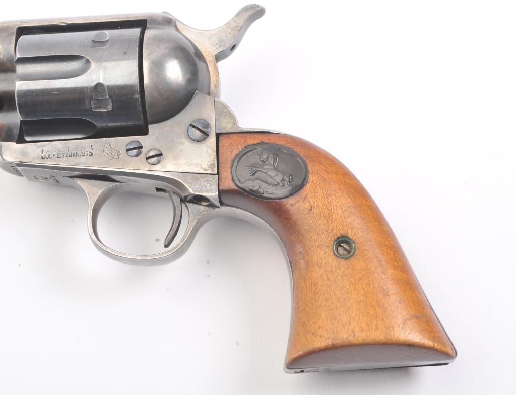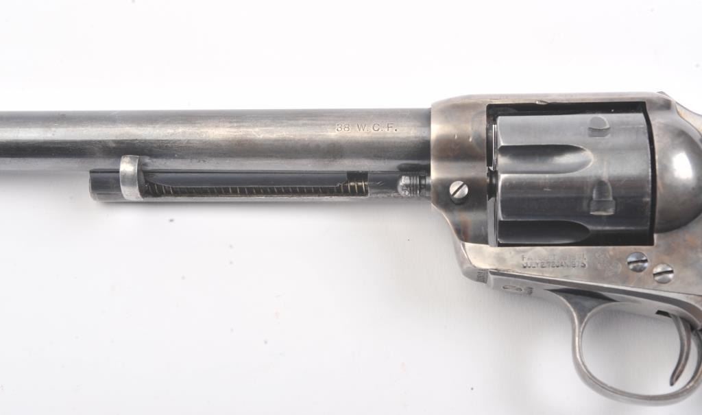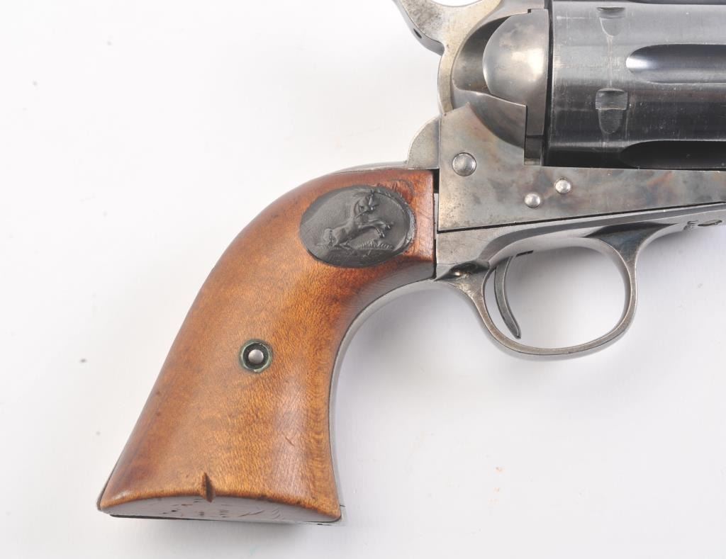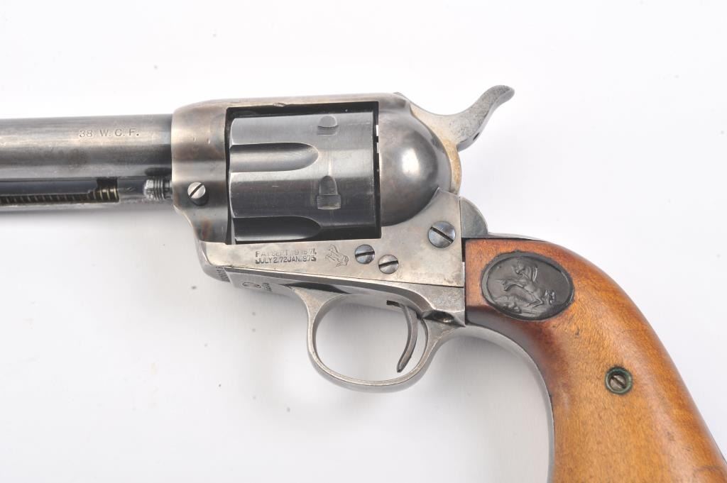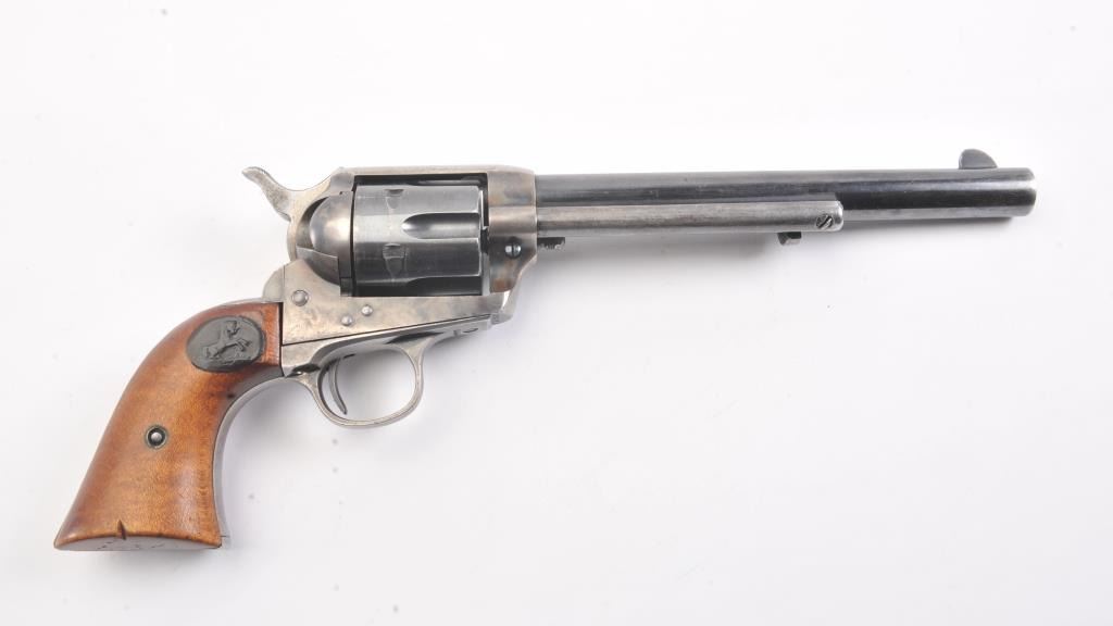 Colt Single Action Army revolver, .38 WCF caliber, Serial #193509. The pistol is blue and case hardened with a 7 ½” barrel made in 1900. The old, custom smooth wood grips feature inlaid Gutta Percha Rampant Coltemblems. The pistol retains approximately 60%-75% original blue on the barrel and cylinder with some cleaning and bright spots. The front sight has been slimmed slightly and the frame shows 30%-50% of the originalcase color which are muted on the left side and brighter on the right. The markings are good and the hammer is 2nd generation. The bore is good, all matching numbers and a good action. Of further note, there is an “R”behind the serial # which is a neat period stamp and the letters are factory offset to the left side of the frame and could possibly be factory markings. Est.: $900-$1,800. (C+R/PPT).