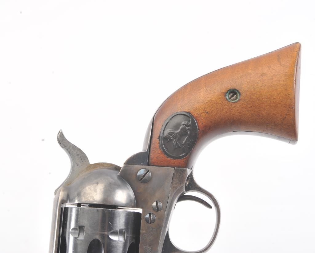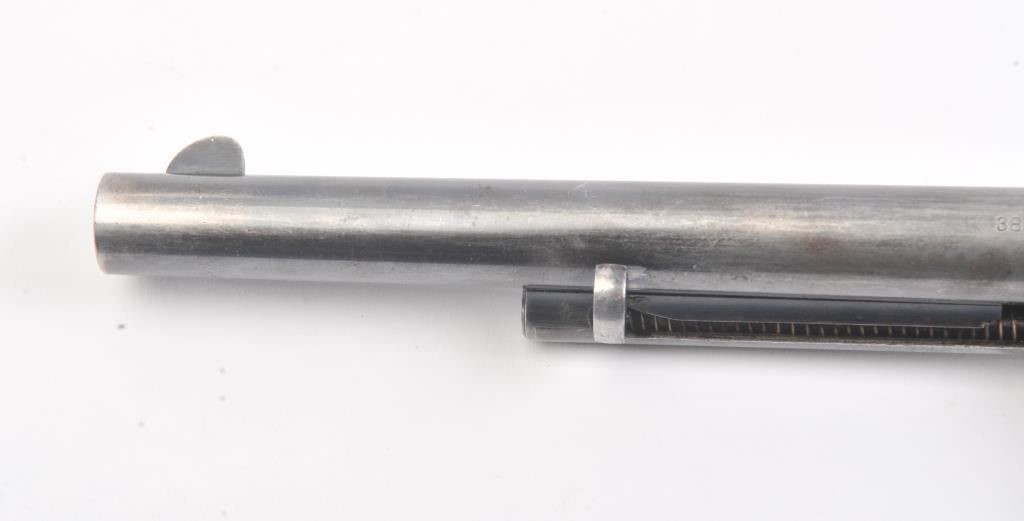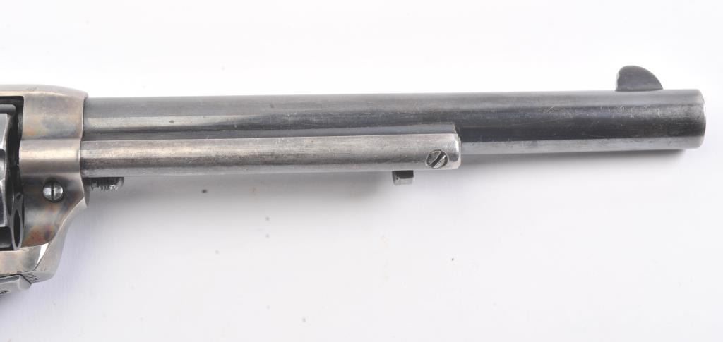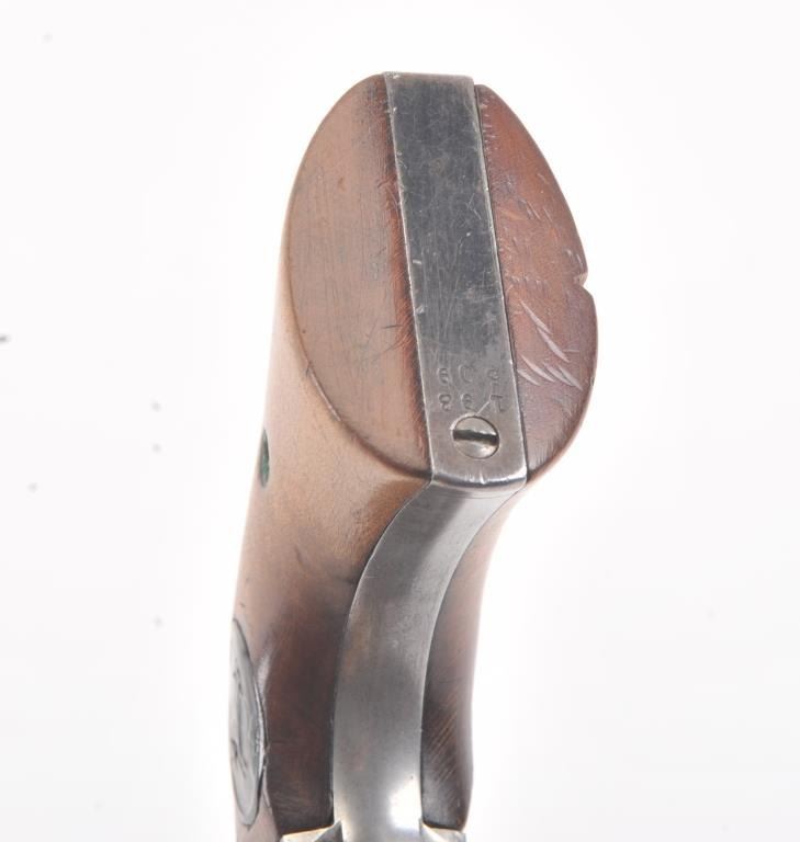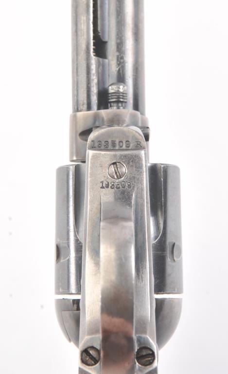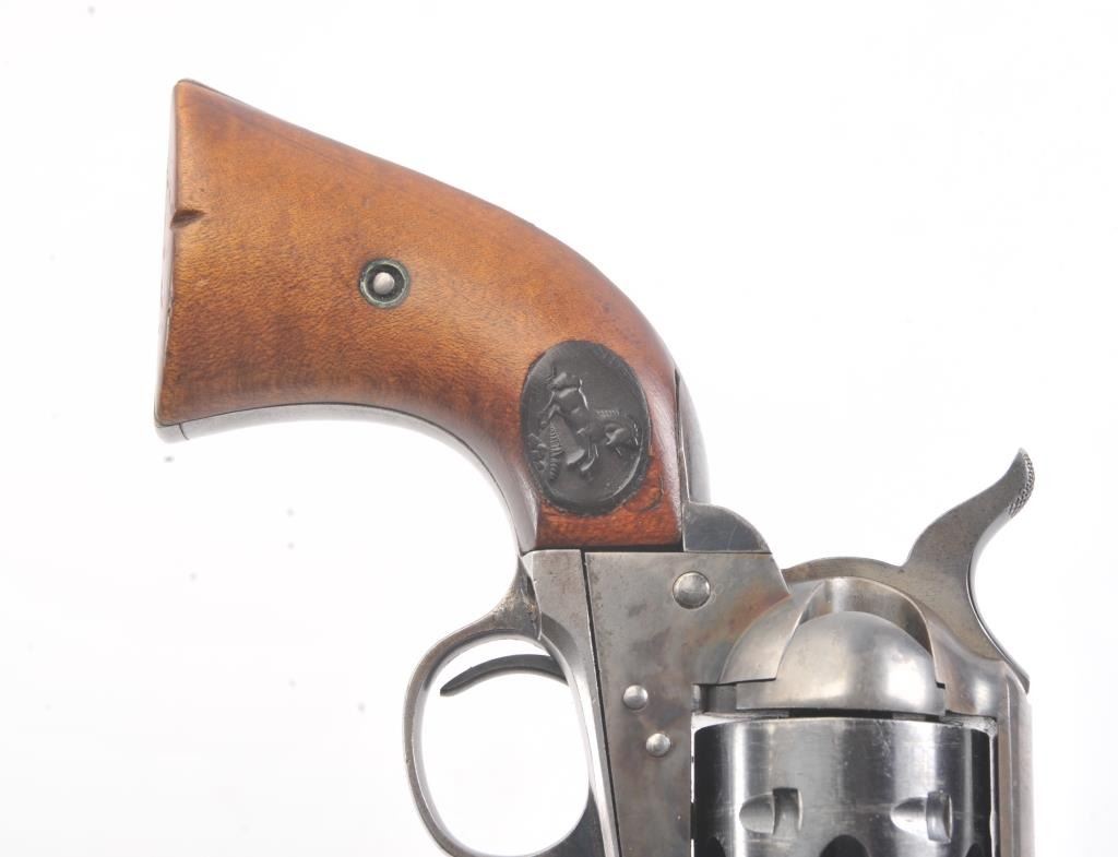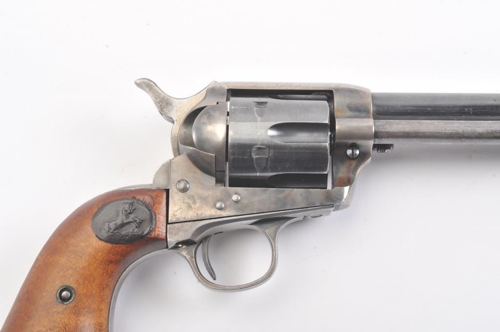 Colt Single Action Army revolver, .38 WCF caliber, Serial #193509. The pistol is blue and case hardened with a 7 ½” barrel made in 1900. The old, custom smooth wood grips feature inlaid Gutta Percha Rampant Coltemblems. The pistol retains approximately 60%-75% original blue on the barrel and cylinder with some cleaning and bright spots. The front sight has been slimmed slightly and the frame shows 30%-50% of the originalcase color which are muted on the left side and brighter on the right. The markings are good and the hammer is 2nd generation. The bore is good, all matching numbers and a good action. Of further note, there is an “R”behind the serial # which is a neat period stamp and the letters are factory offset to the left side of the frame and could possibly be factory markings. Est.: $900-$1,800. (C+R/PPT).