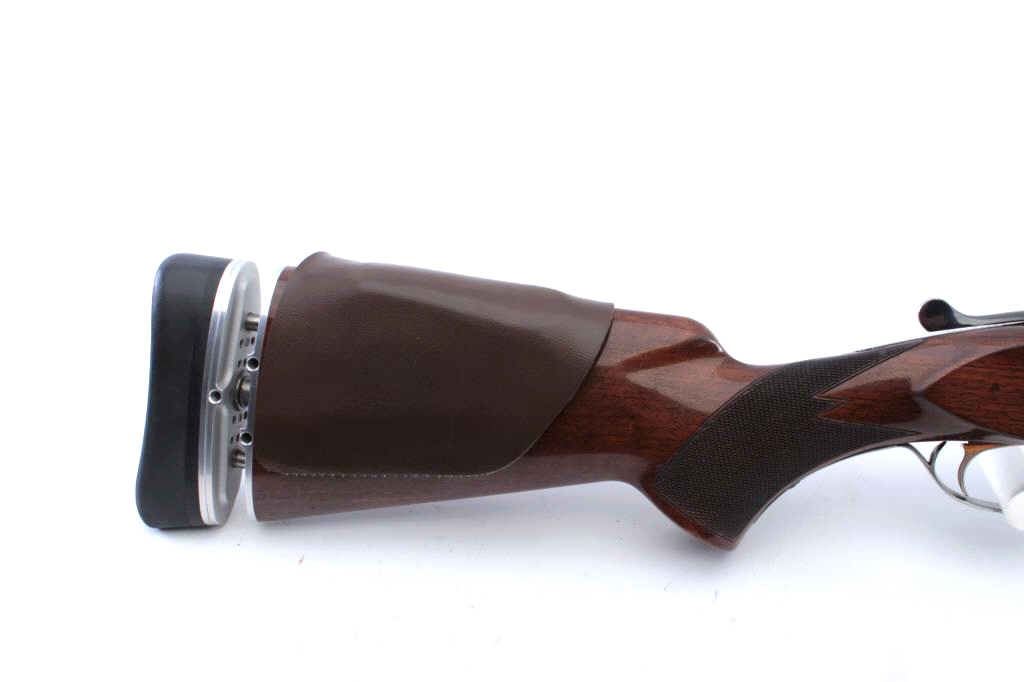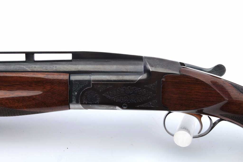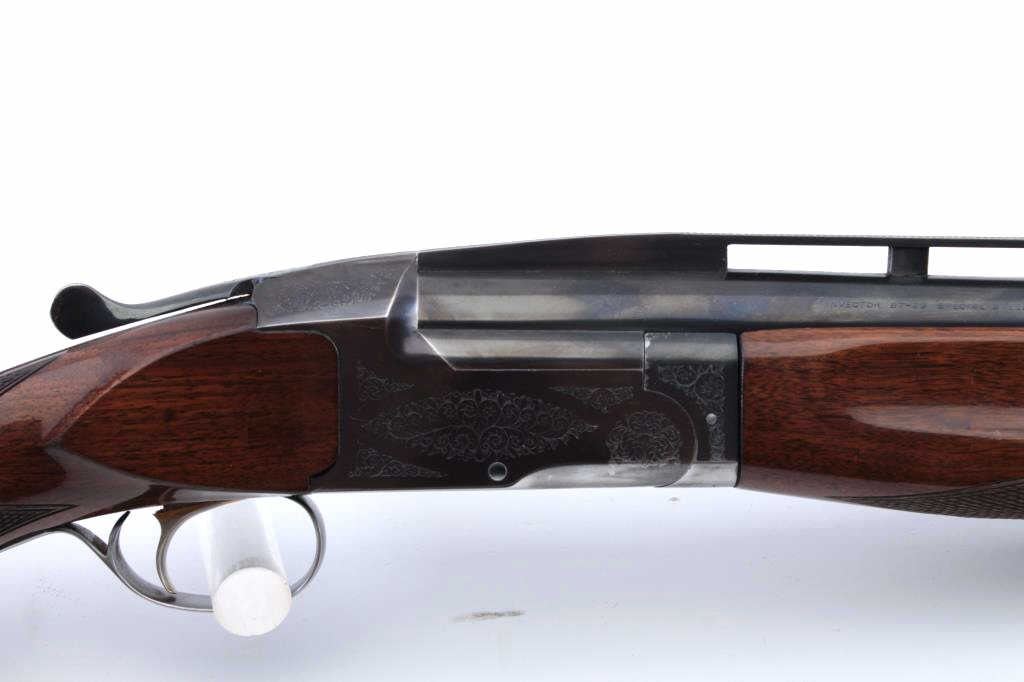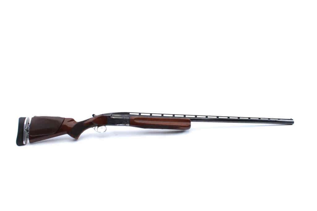 Browning Model BT-99 single shot trap shotgun, 01071PT199, 12 gauge, 34” ventilated rib barrel, blued finish, checkered wood stocks, with a hydraulic recoil system with black rubber butt pad. Overall very good tofine condition with majority of original blued finish remaining, very good to fine bore, crisp action, sharp markings and engraving to receiver, near fine wood stocks with small chip on left side of the stockwhere it meets the receiver. In Browning hardcase. (Modern/PPT). Est.: $700-1400.