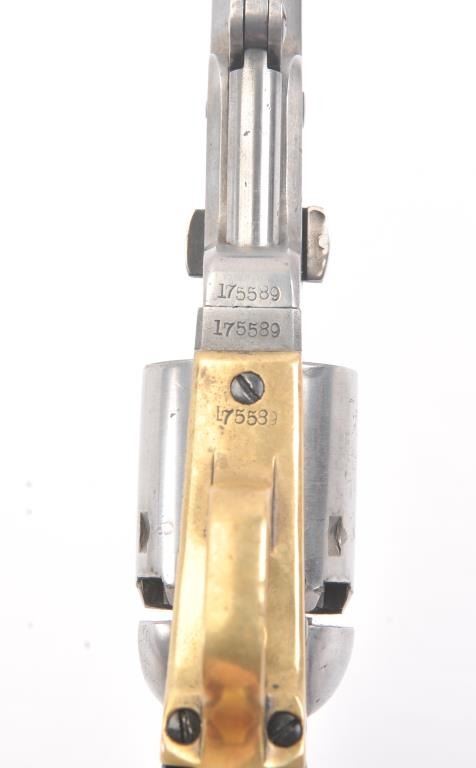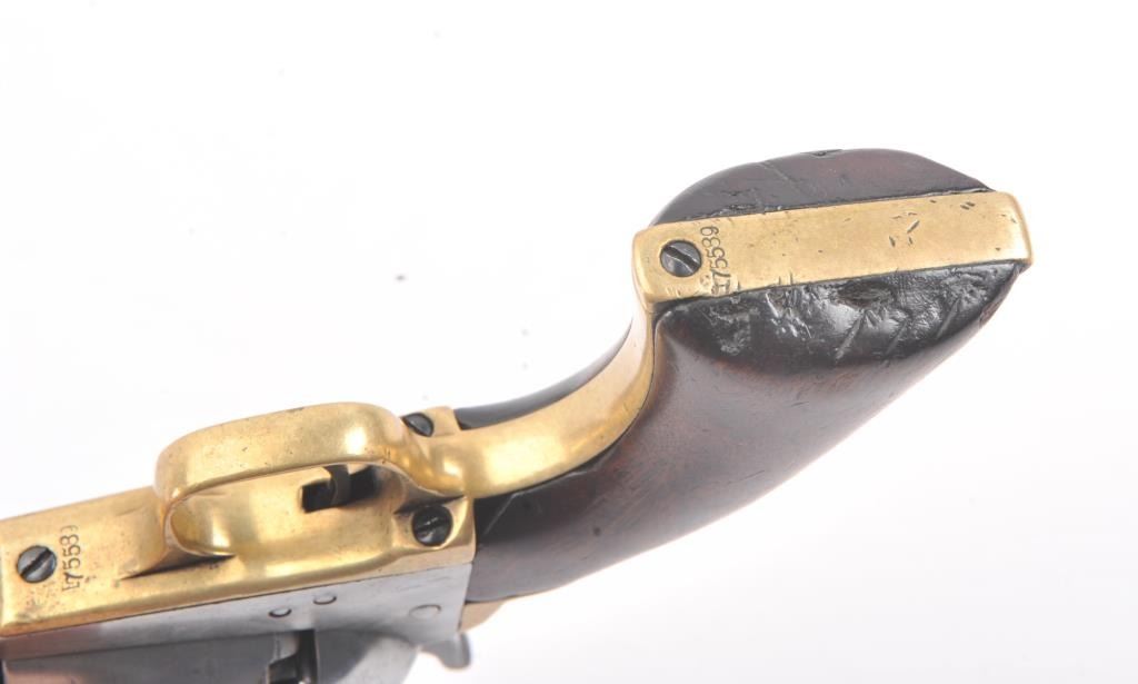 Colt 1851 Navy percussion revolver, .36 caliber, Serial #175589. The pistol is in good overall condition with a 7 ½” octagon barrel. The pistol has been polished bright with sharp edges showing no original finish. The barrel address is crisp as is the “COLTS PATENT” on the frame and all visible serial numbers are matching. Unfortunately, the cylinder scene is gone with the serial number still visible. The brass straps have takenon a pleasing patina. The smooth wood grips are good with some knackering at the base. The action functions well and locks up tight on this Navy, circa 1864. Est.: $600-$1,200. (Antique).