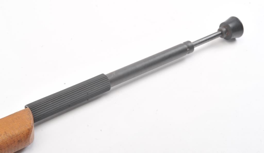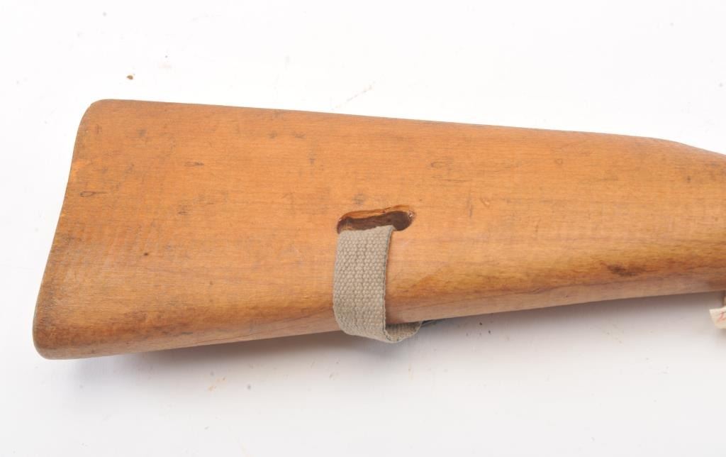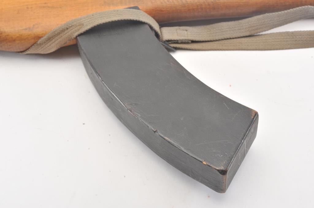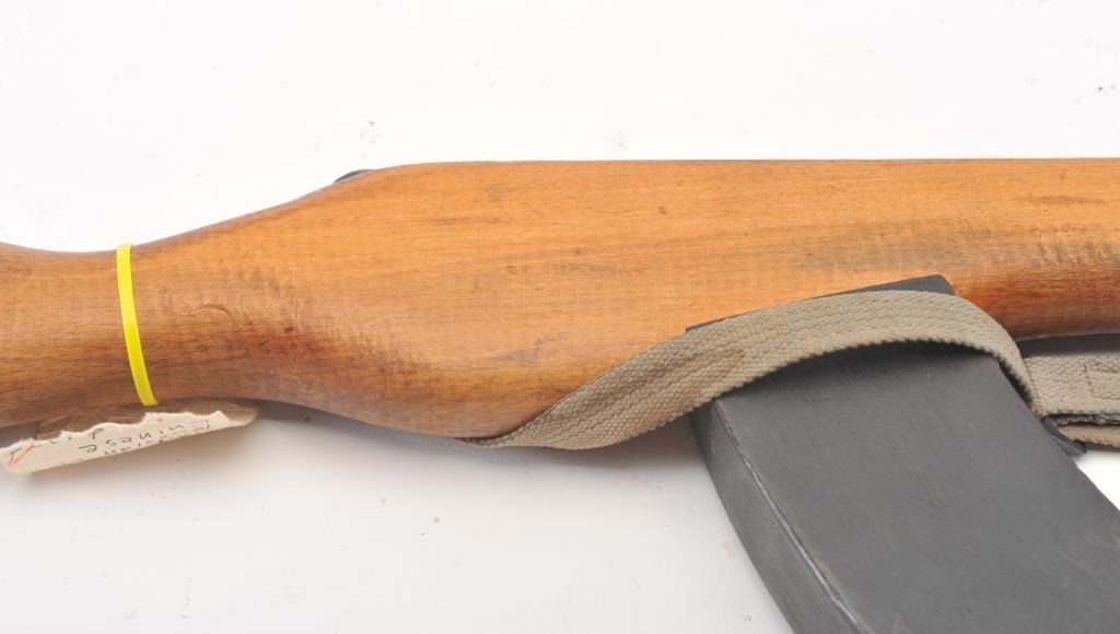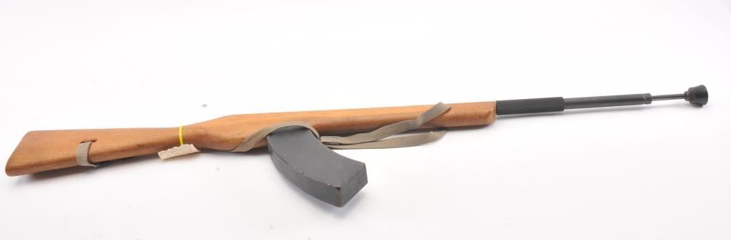 Cold War era replica AK-47 prop or training rifle with spring loaded bayonet assembly. The non-firing replica is marked, “Modell 4 853” on top of the barrel. The “Bayonet” is a spring loaded plunger. The wood stock andextended magazine are all one piece along with a period canvas sling. Est.: $125-$250.