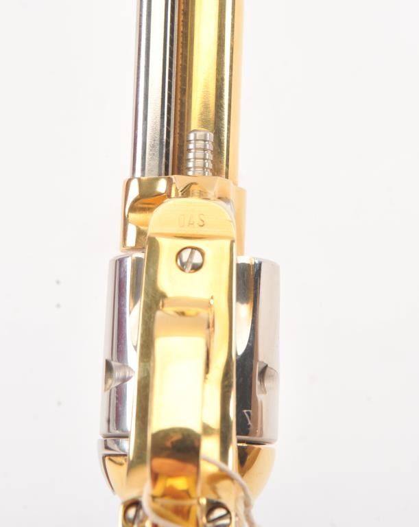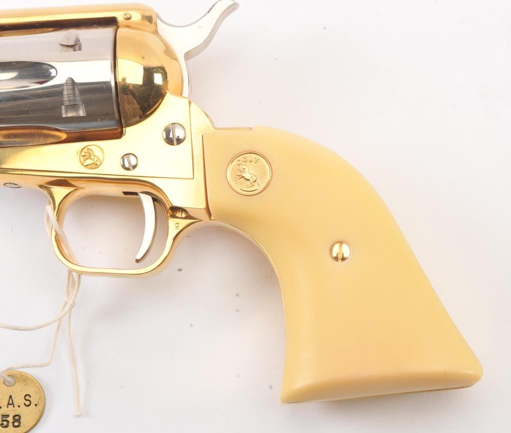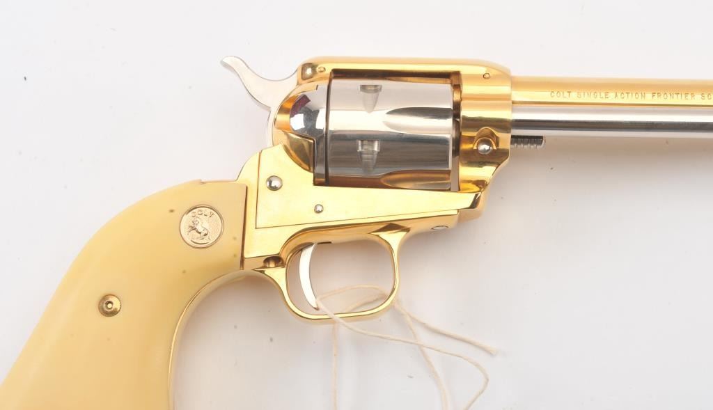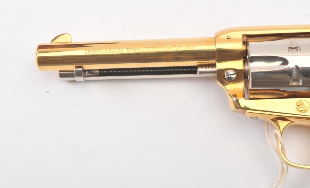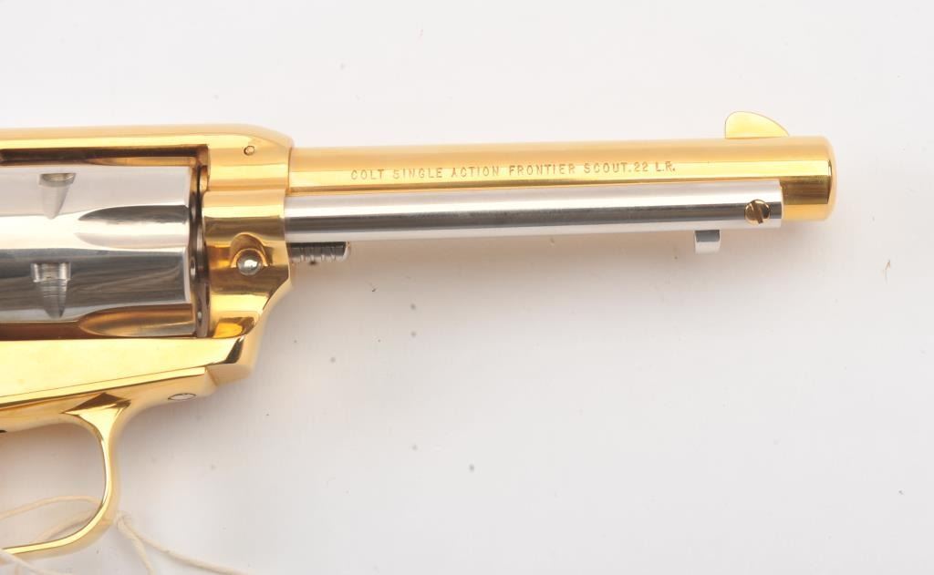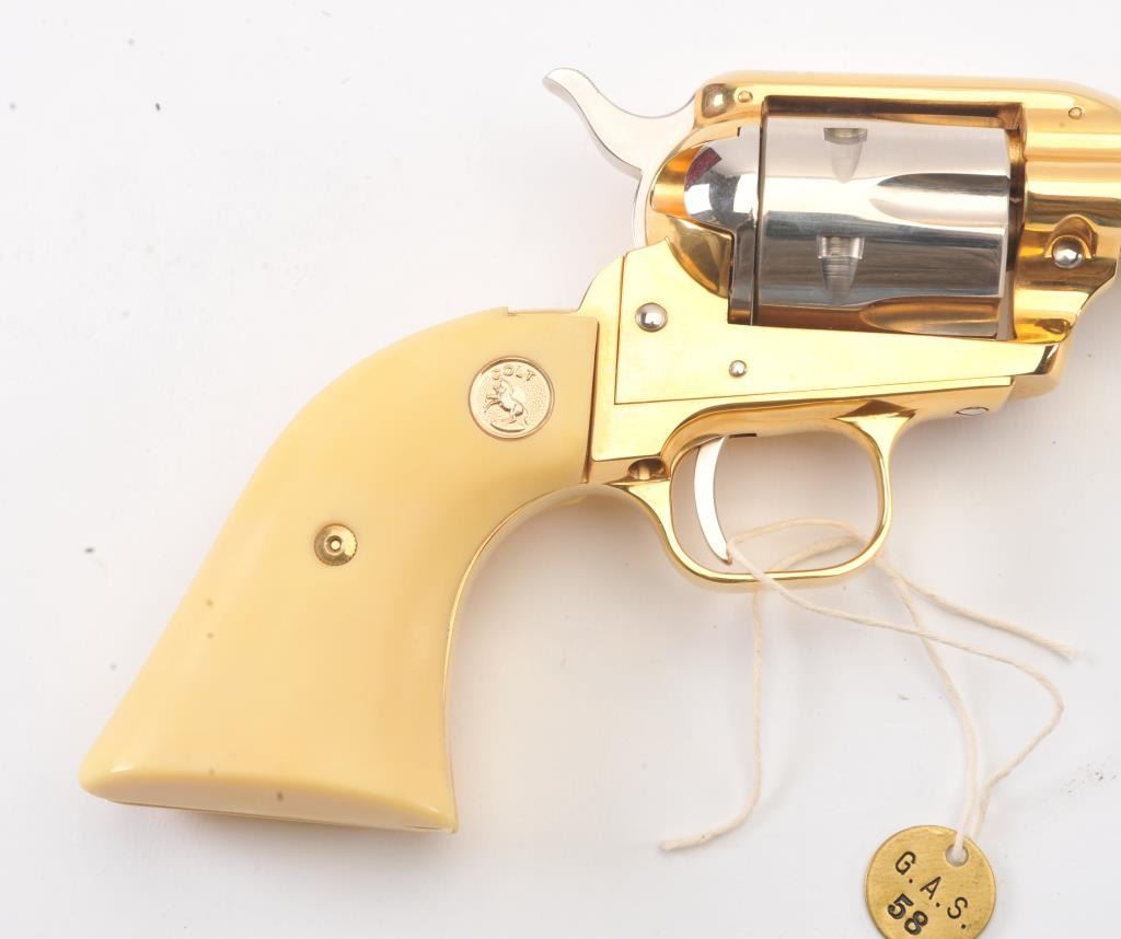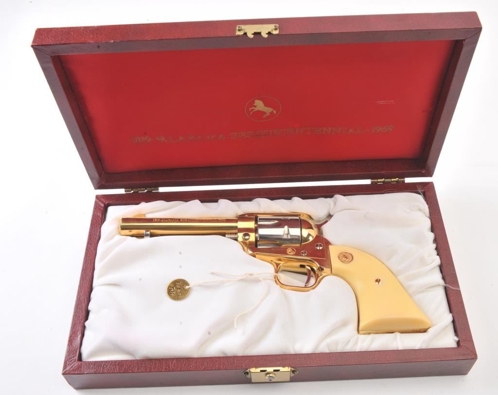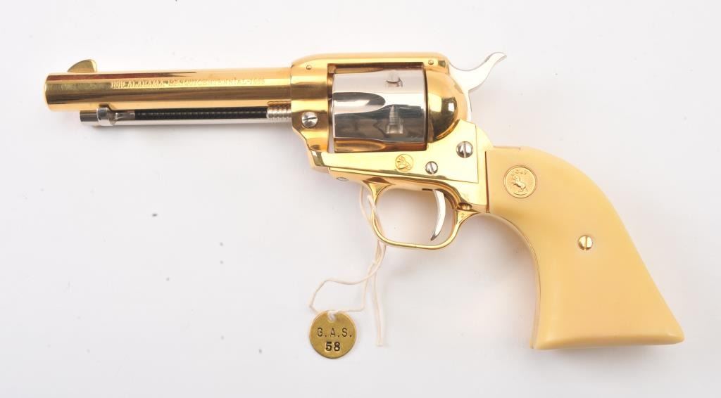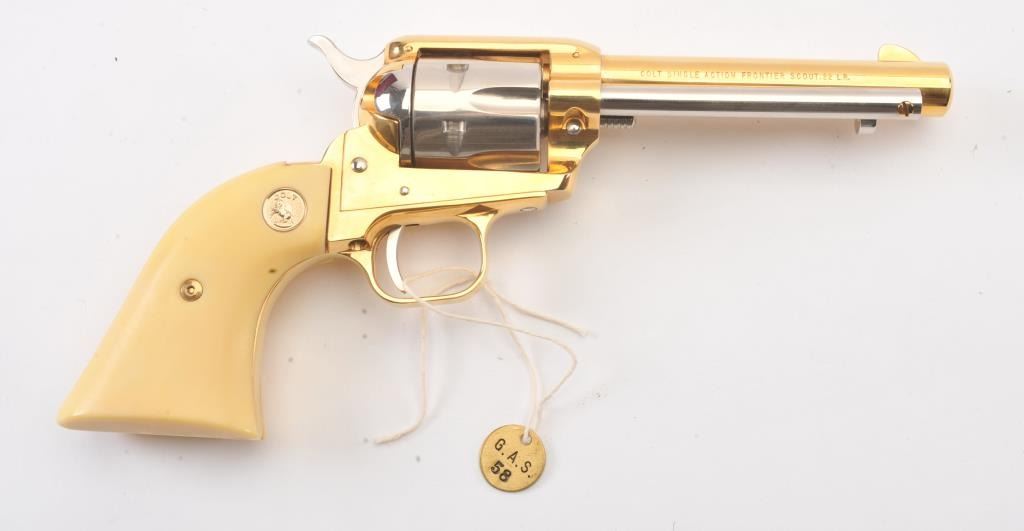 Colt Alabama Sesquicentennial (1819-1969) Frontier Scout Model SAA revolver, .22LR caliber, 4.75” barrel, gold finish with nickel finish accented cylinder, hammer, cylinder pin and ejector housing, faux ivoryColt medallion grips, S/N OAS; like new condition in factory lined presentation leather covered wood case; from the famous George A. Strichman collection with his brass collection tag attached (G.A.S./58).Strichman was the former Chairman of Colt Industries (1962-1985). (C&R/PPT). Est.: $750-$1,500.