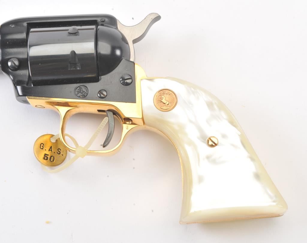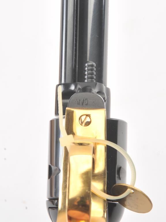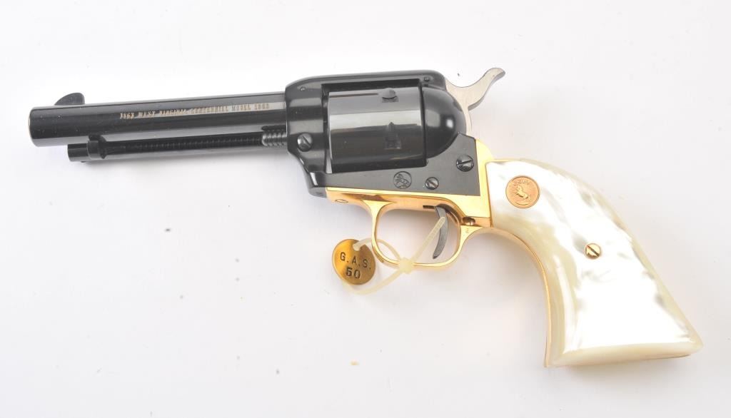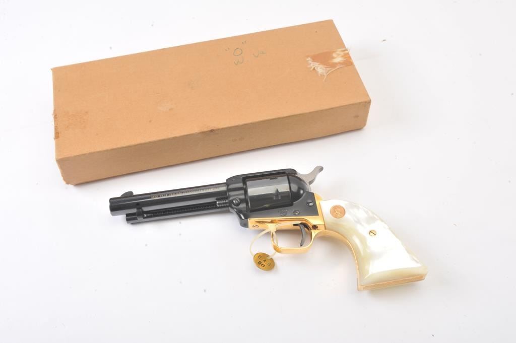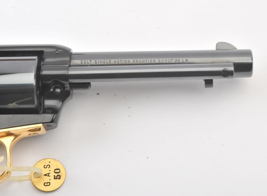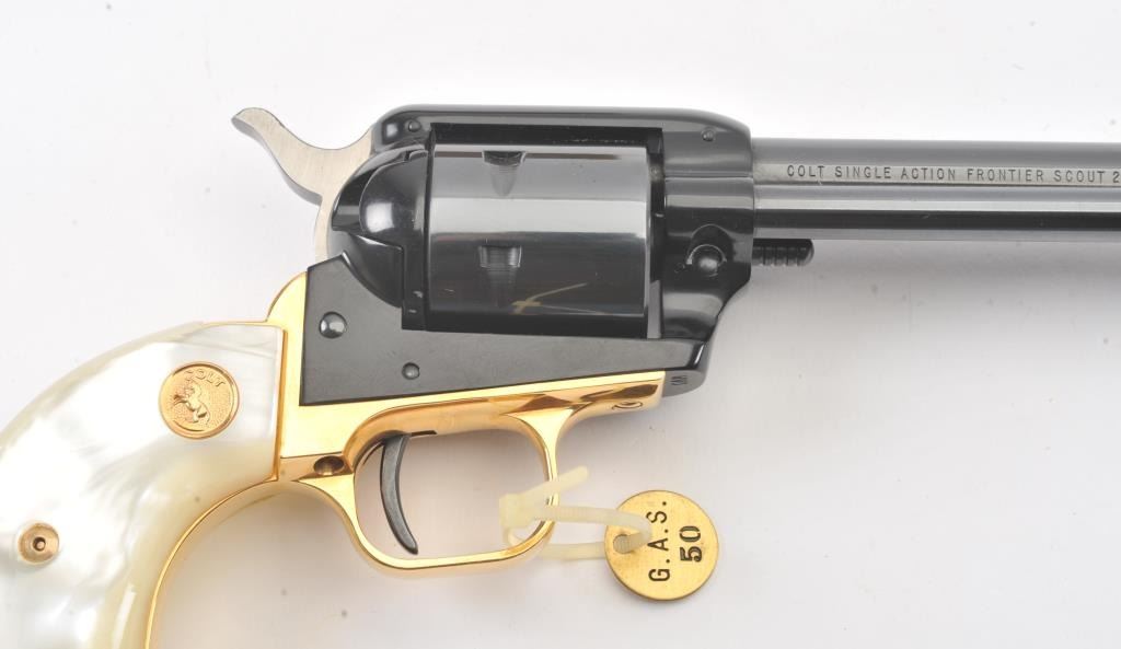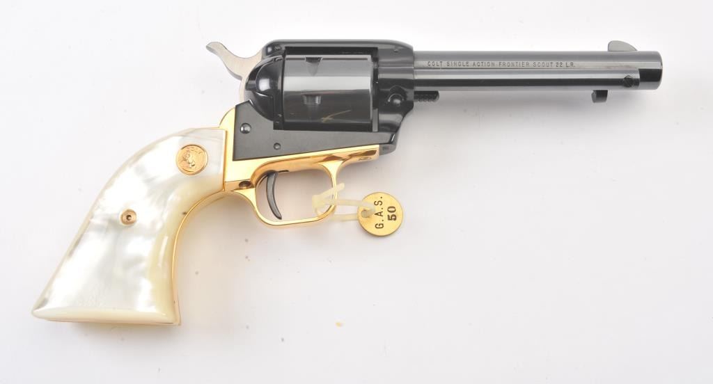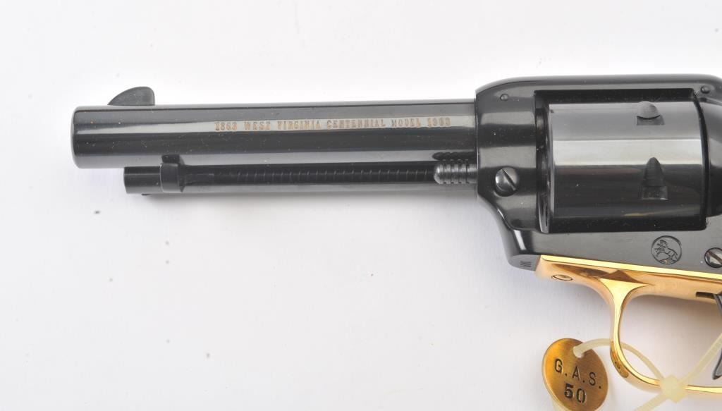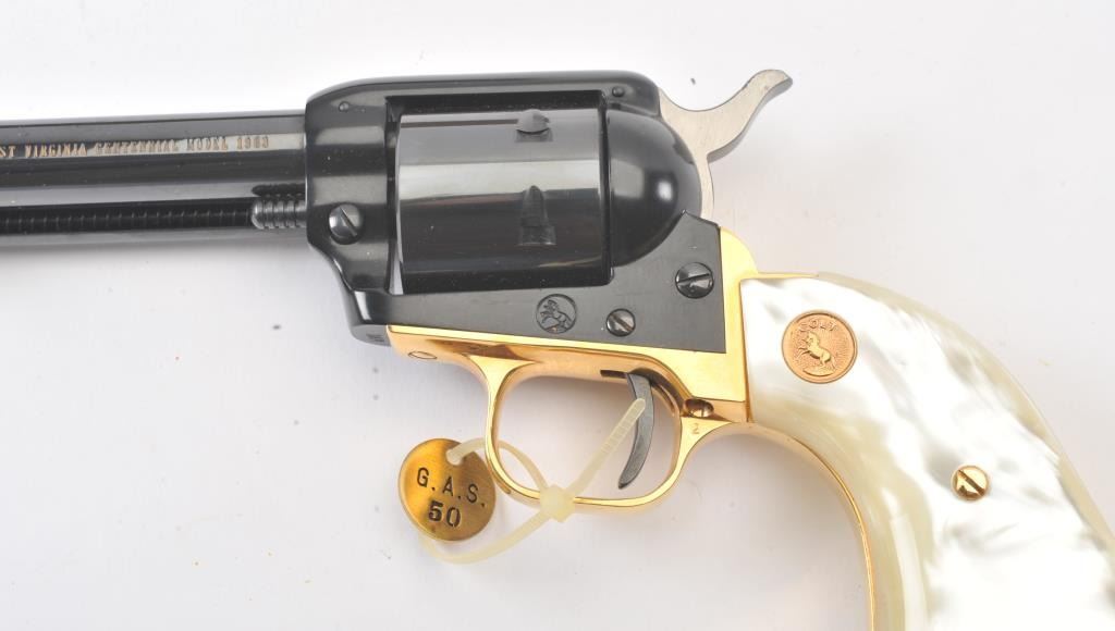 Colt West Virginia Centennial (1863-1963) Frontier Scout Model SAA revolver, .22LR caliber, 4.75” barrel, blued finish with gold accent straps, faux pearl Colt medallion grips, S/N WV0; like new condition in twopiece cardboard box with instructions and from the famous George A. Strichman collection with his brass collection tag attached (#50). Strichman was the former Chairman of Colt Industries (1962-1985). (C&R/PPT). Est.: $750-$1,500.