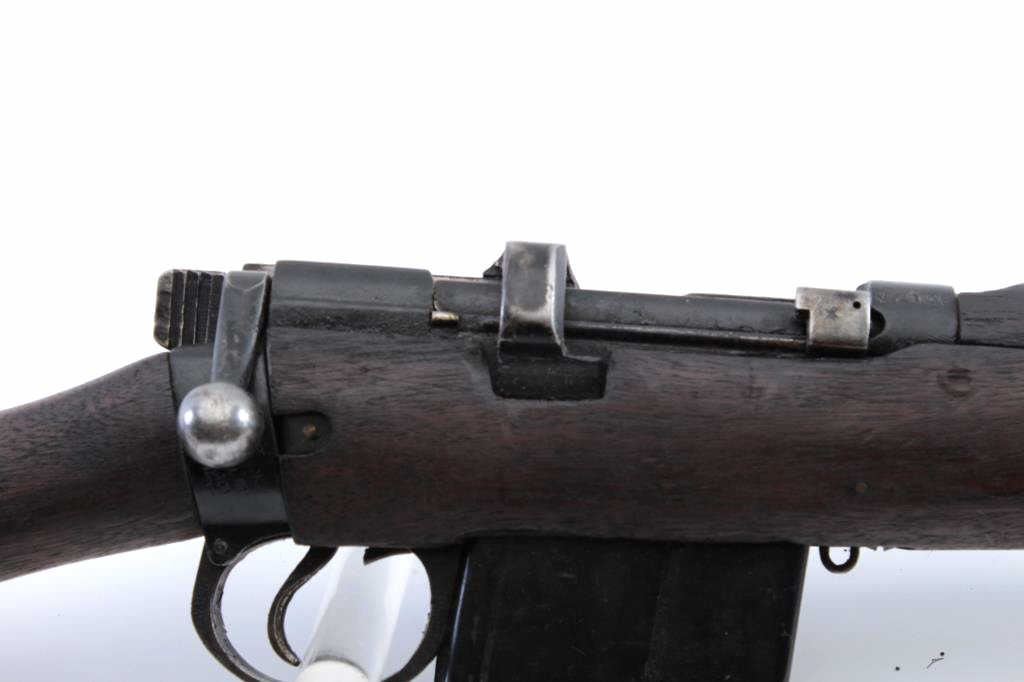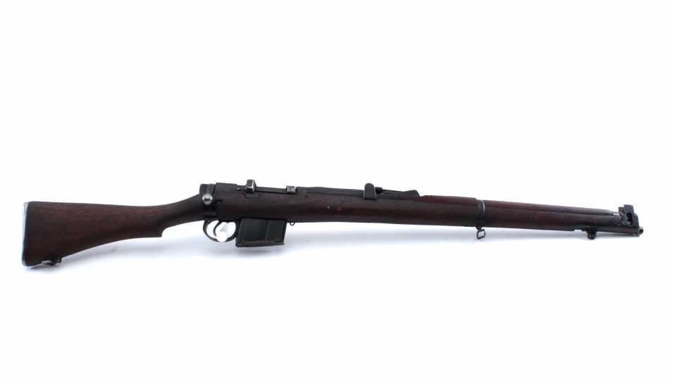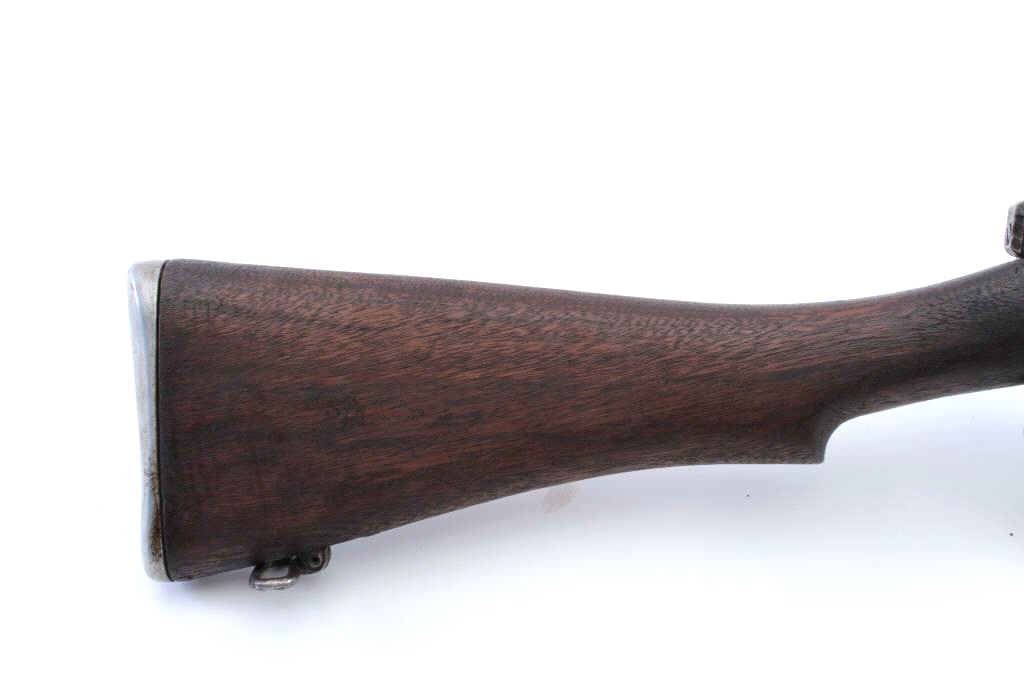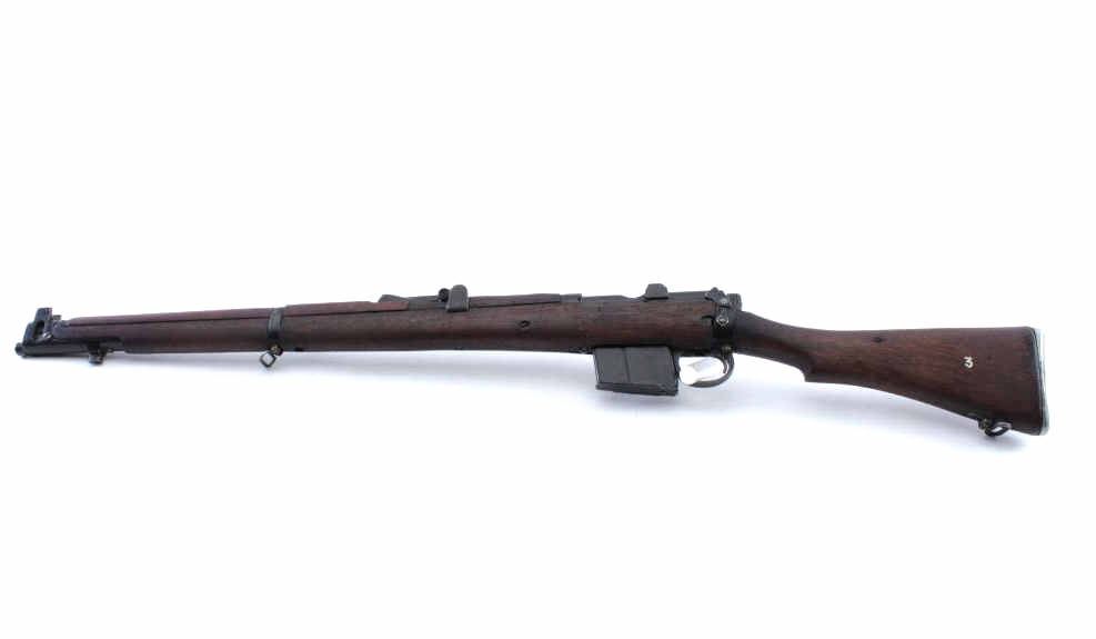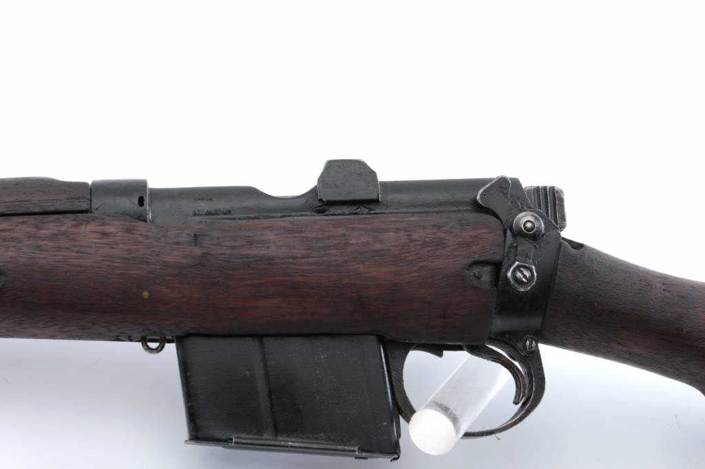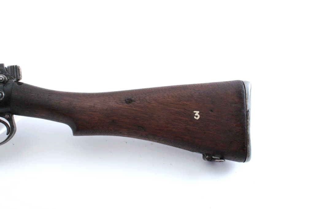 Lee Enfield No. 1 Mk IV bolt action rifle, .308 caliber, Serial #V2138. The rifle is in good overall condition with a 25” barrel. The pistol retains a significant amount of its blackened military finish with importmarks on the left side of the action and dated 1967 at the wrist strap. Additionally, the strap is marked, “RFI” and indicates the caliber is 7.62 mm. The smooth wood stock is in fair condition with mars and dentsconsistent with service use. The bore is fair, the action is crisp and the markings are sharp. Est.: $250-$500. (C+R).