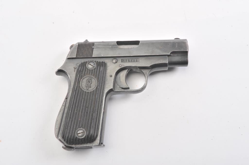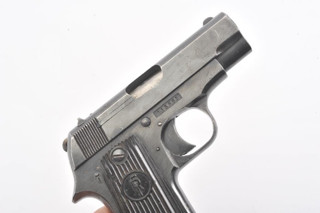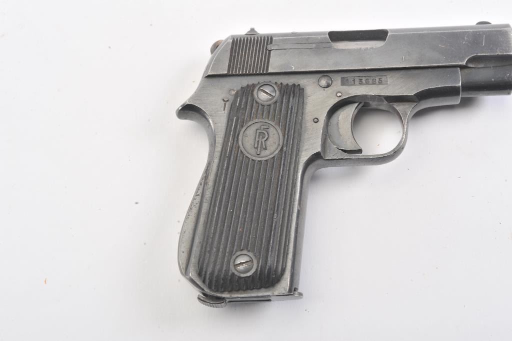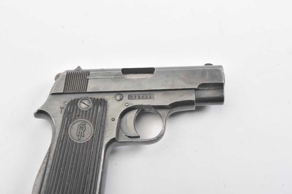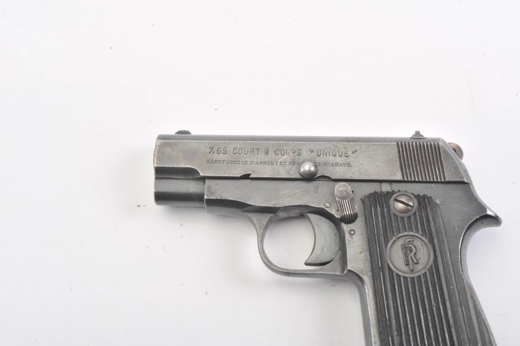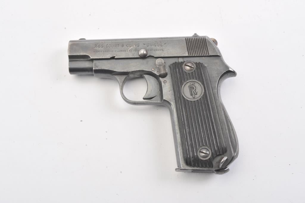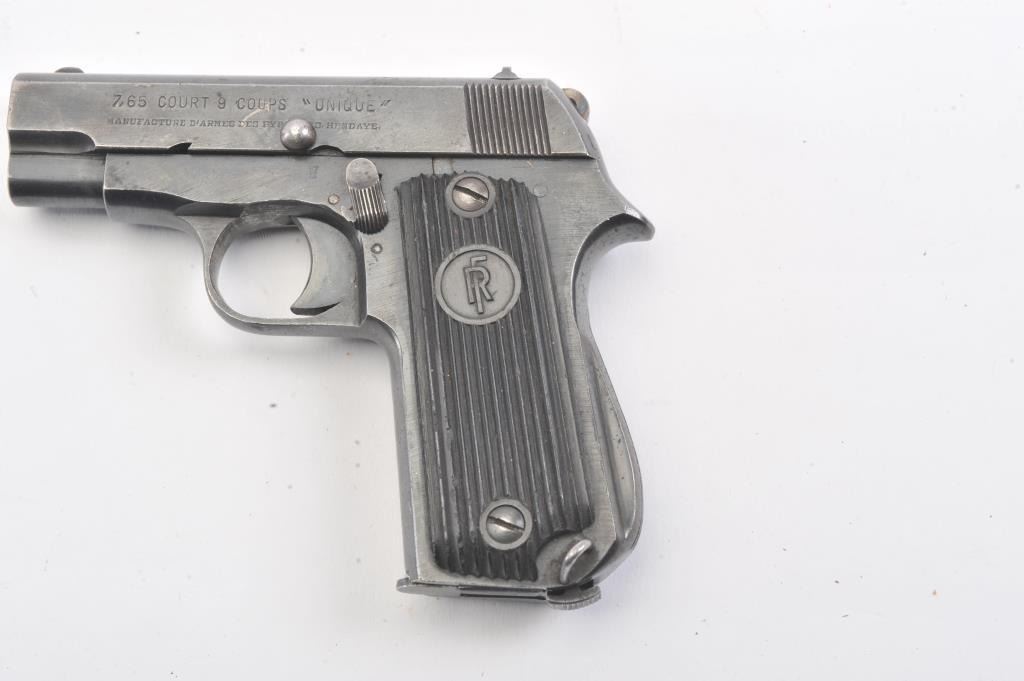 French Court 9 Coups “UNIQUE” semi-automatic pistol, 7.65mm caliber, Serial #113685. The pistol is in good overall condition with the majority of its blue finish with high point edge wear. The ribbed plastic grips are ingood condition. The bore is fair, the action is crisp and the markings are sharp. The lot includes one correct magazine. The pistol is reminiscent of a Browning Model 1906. Est.: $250-$500. (C+R/PPT).