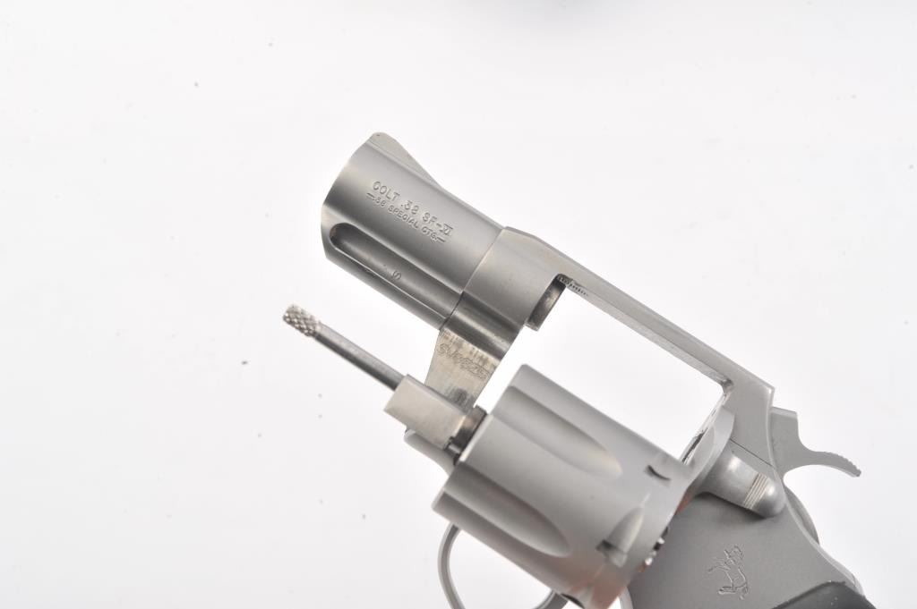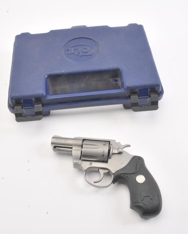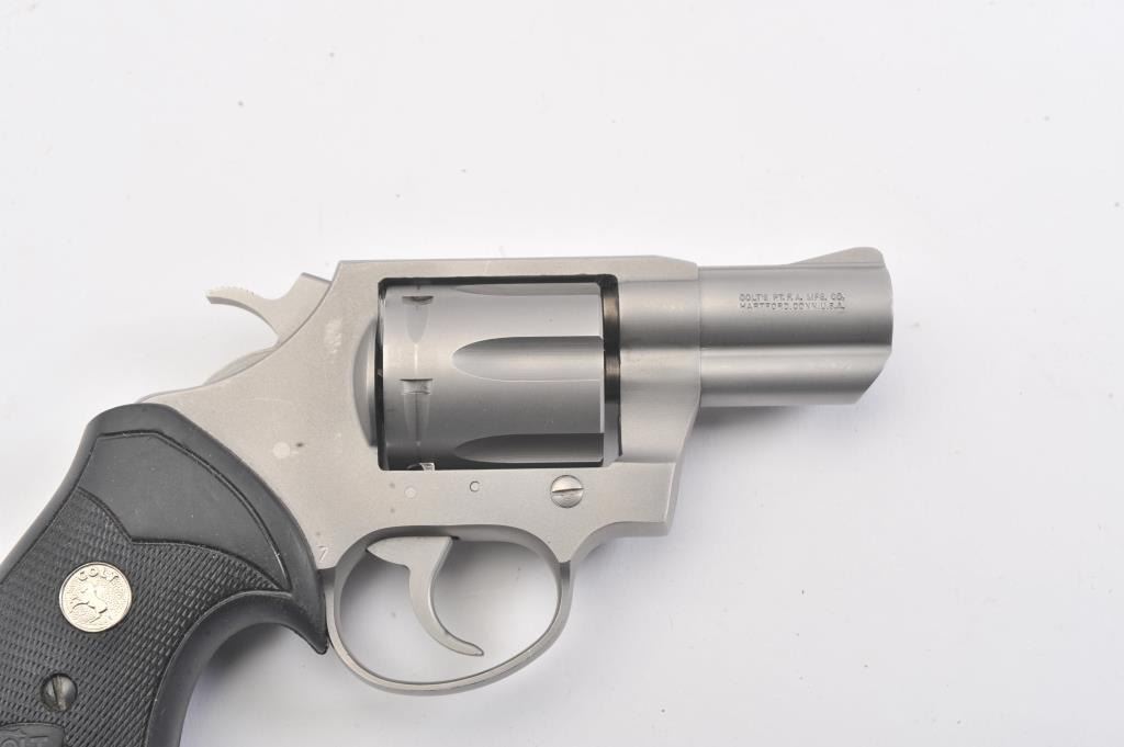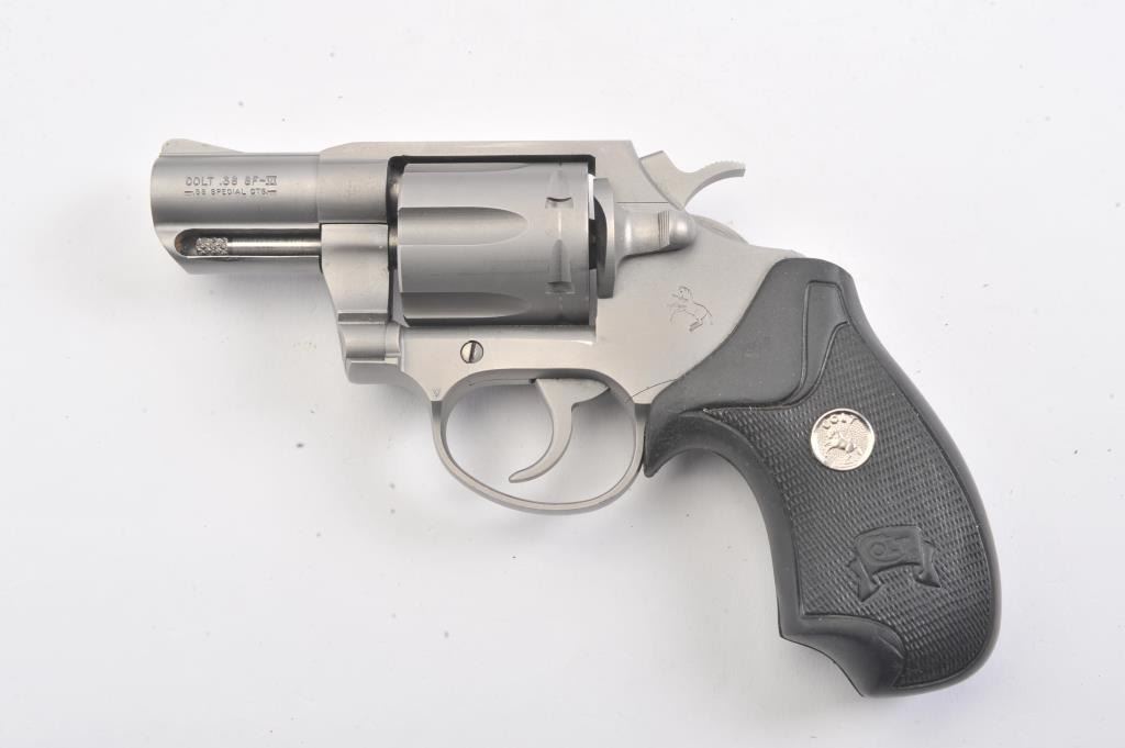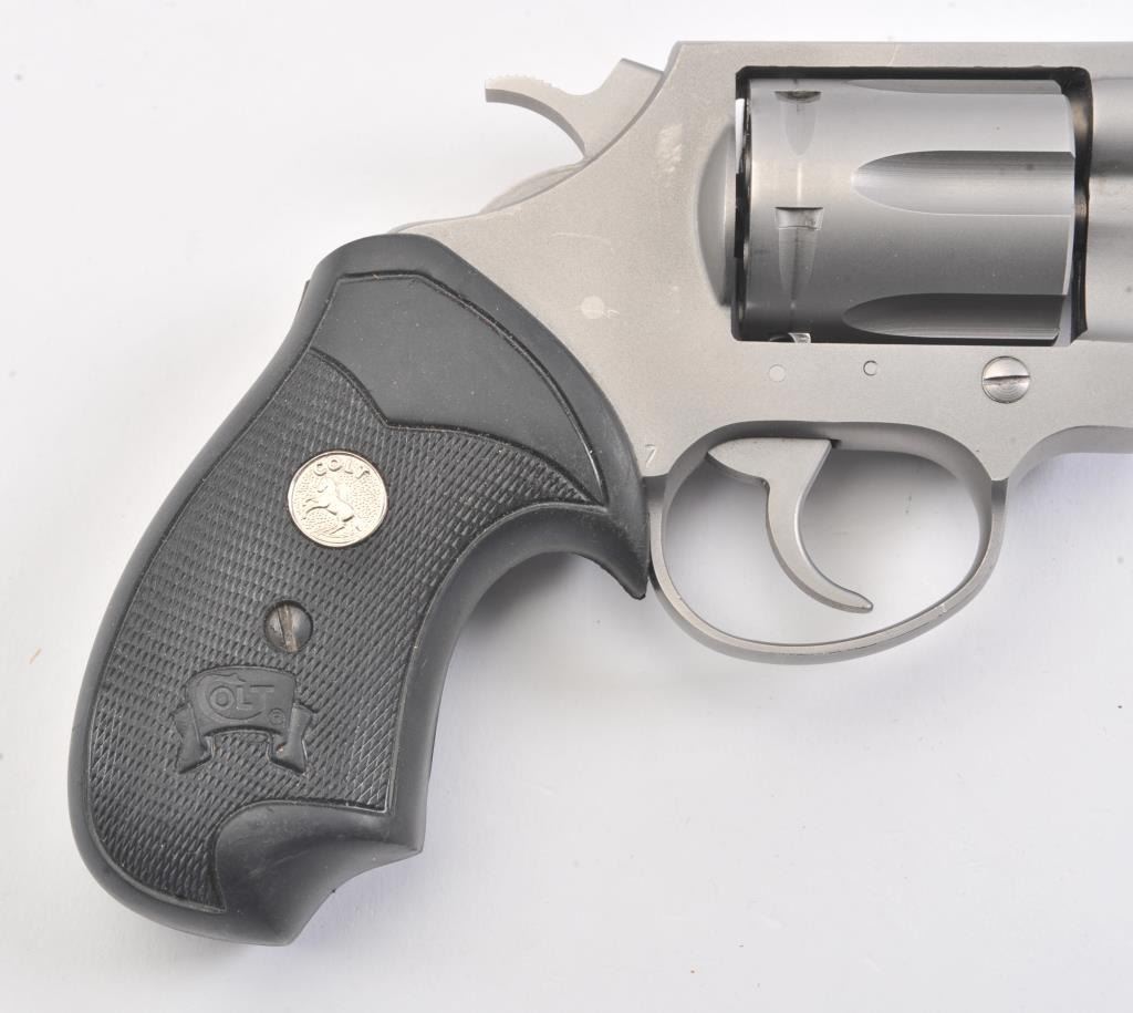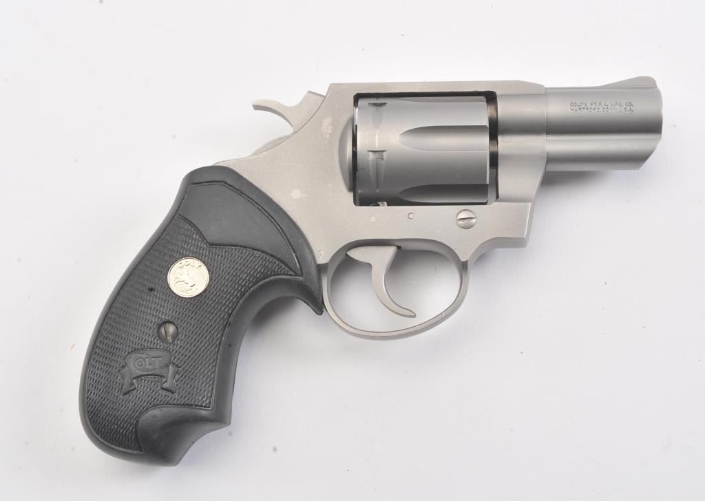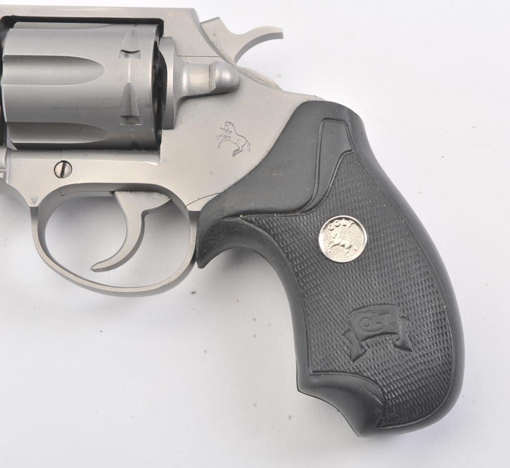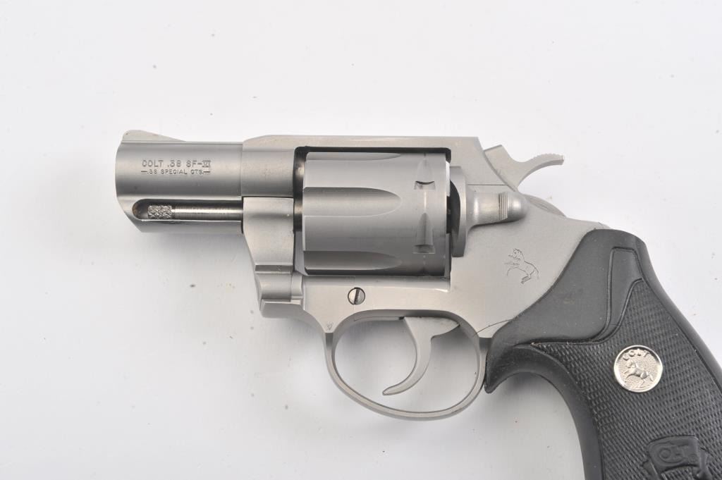 Colt SF-IV Double Action revolver, .38 Special caliber, Serial #SV0825. The pistol is in excellent overall condition with a 2” barrel. The pistol retains nearly all of its matte stainless steel finish with a lightdrag line on the cylinder. The checkered rubber medallion combat grips are in very good condition, showing little use. The pistol comes in the factory blue plastic case with the safety and instruction manual. The bore is good, the action is crisp and the markings are sharp. Est.: $500-$1,000. (Modern/PPT).