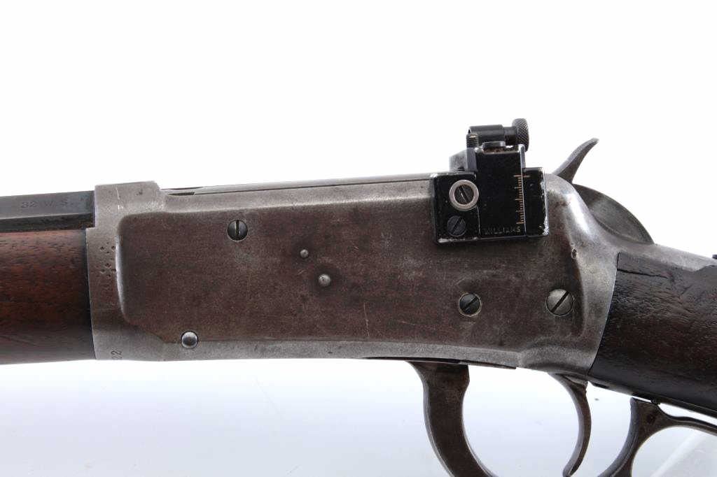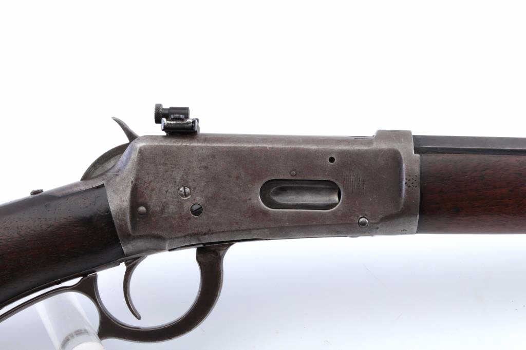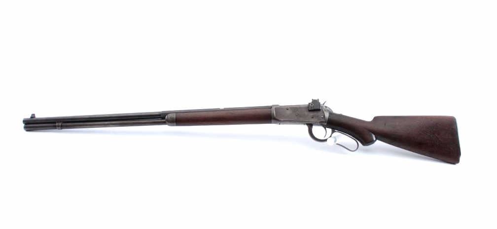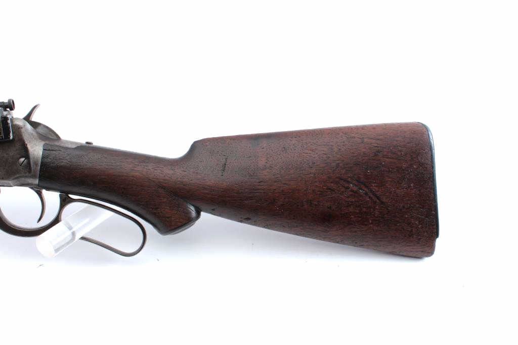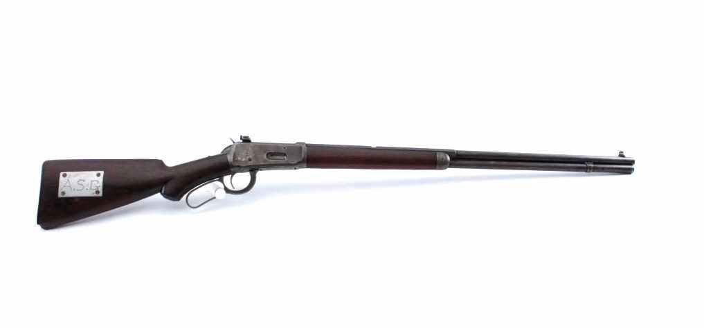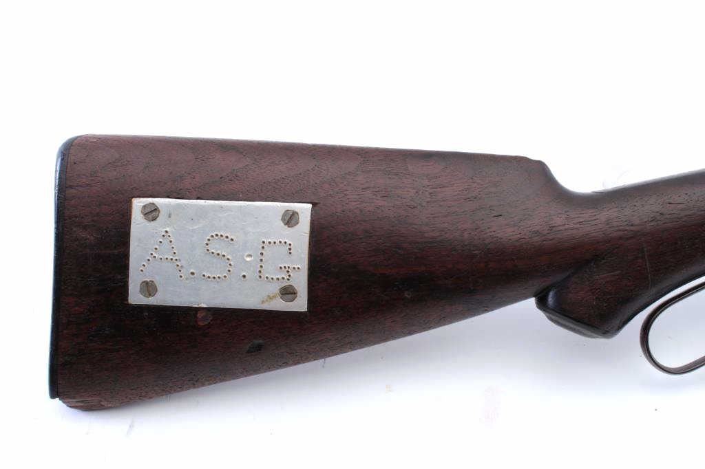 Winchester Model 1894 Special Order rifle with 26” round barrel, full mag, plain pistol grip stock with hard rubber butt plate, S/N 437222. Lyman receiver sight added and top of frame cut with groove for sighting purposes(Not well done). The butt plate is chipped at the toe. Large white metal plaque screwed into right buttstock marked “A.S.G.” in punch dot pattern. Fair to good overall with traces of blue and good markings. The actionis good and the bore is good. Front sight is a replacement in original dovetail. Should restore well. (C&R) Est.: $600-$1200