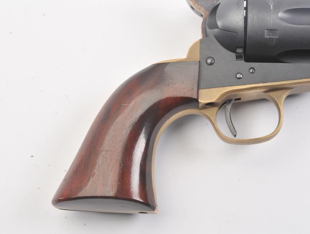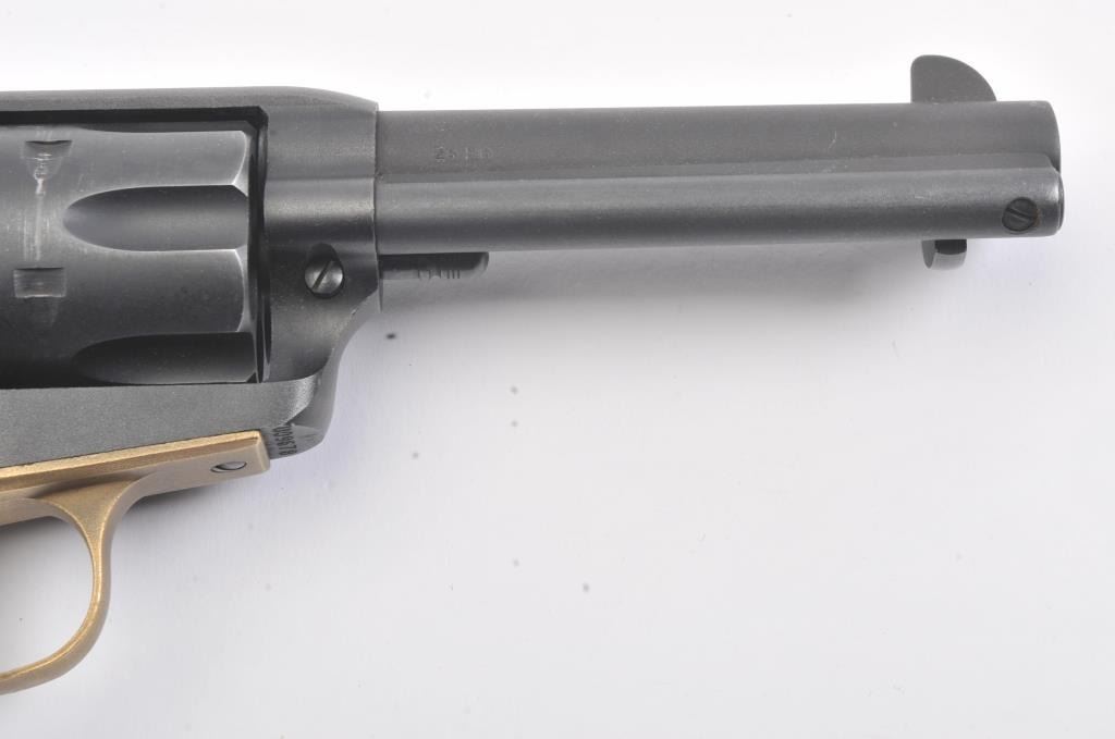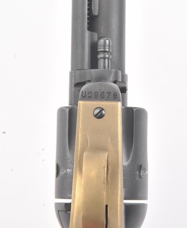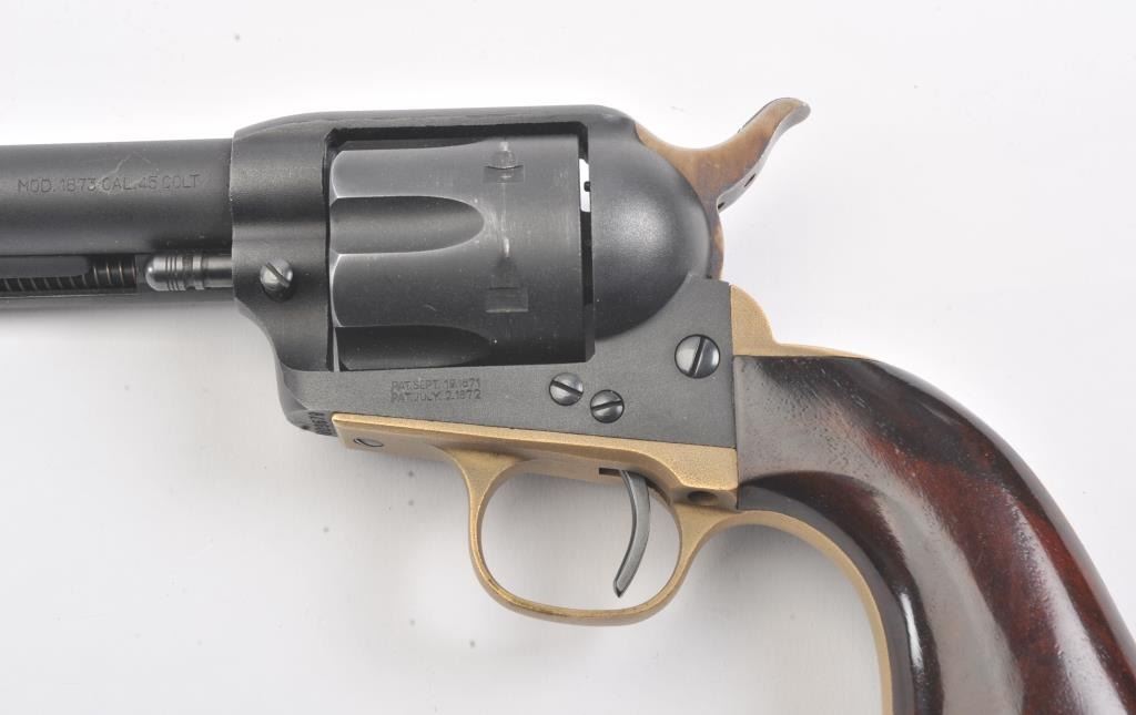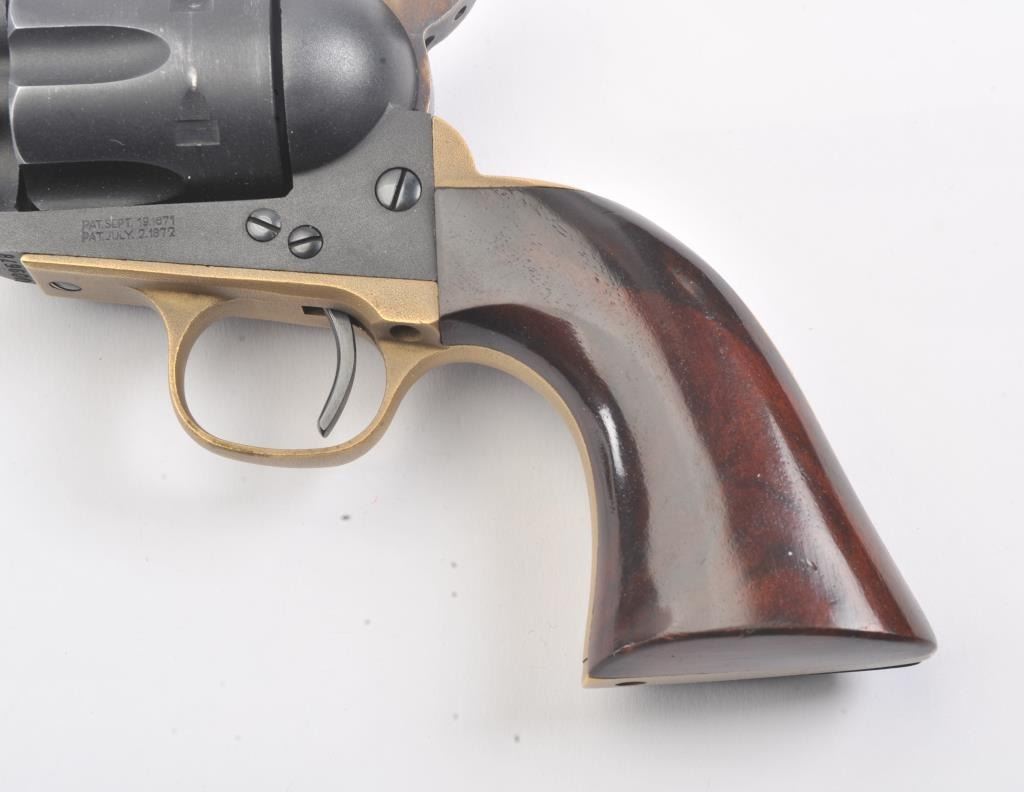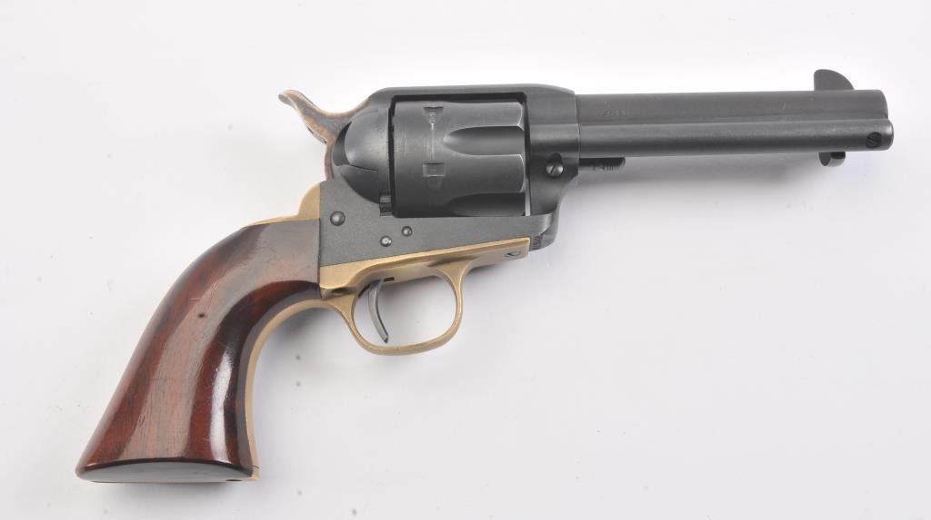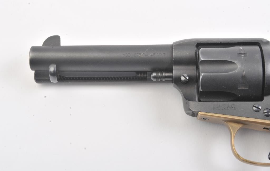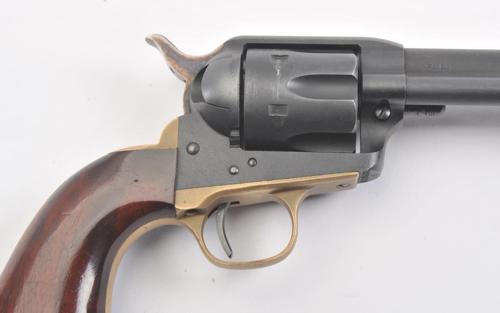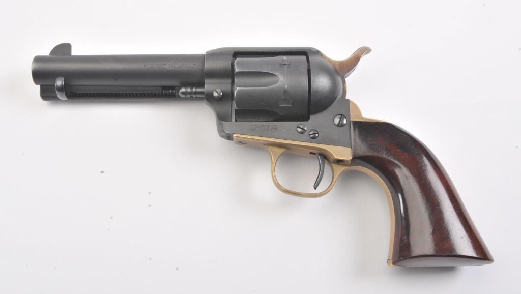 Stoeger Model 1873 SAA by Uberti, .45 Long Colt caliber, Serial #U09678. The pistol is in very good overall condition with a 5” barrel. The pistol retains nearly all of the matte blue finish with wear at the muzzle.The hammer shows muted case colors and the frame is brass. The smooth wood grips are in very good condition. The bore is good, the action is crisp and the markings are sharp. Est.: $250-$500. (Modern/PPT).
