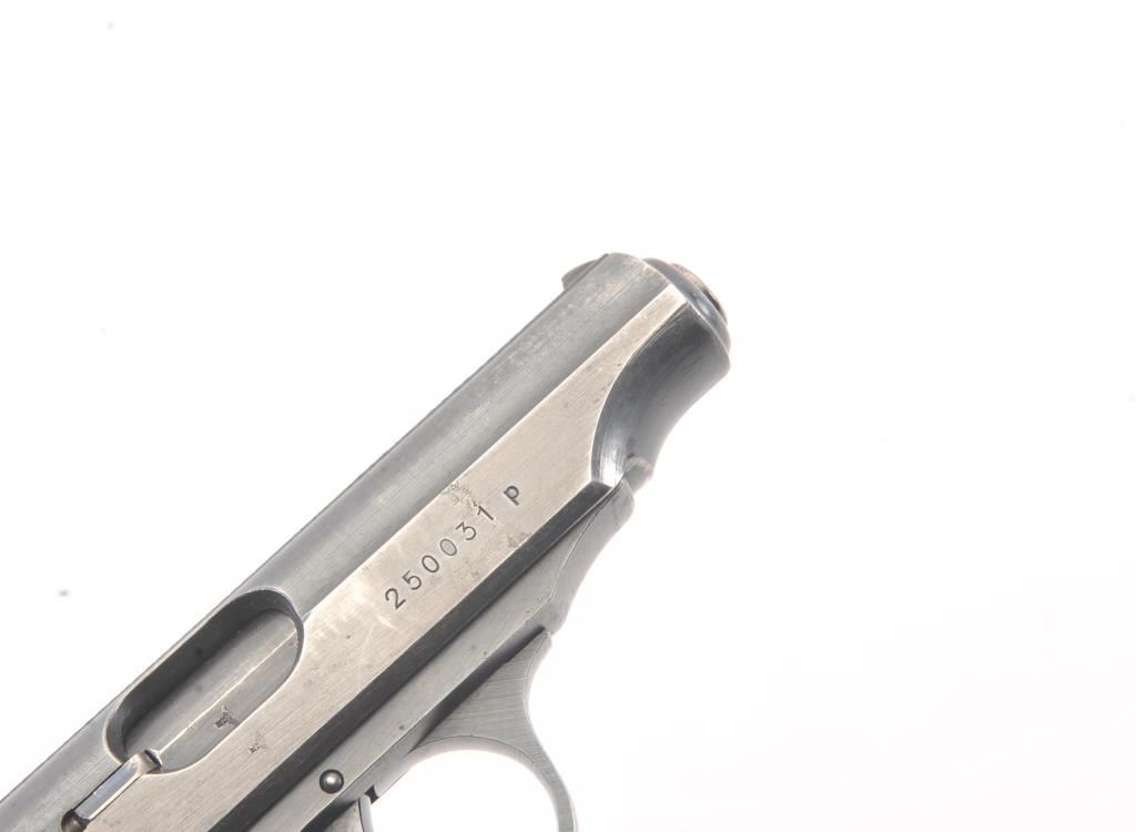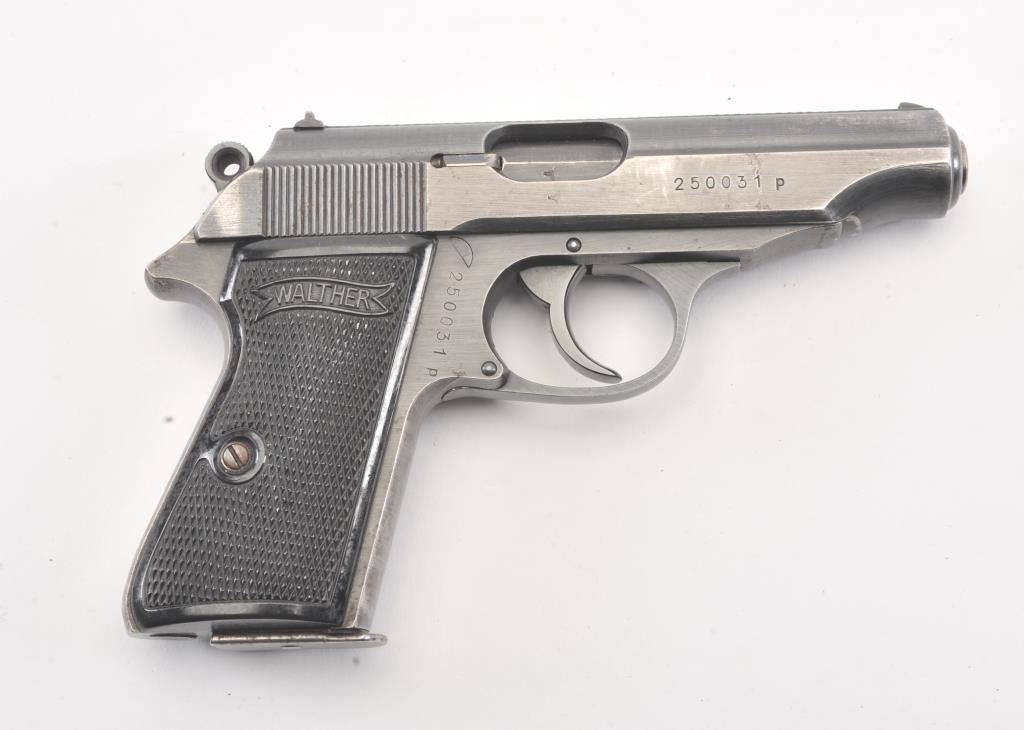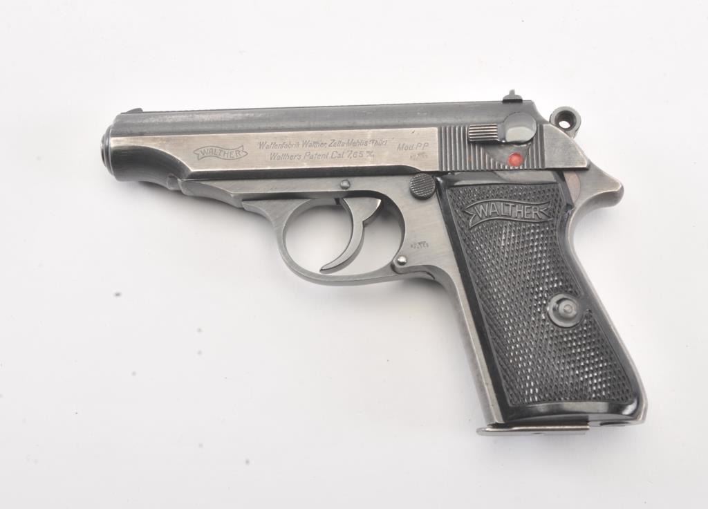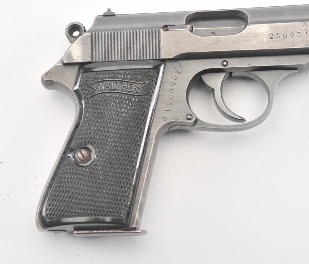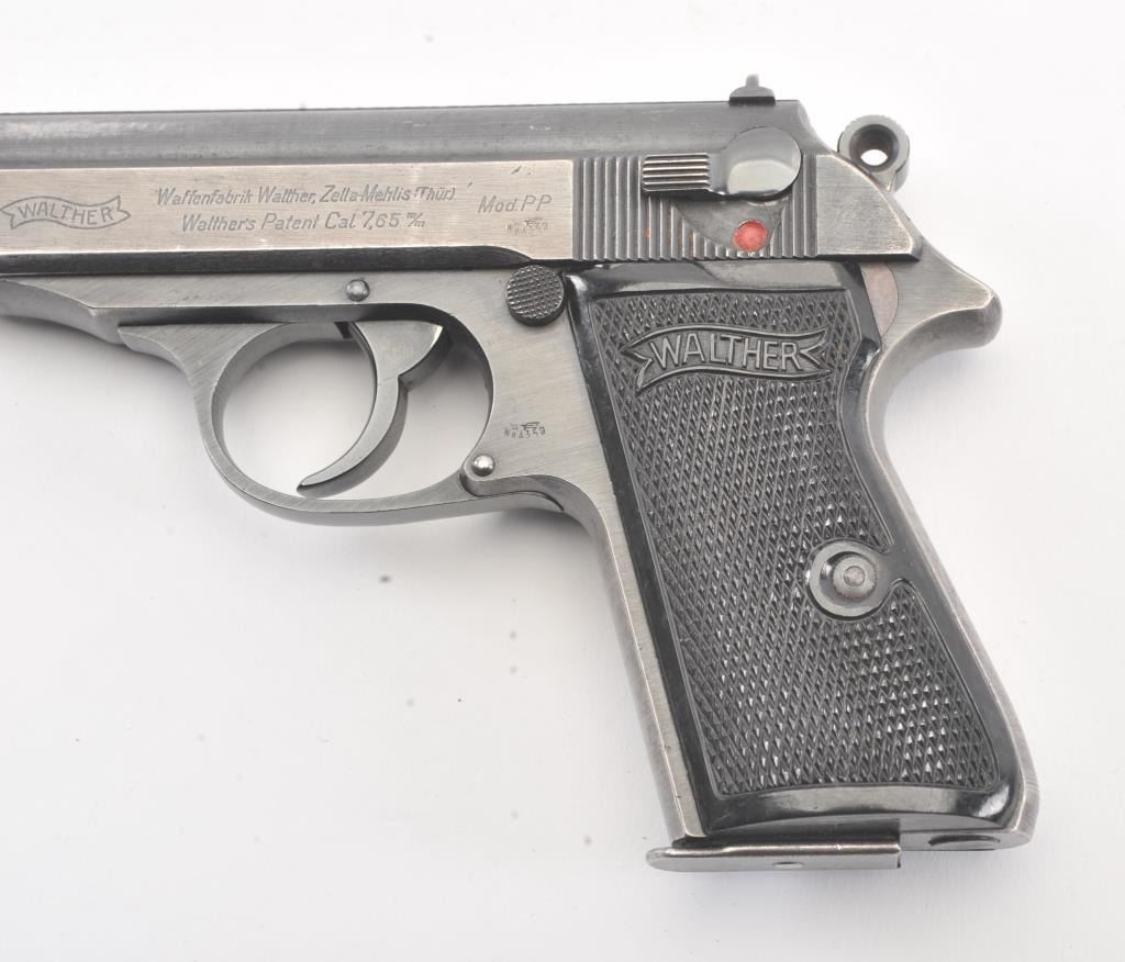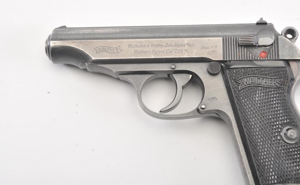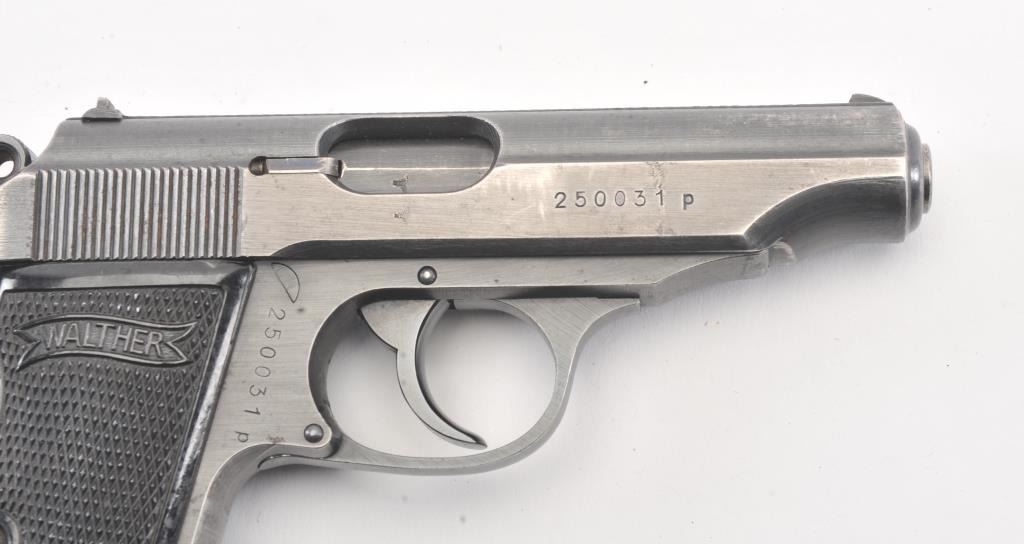 WWII Era Walther PP Semi-Automatic Pistol, #250031p, 7.65 cal., 3.75'' barrel, blue finish, black checkered Walther banner grips. Condition is about fine retaining approx. 92% lightly thinning blue, with most of thethinning to highpoints of slide, front and back strap. Crisp grips and action, very good bore. ''WaA 359'' and ''crown/N'' proofmarks. Includes one correct magazine. (C&R/PPT) Est.: $400-800